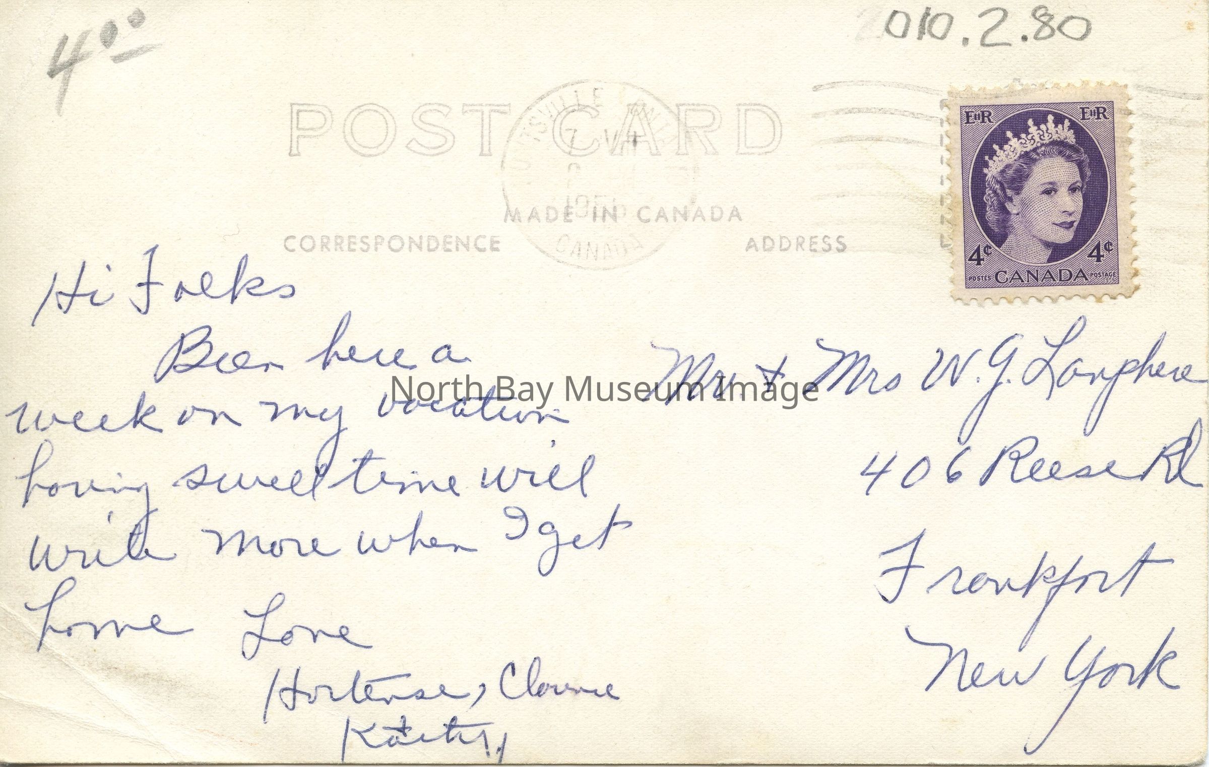 Message: "Hi Folks, Been here a week on my vacation having swell time, will write more when I get home. Love, Hortense, Clarence & Kathy"
