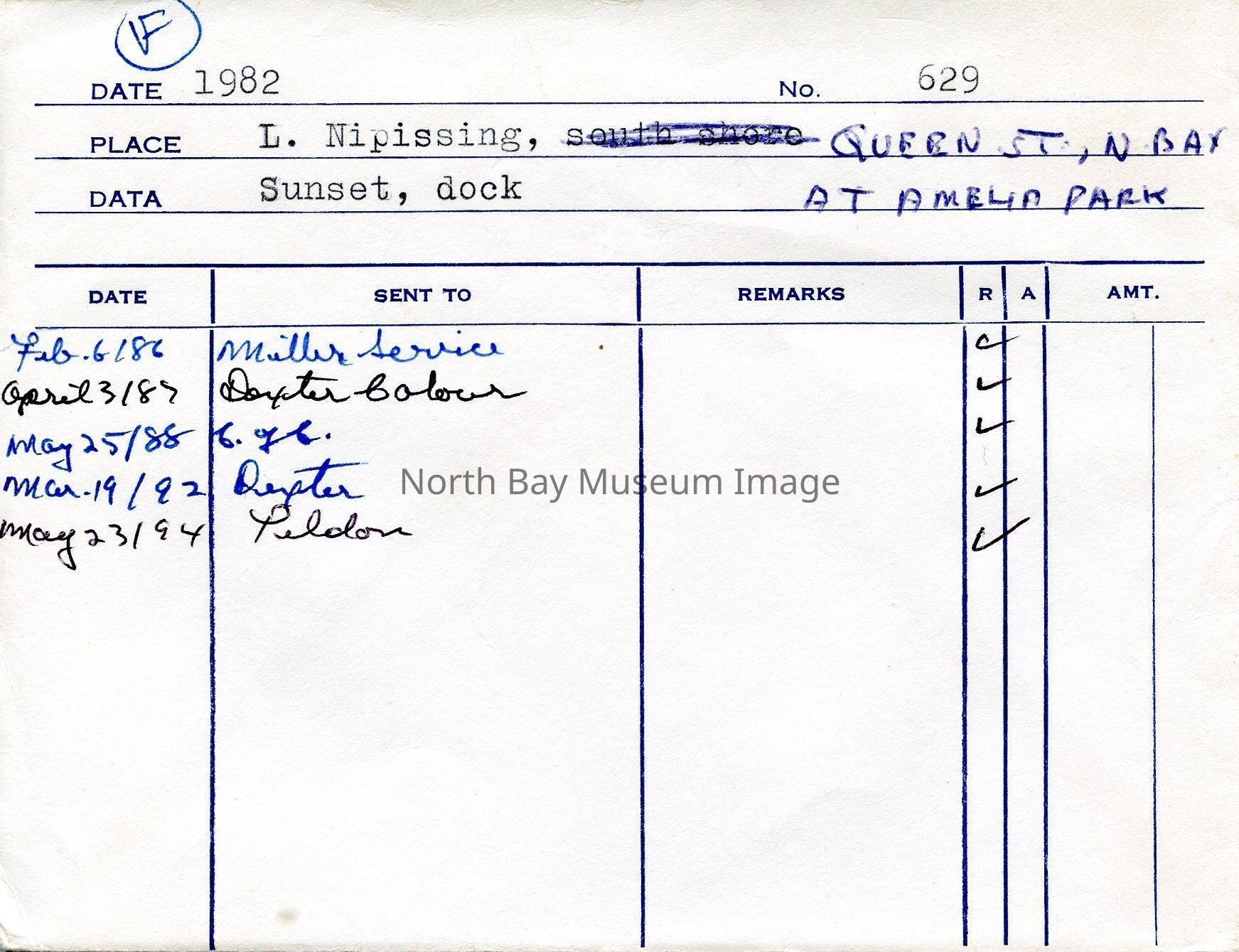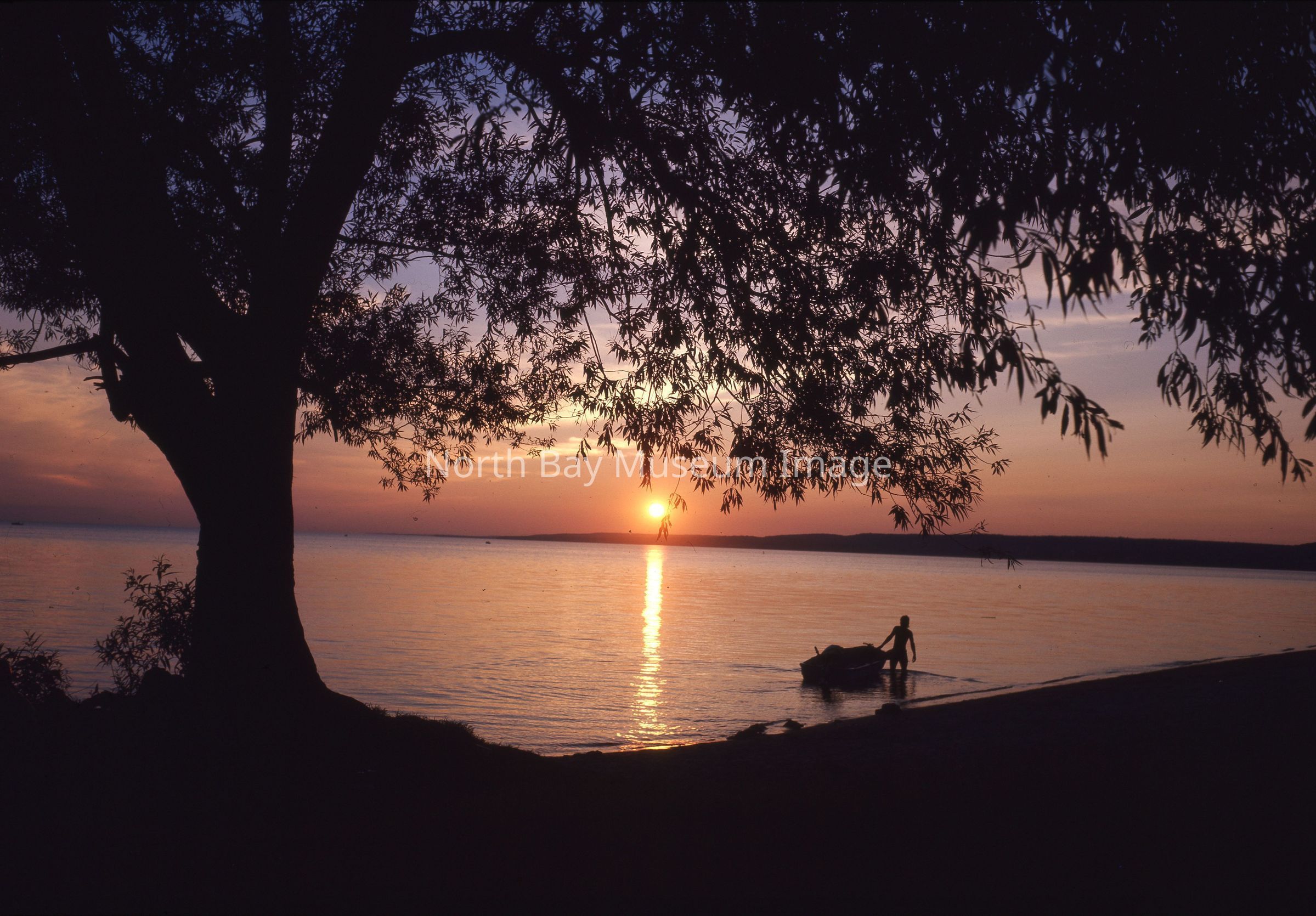 Envelope (a) containing negative (b) of Lake Nipissing Queen Street, North Bay at Amelia Park. The Photo shows a person in the distance in the water with a small boat as the sunsets. Photographer William Forder's original number was 639. Original Publications on the front of envolopeCreator