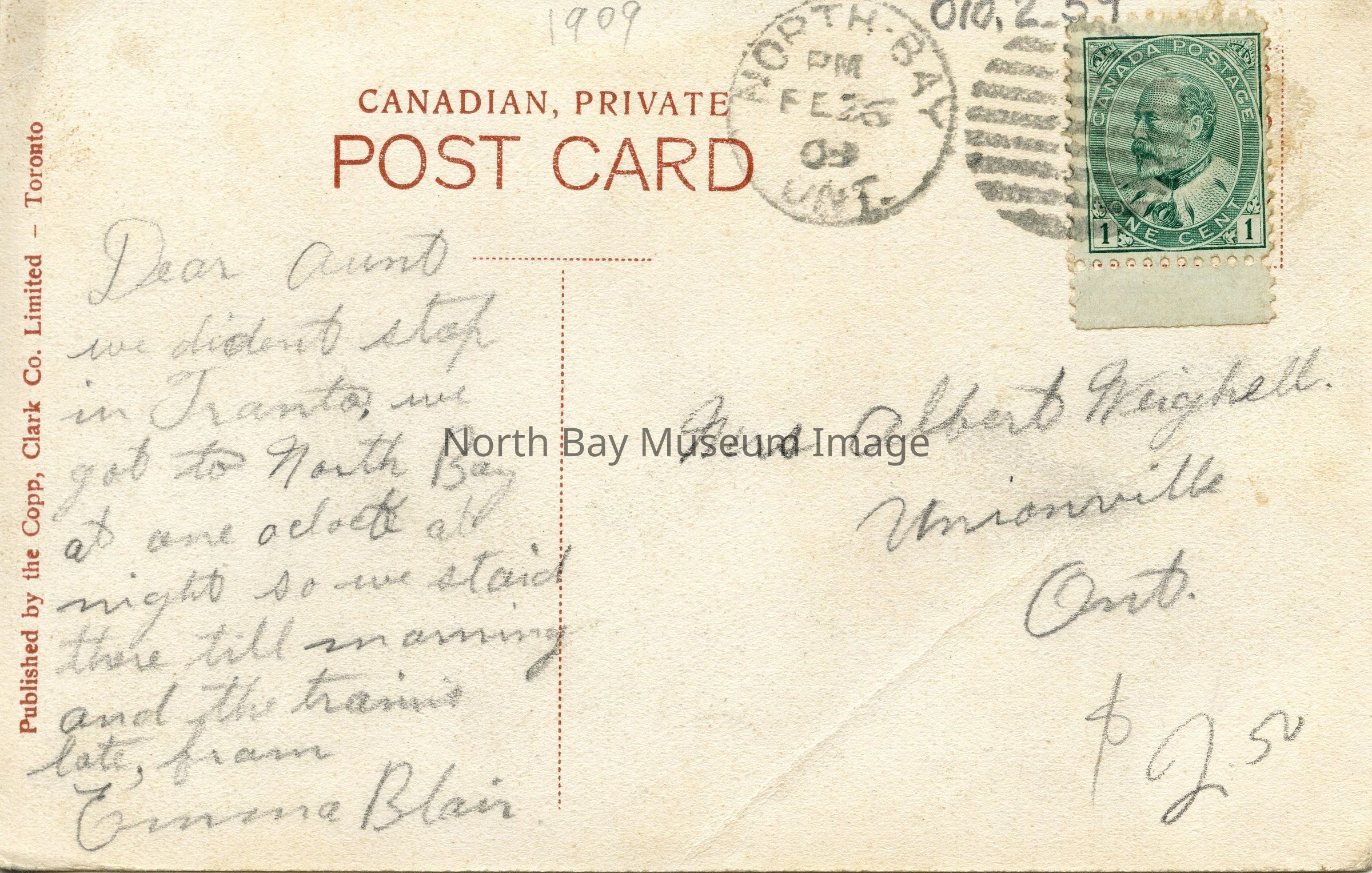 Message: "Dear Aunt we didn't stop in Toronto. We got to North Bay at one o'clock at night so we staid [sic] there till morning and the train's late, from Emma Blair."