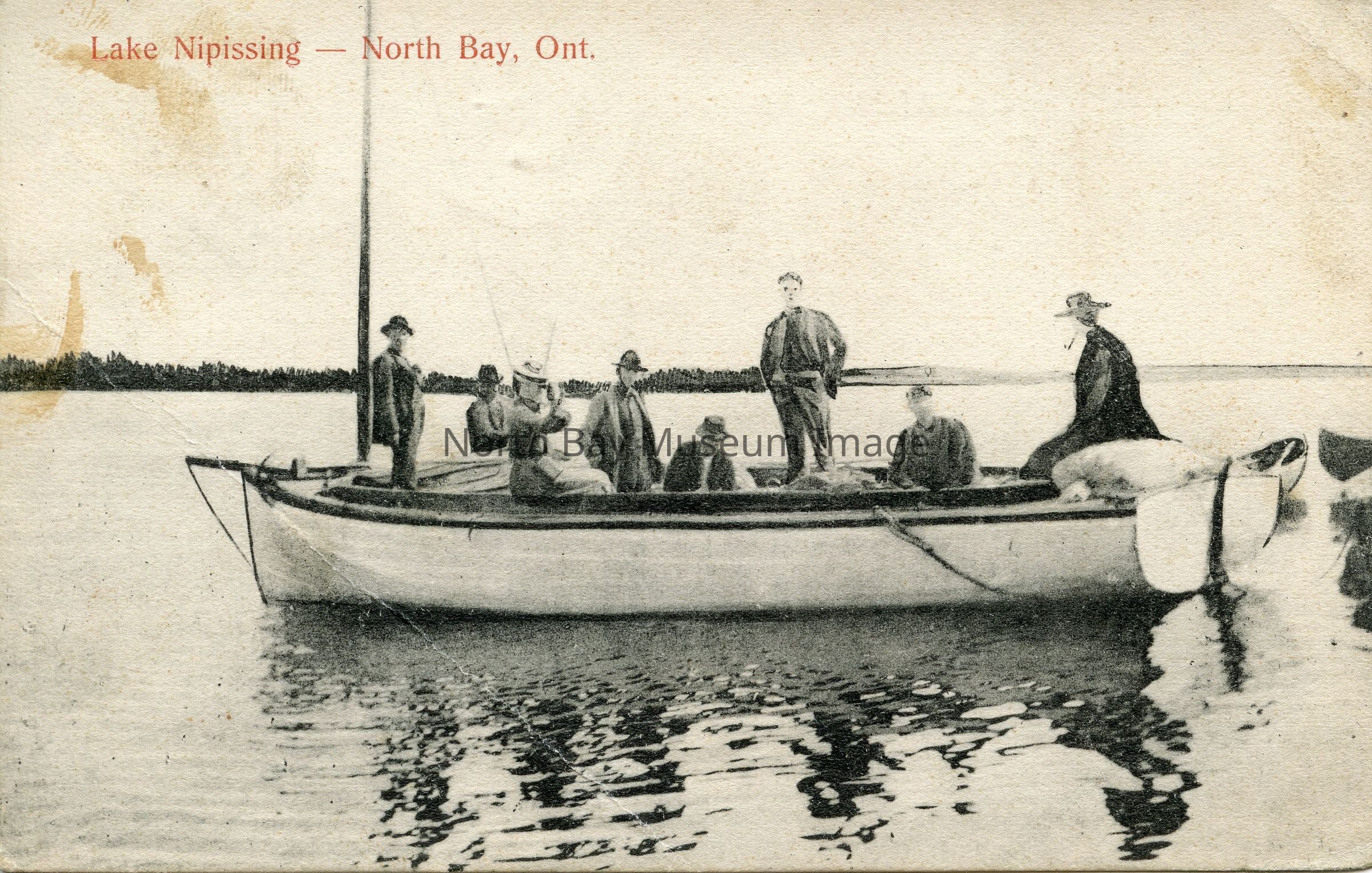 Postcard with black & white photo of 8 people in a sailboat on the lake. All are wearing hats, jackets