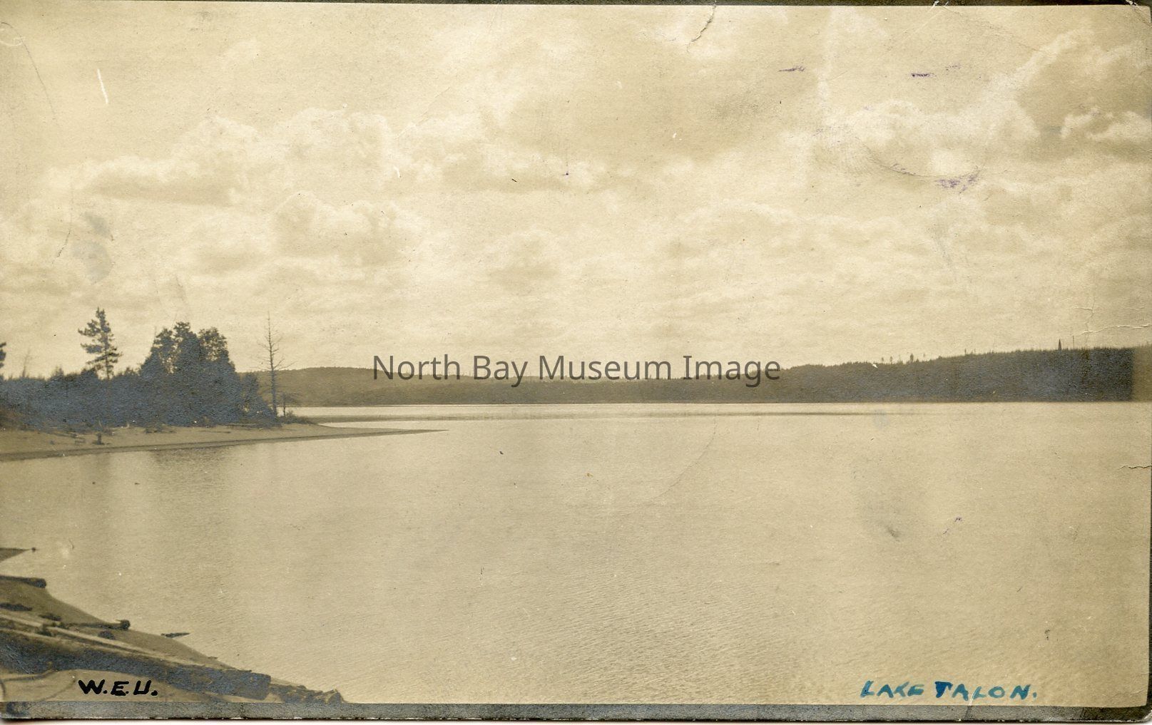 This is a scenic post card of Lake Talon. The waters are very calm. There is a jotting of land with pine trees, and the mainland on the horizon. There are white clouds in the sky. This is an unused post card.