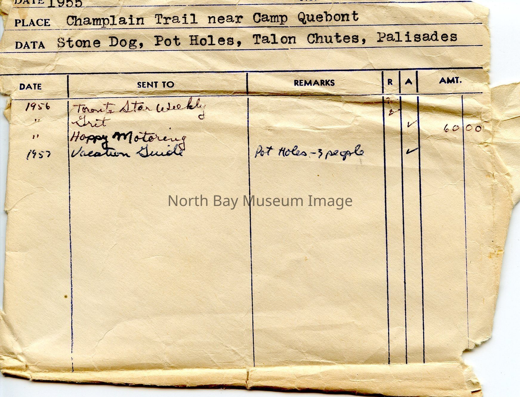 Photographer's Envelope (a) containing series of negatives with description Champlain Trail near Camp Quebont: Stone dog, pot holes, Talon Chutes, Palisades. A part of the William Forder Collection.
