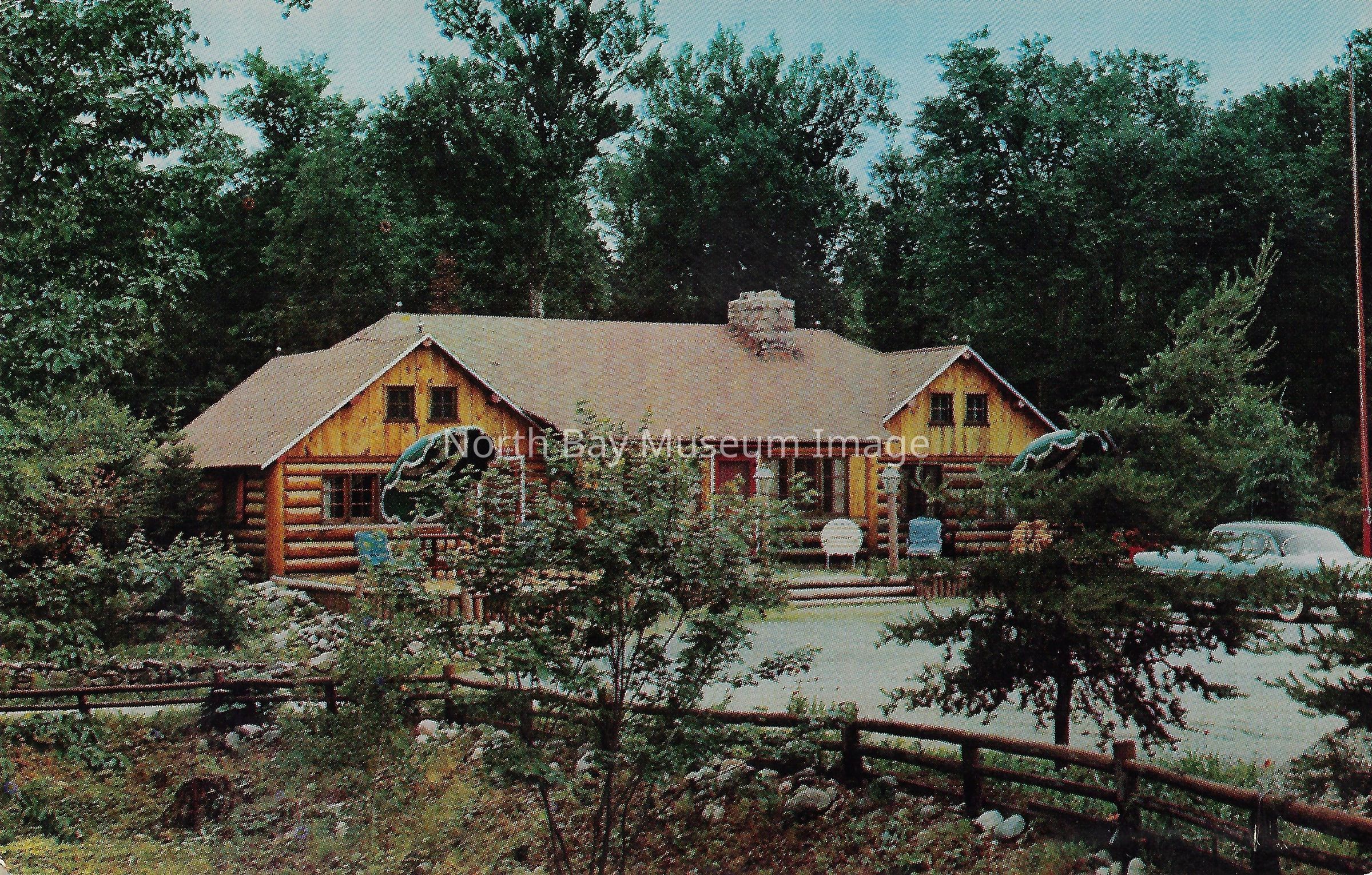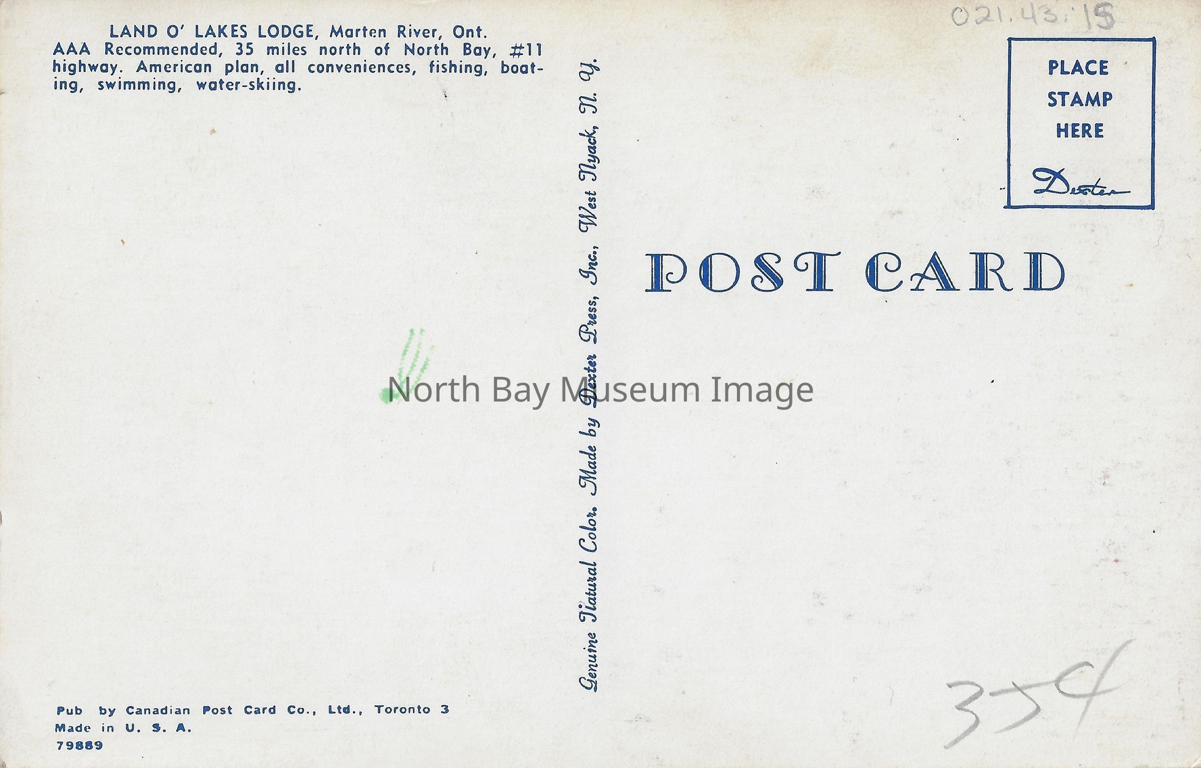 Coloured photograph of Land O'Lakes Lodge in Marten River, Ont. Wooden log cabin with patio chairs infront, as well as a blue vehicle parked in the driveway. A log fence is surrounding the property. Printed on the back is "Land O' Lakes Lodge, Marten River, Ont. AAA Recommended, 35 miles north of North Bay, #11 highway. American plan, all conveniences, fishing, boating, swimming, water-skiing." and "Pub by Canadian Post Card Co., Ltd., Toronto 3. Made in U.S.A. 79889." and "Genuine Natural Color, Made by Dexter Press, Inc., West Nyack, N.Y." as well as a section with "Place stamp here" accompanied by a signature from Dexter.Creator