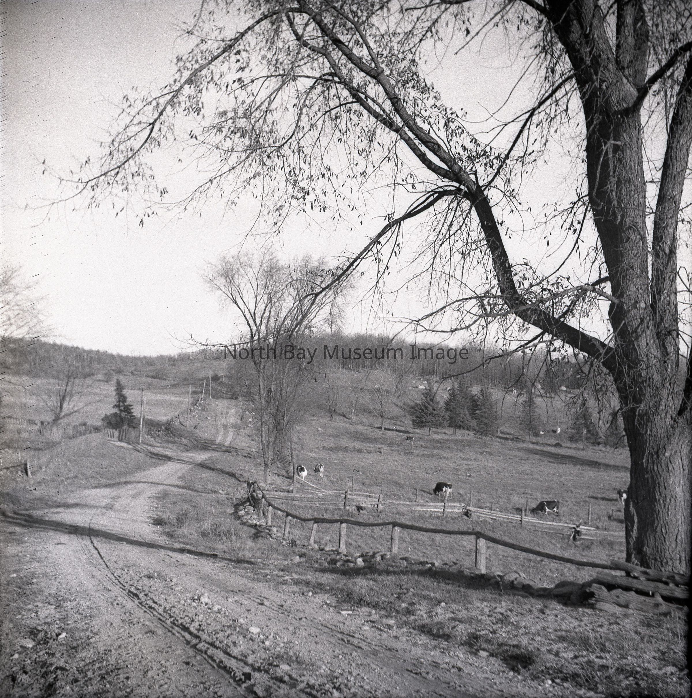Envelope (a) contains the photograph and negative (b-c) a landscape shot of golf course road. The image is of a old dirt road. On the one side of the road there is a farm where you are able to see cows. A part of the Forder Collection. The photographers original accession number is 6F5. All the publications of the images are written on the envelope.Creator