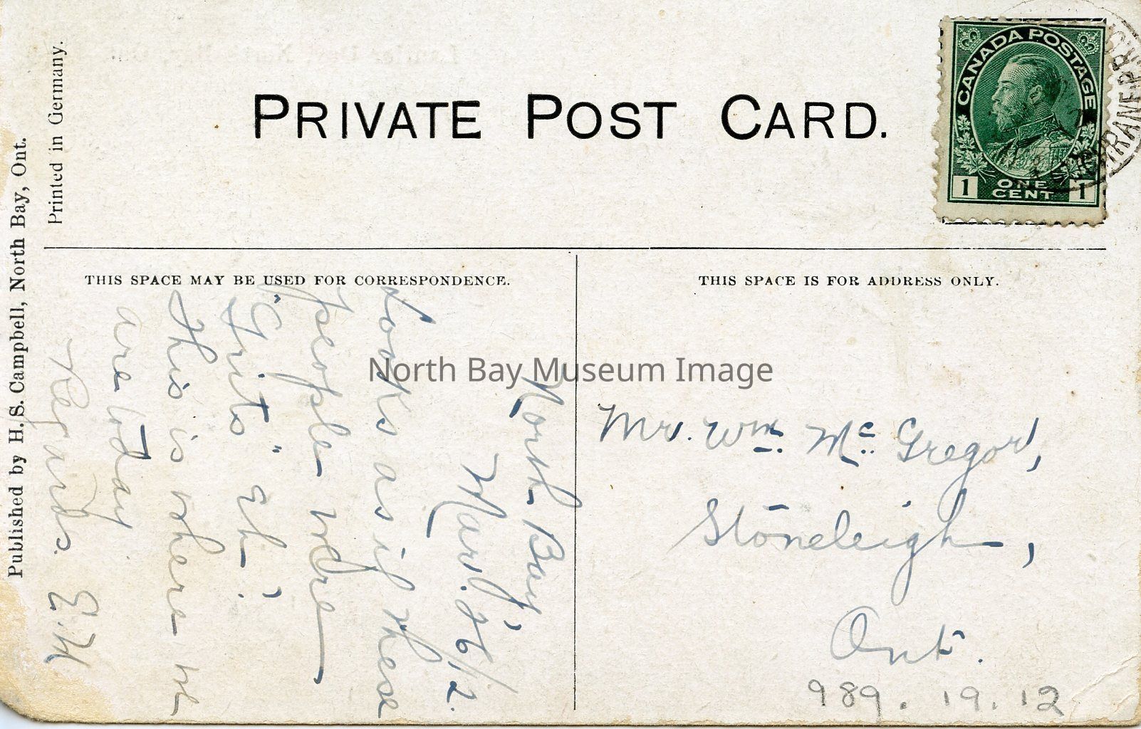 The back of the postcard has a personal message written in black ink. There is a 1cent postage stamp. This postcard was mailed out on March 26, 1912. This postcard was addressed to William McGregor, Stoneleigh, Ont.