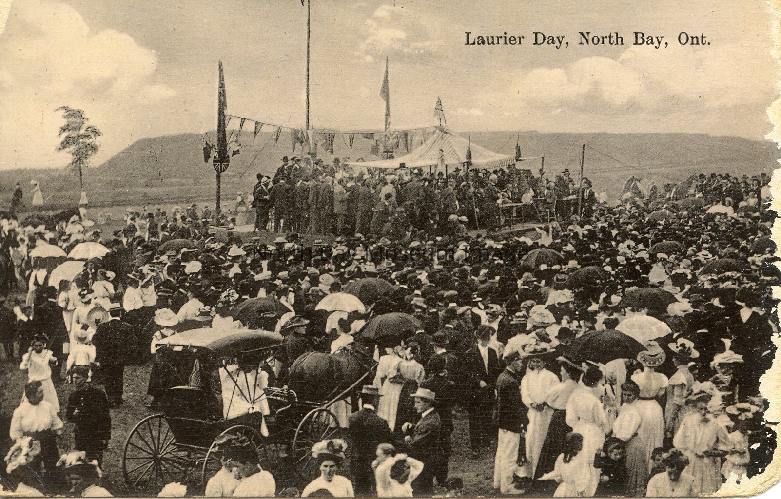 This is a black and white postcard of 'Laurier Day, North Bay, Ont.' The image shows a group of people standing in a group. All the people are dressed in old fashioned clothing. On the stage there is another group of people. On the stage there are flags flying. In the right hand corner there is a horse and buggie. In the background there is a tree on the left hand side. Behind the stage is a mountain.