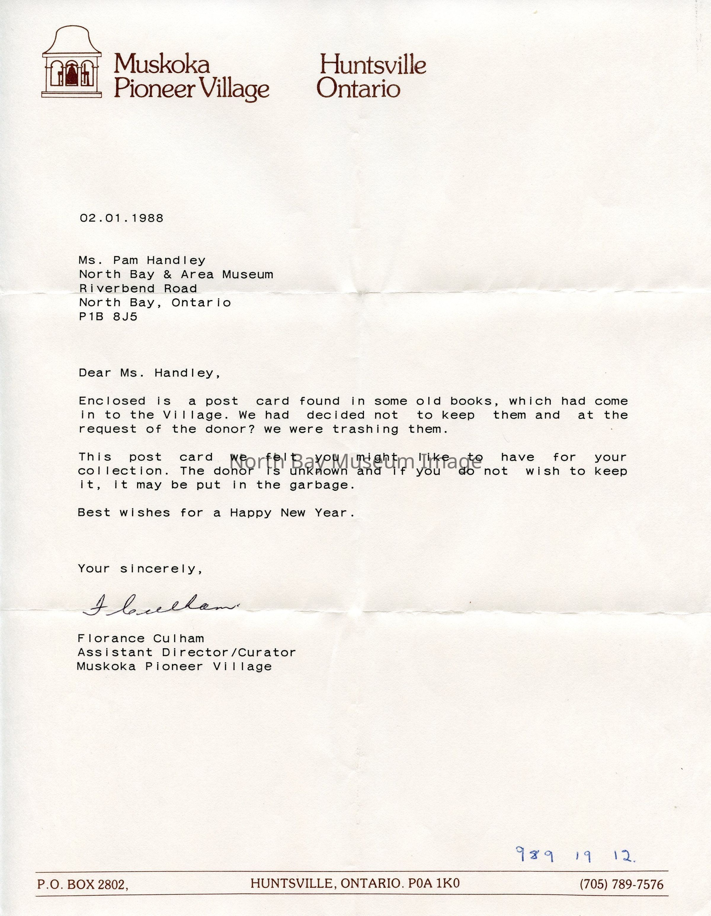 There is a letter attached with the Muskoka Pioneer Museum from Huntsville, ON.