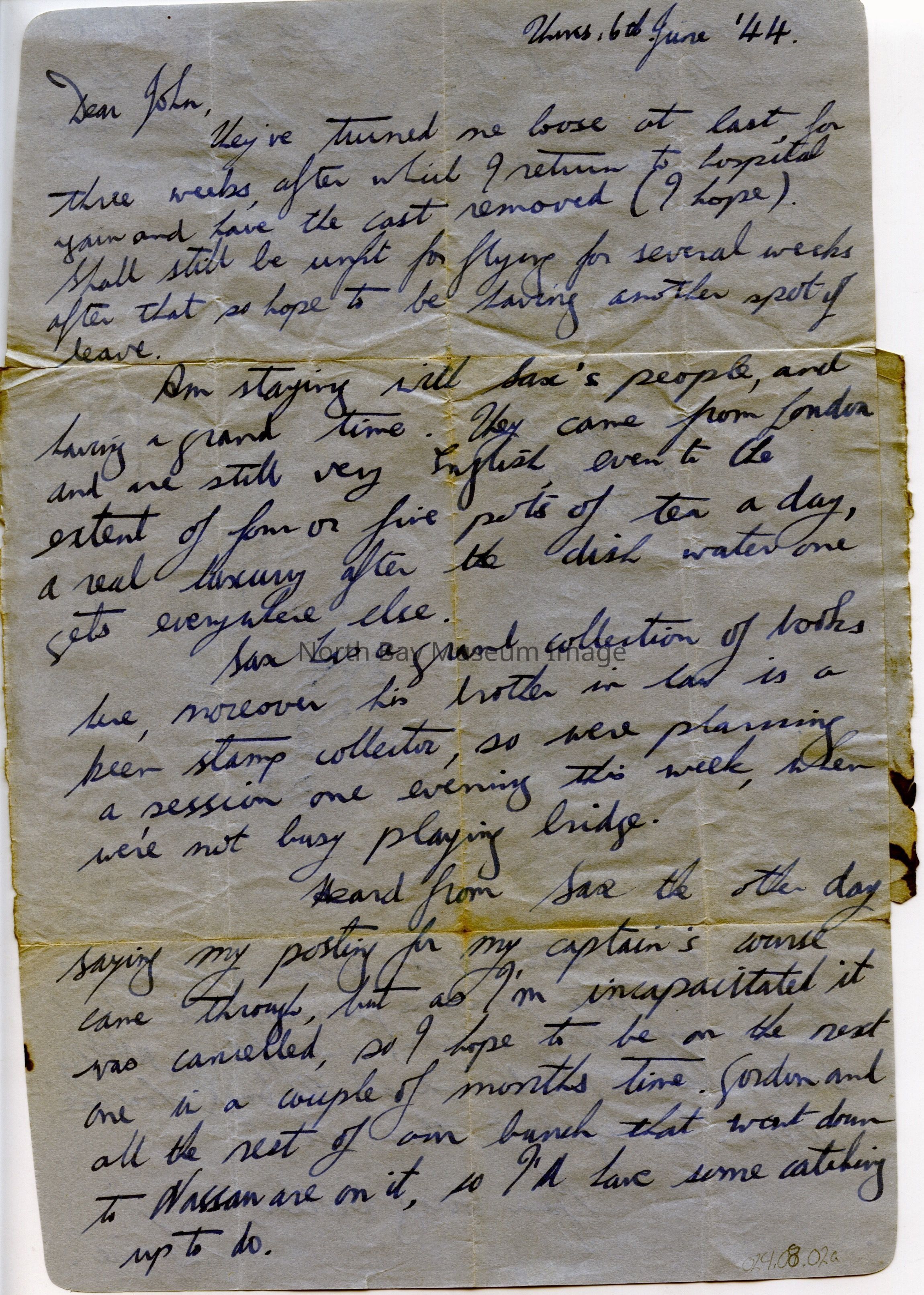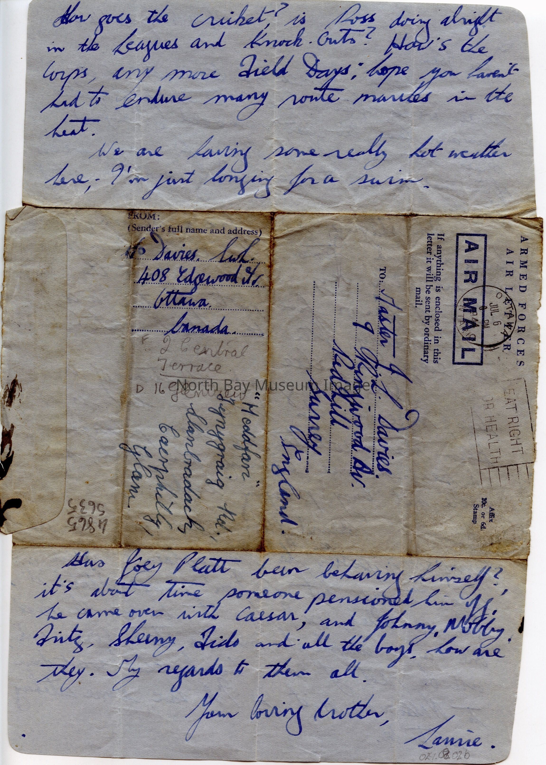 Thurs 6th June '44. On blue paper, Armed Forces Air Letter AIR MAIL (last two words in a box). Handwritten in blue ink. To Master J.L. Davies, 9 Ringwood Av. Redhill, Surrey, England. Dear John. From P/O Davies LWL 408 Edgewood Av., Ottawa, Canada. Also has handwritten text in pencil and in green-blue ink.