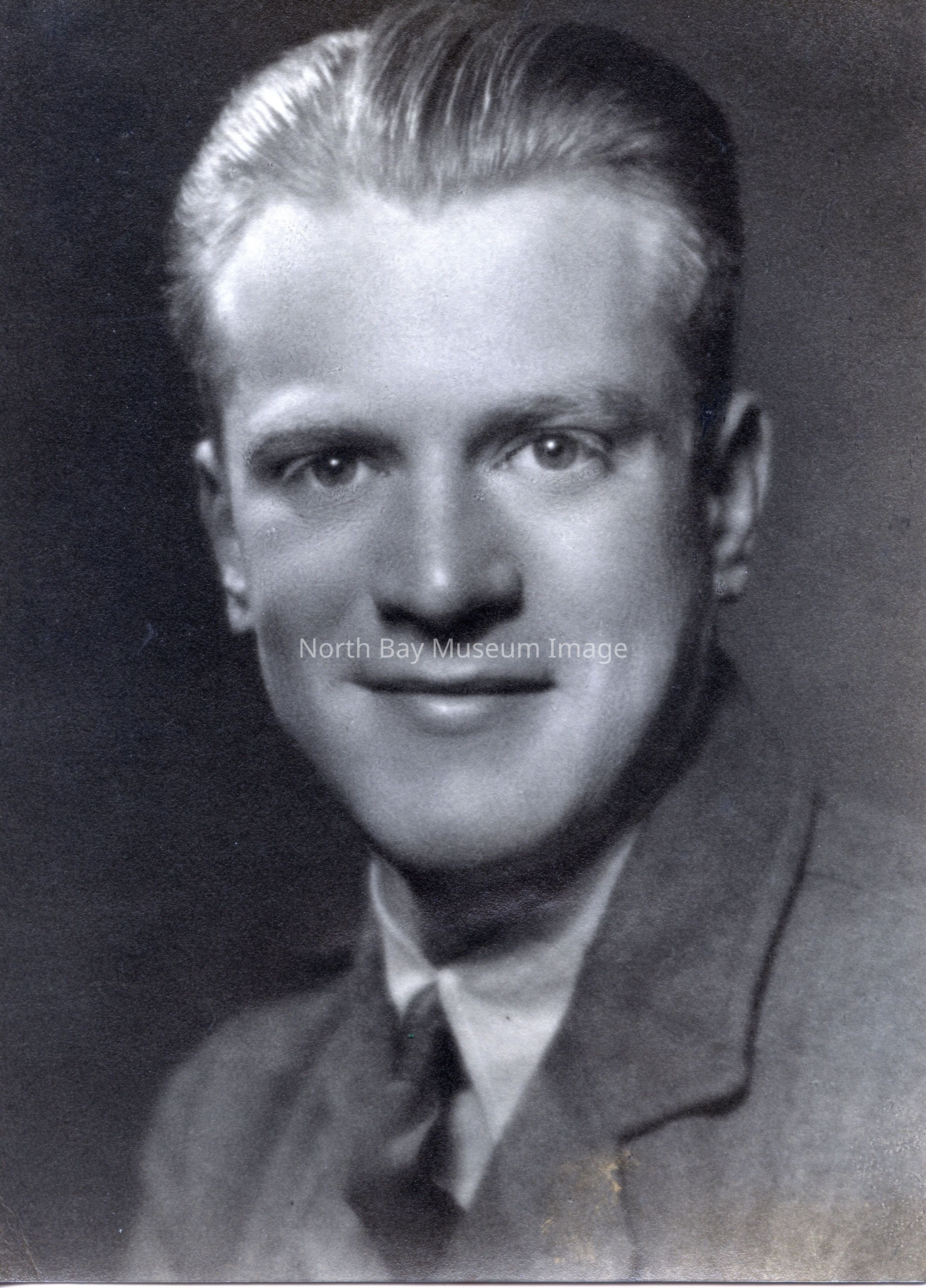 B&W early 1940s. Portrait of L.W. Laurence Davies in civilian suit jacket and tie. PHOTO BACK: yellow and silver smudge, 6 cm tall, where photo was removed from a photo album. Dark red stamped ink, photograph by Alfred F(letter erased)rness Ltd, No. (in pencil) 4434A