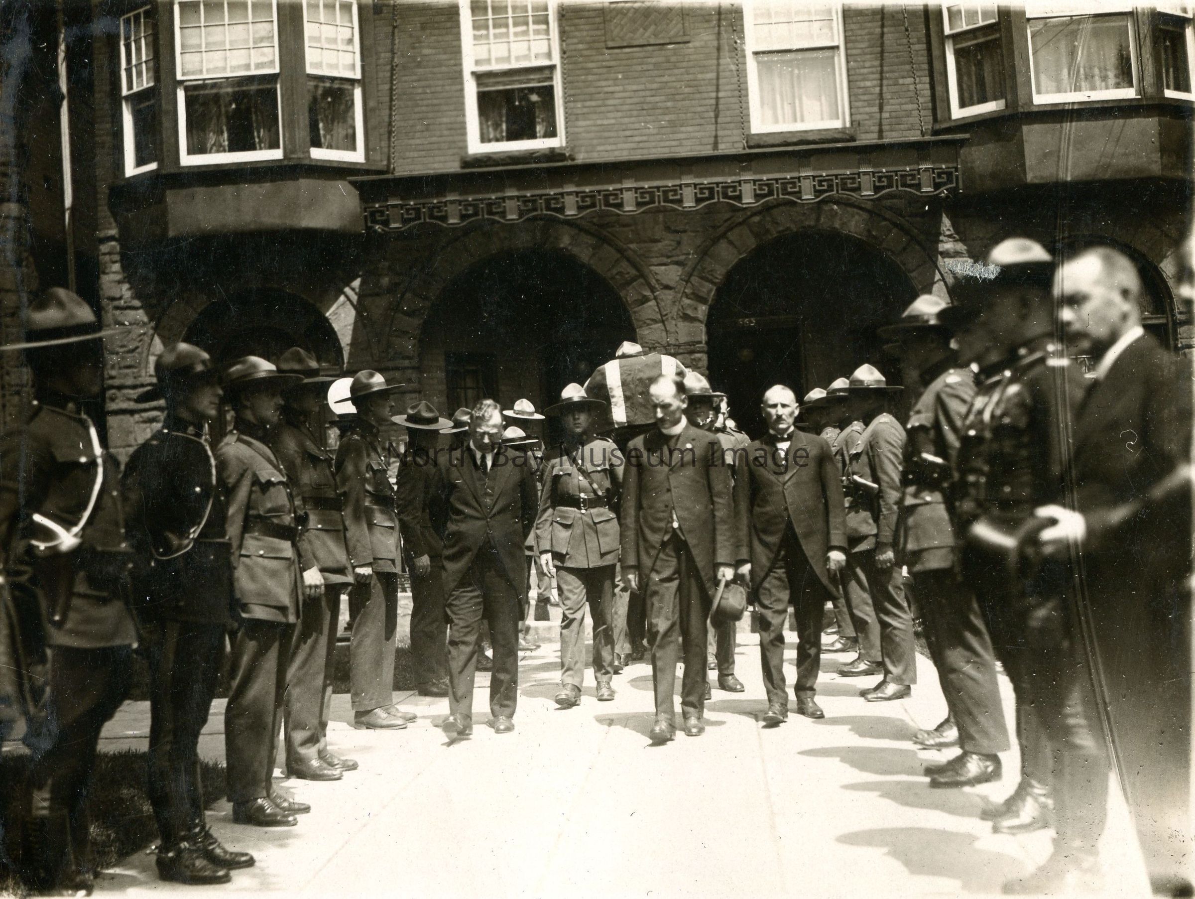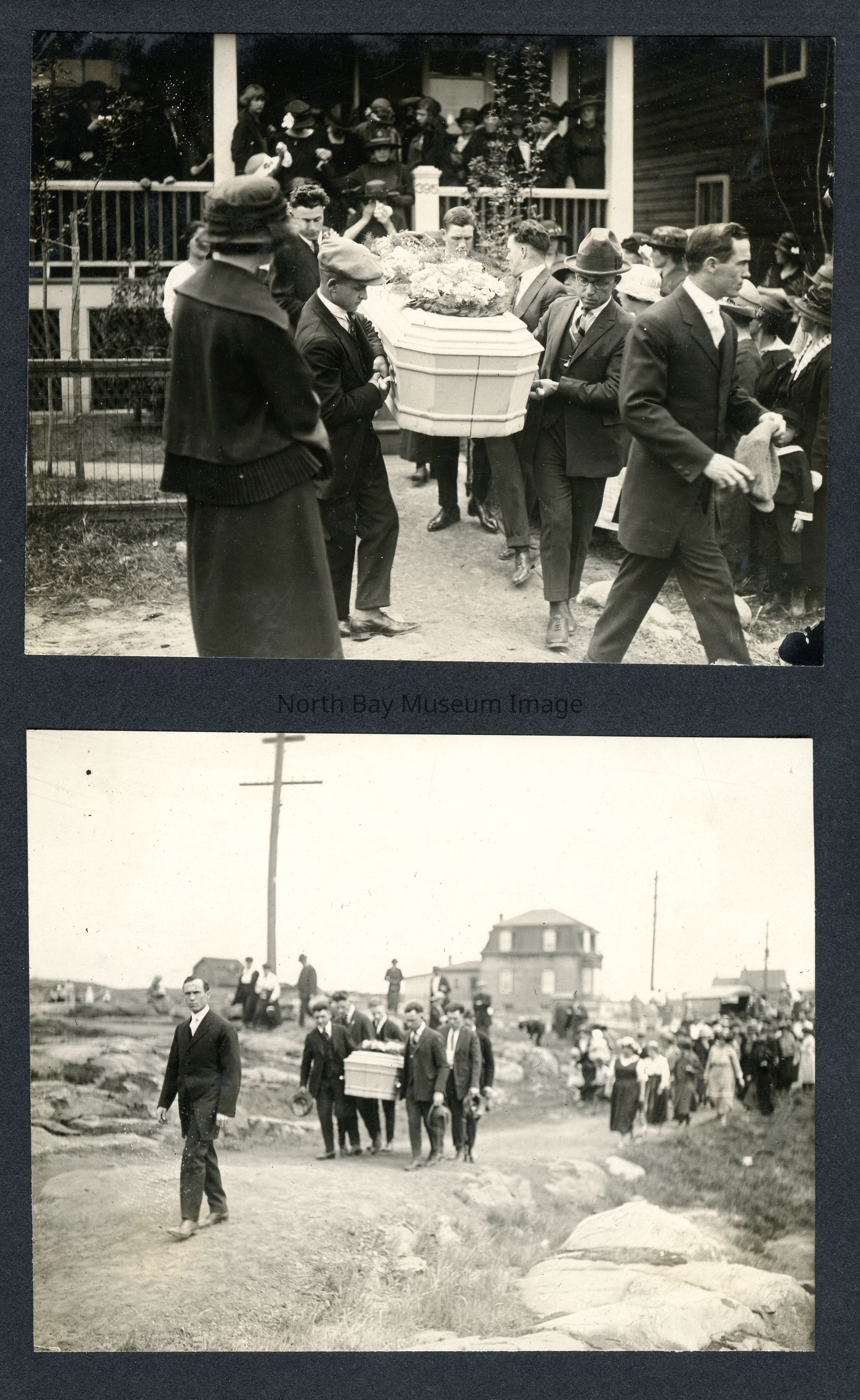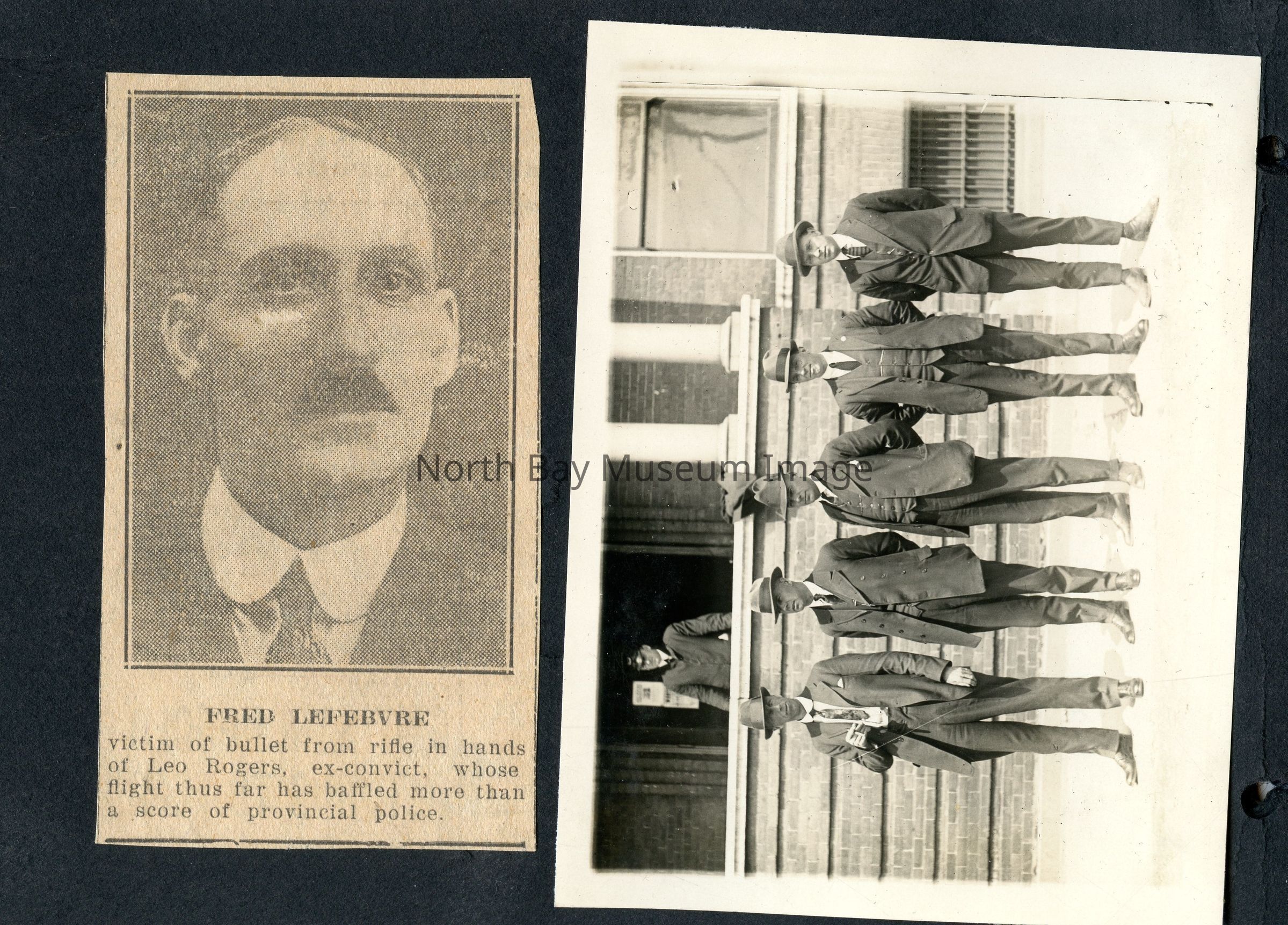 This scrapbook (a) and inserted but loose articles (b) and (c) relate to the Leo Rogers shoot out in 1923. In addition to news coverage of the events, scrapbook also includes original photos from what appears to be Urquhart and/or Fred Lefebvre's funeral.