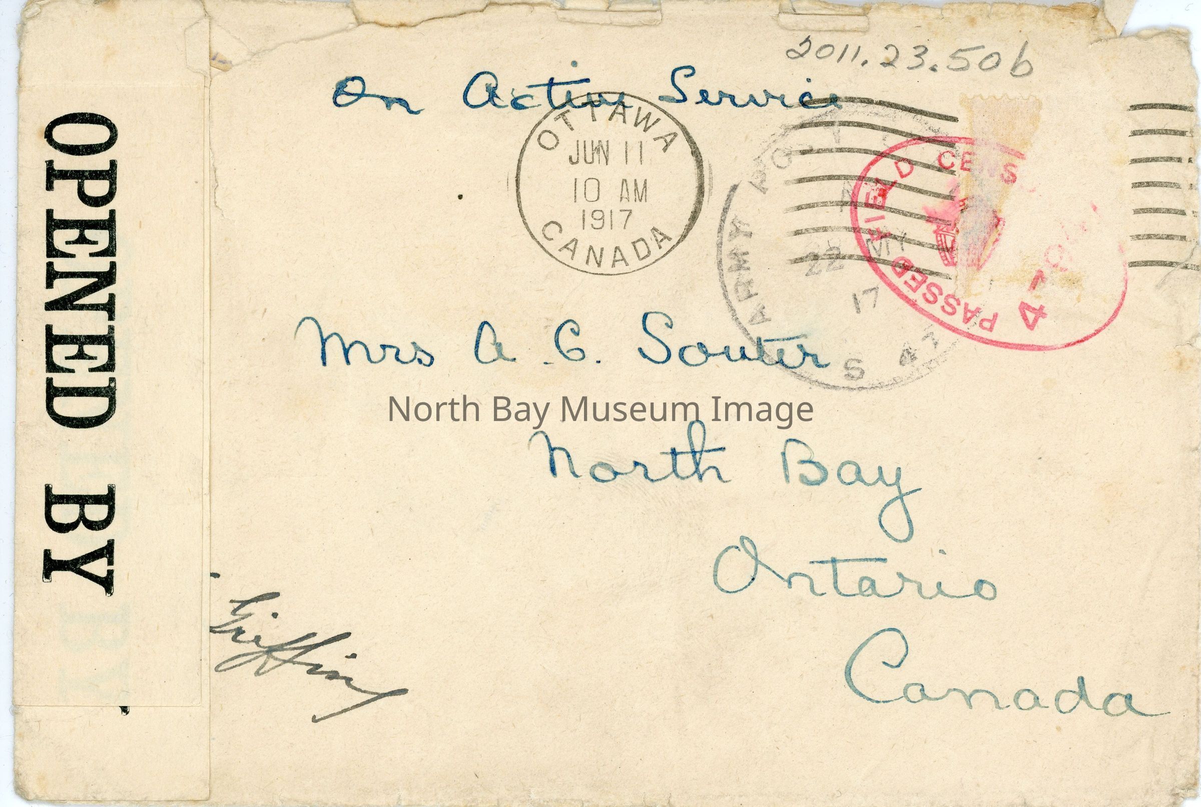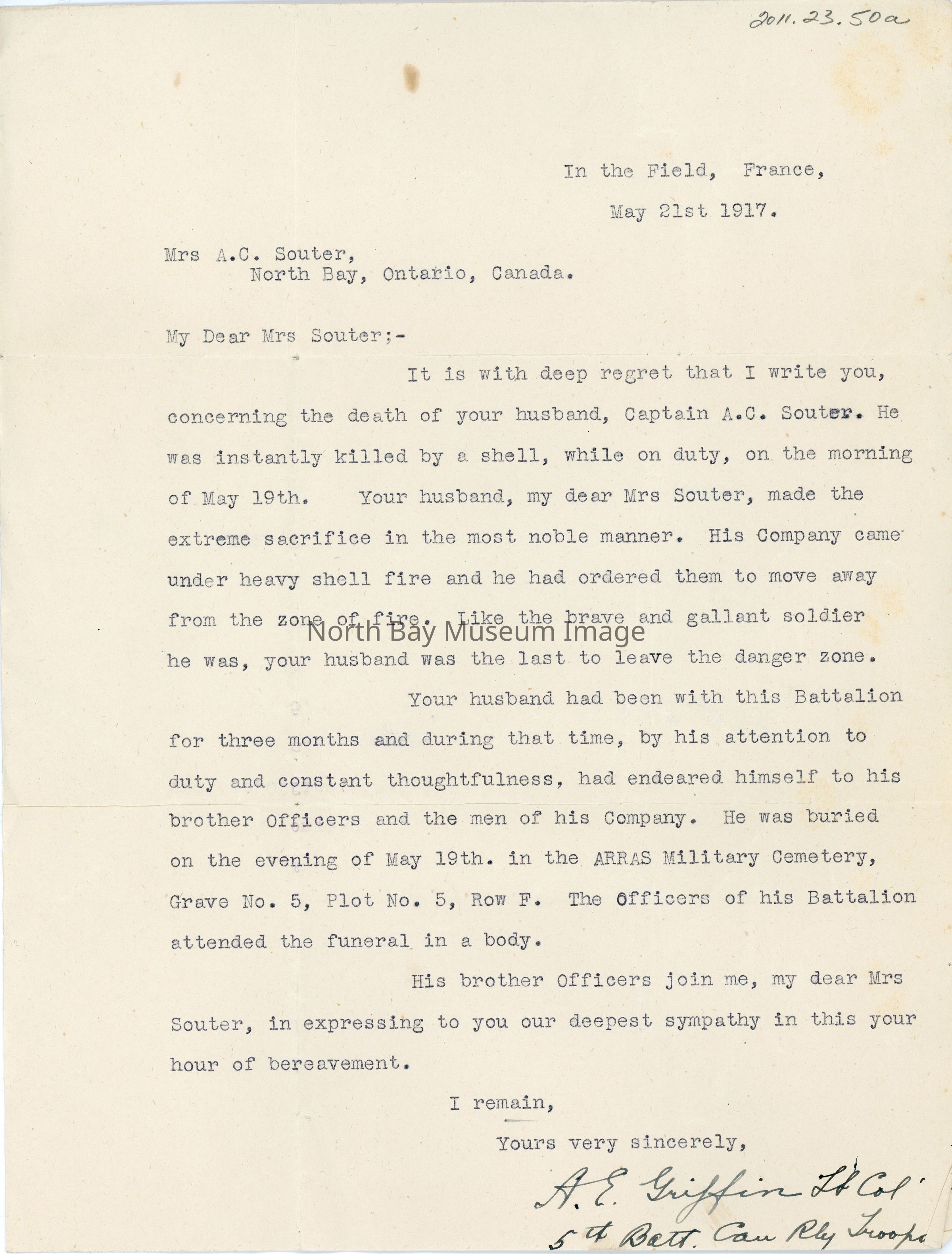 a- Letter addressed to Mrs. A.C. Souter North Bay Ontario dated May 21, 1917 from Lt. Col Griffin 5th Batallion Canadian Railway Troops expressing regrets on the death of Capt. Souter. Also says that he was buried May 19th in Arras Military Cemetery Grave No. 5 Plat No. 5 Row F.
