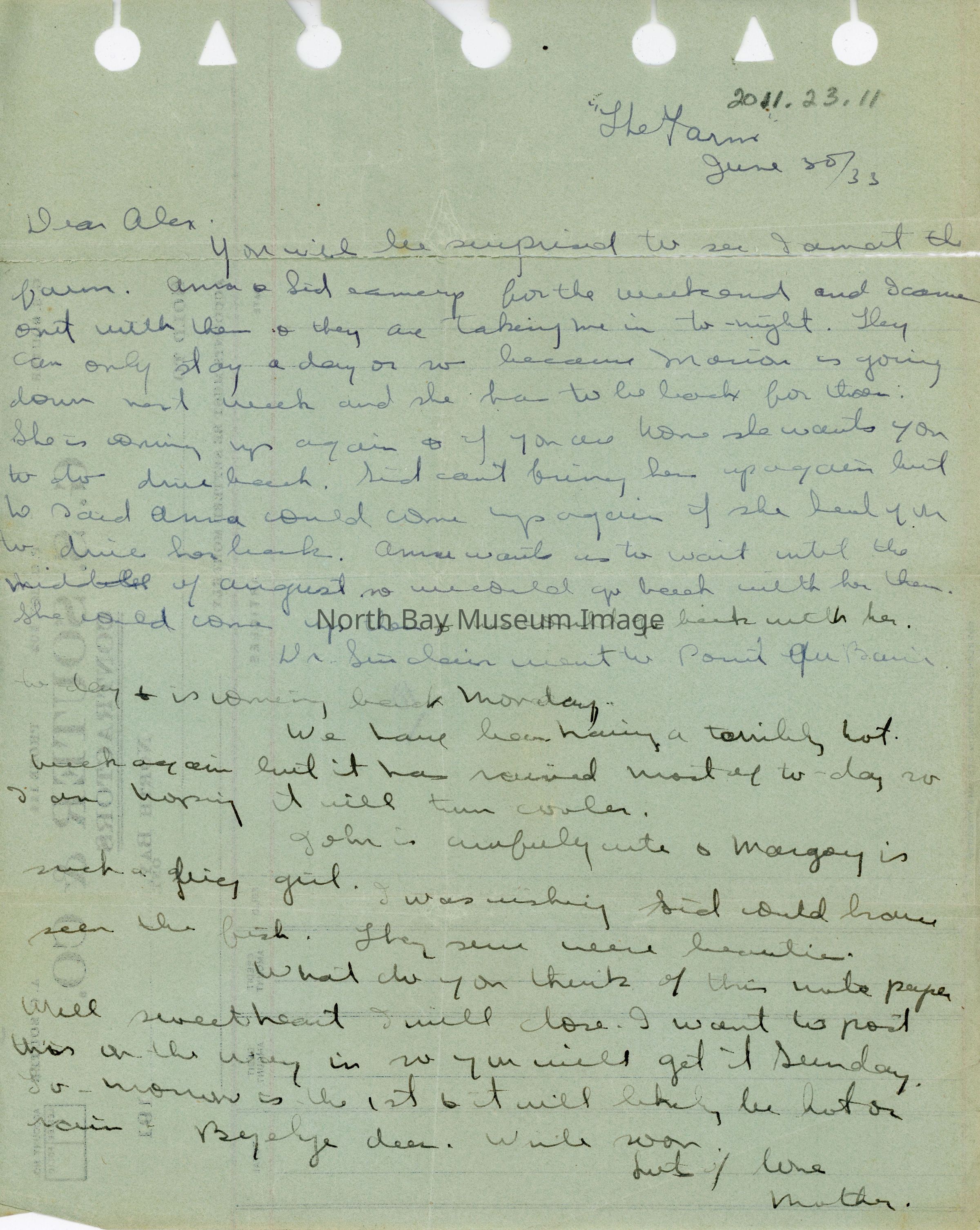 Letter from Alexander C. Souter's mother writing from the Farm. The letter is dated to 1933, though the stationary matches the letters written during the First World War. Since Alexander died in the First World War, the date must be incorrect or written to a different Alex Souter.