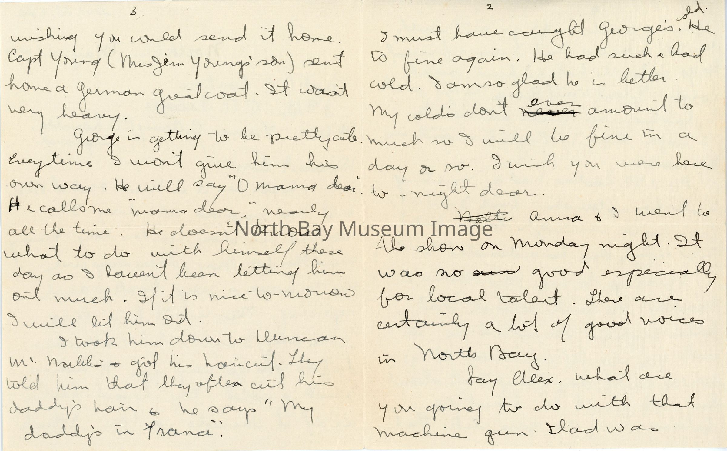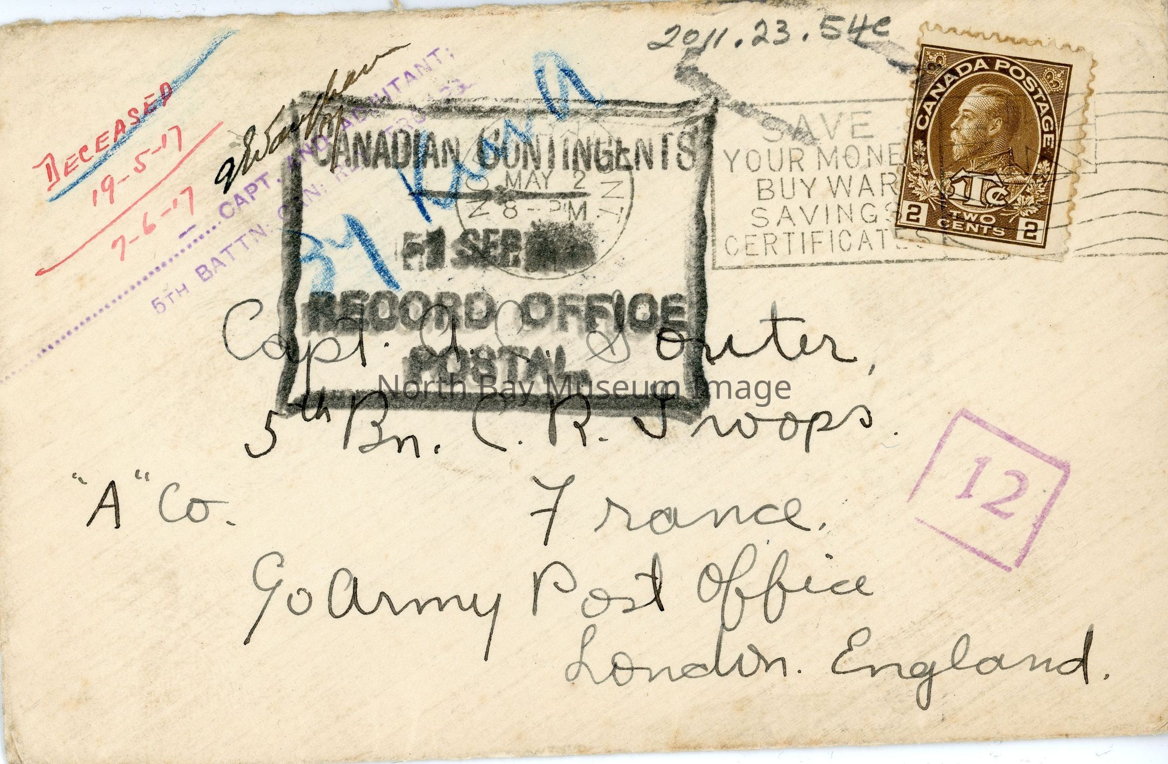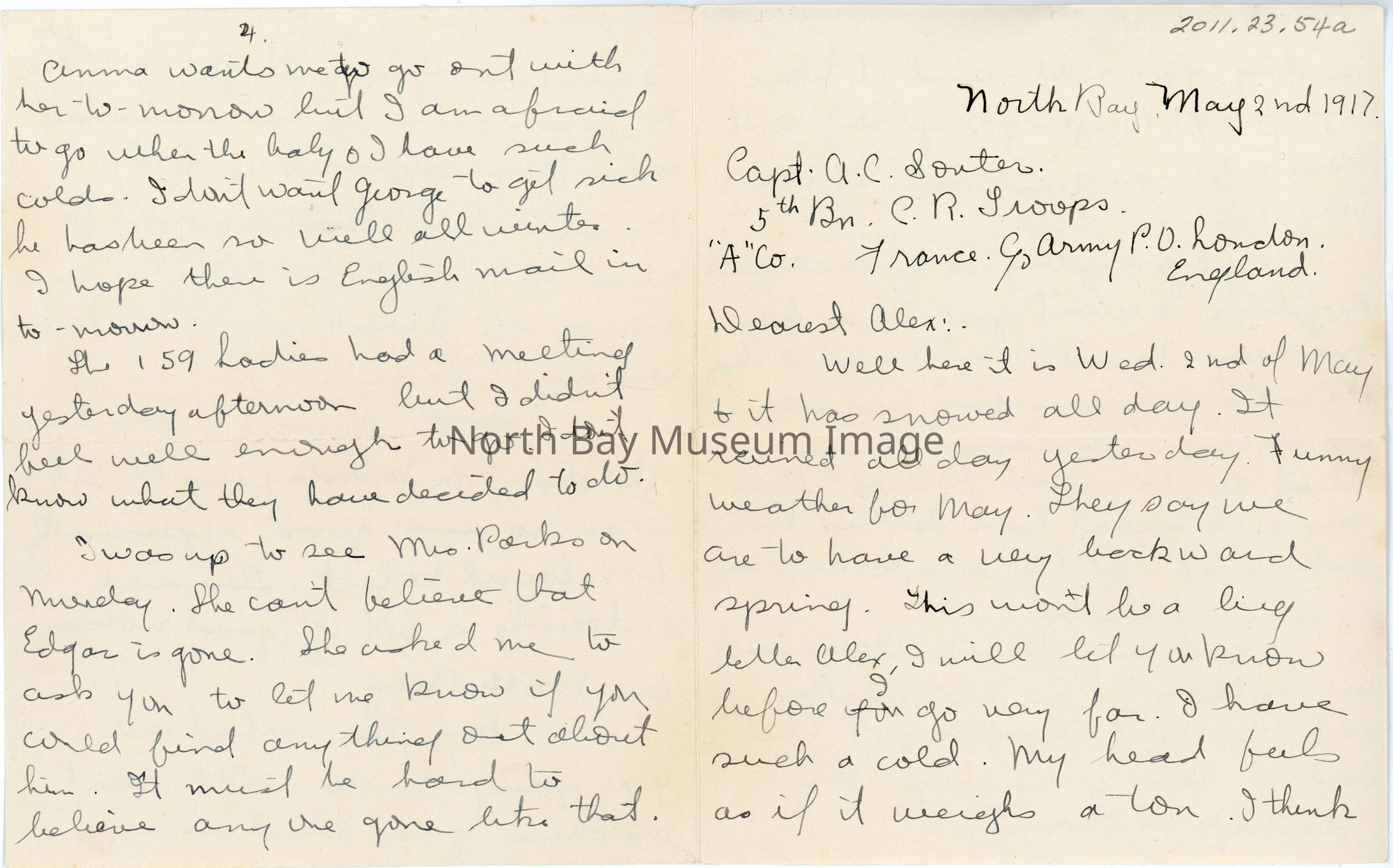 a-b 2 page letter to Capt. A.C Souter P.O. London England dated May 2, 1917 from his wife Flo.