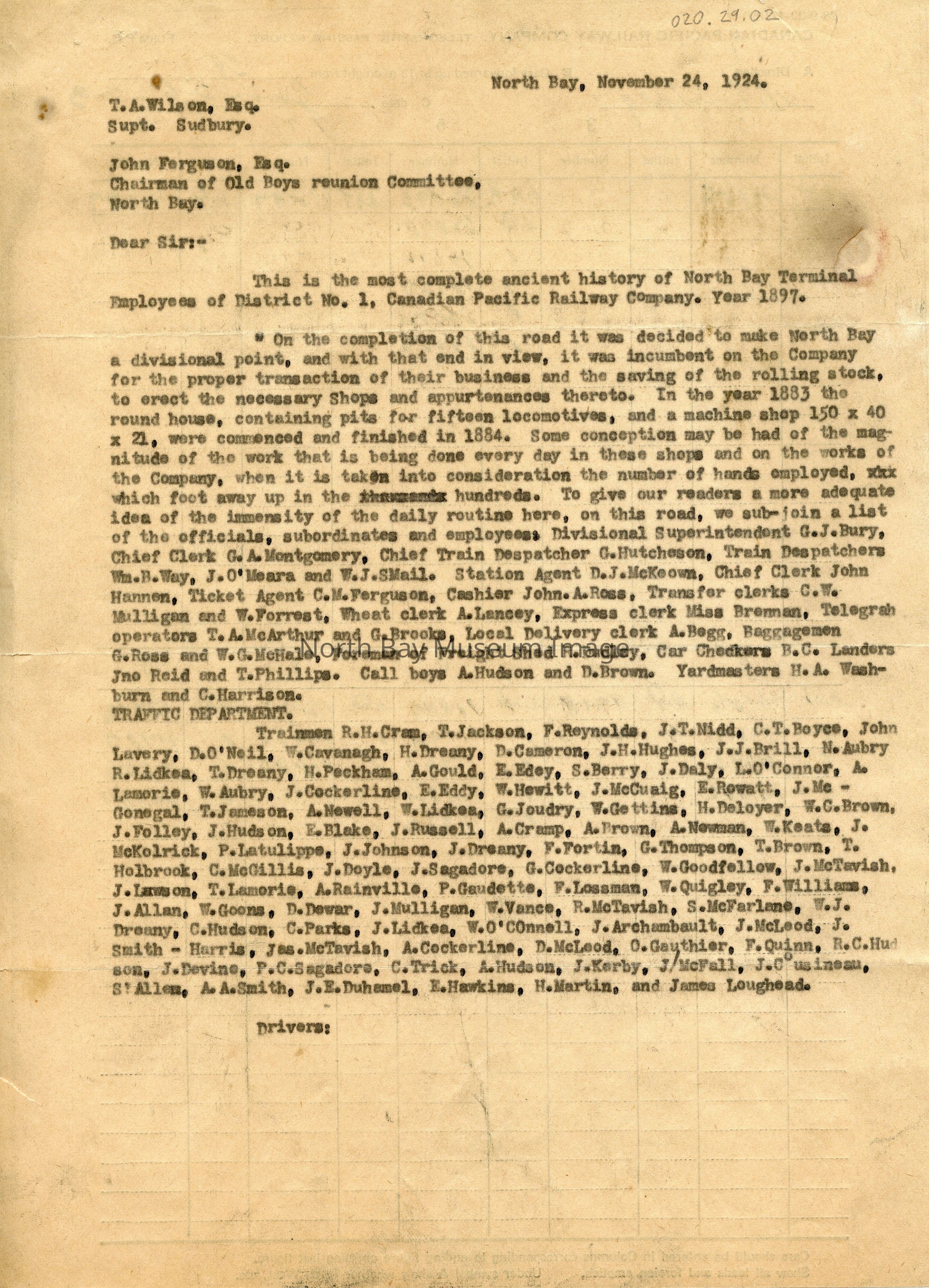 This letter was written to John Ferguson in advance of Old Home Week (Also known as the Old Boys Reunion) which took place in 1925. The letter contains a brief history of the Canadian Pacific Railway which would have been used to create the Old Home Week Souvenir booklet. "This is the most complete complet ancient history of the North Bay Terminal.." The letter goes on to talk about the construction of outbuildings, yard masters, train despatchers, trainmen, etc. The letter appears to have been written on scrap paper as the alternate side is a telegraphic passing report.