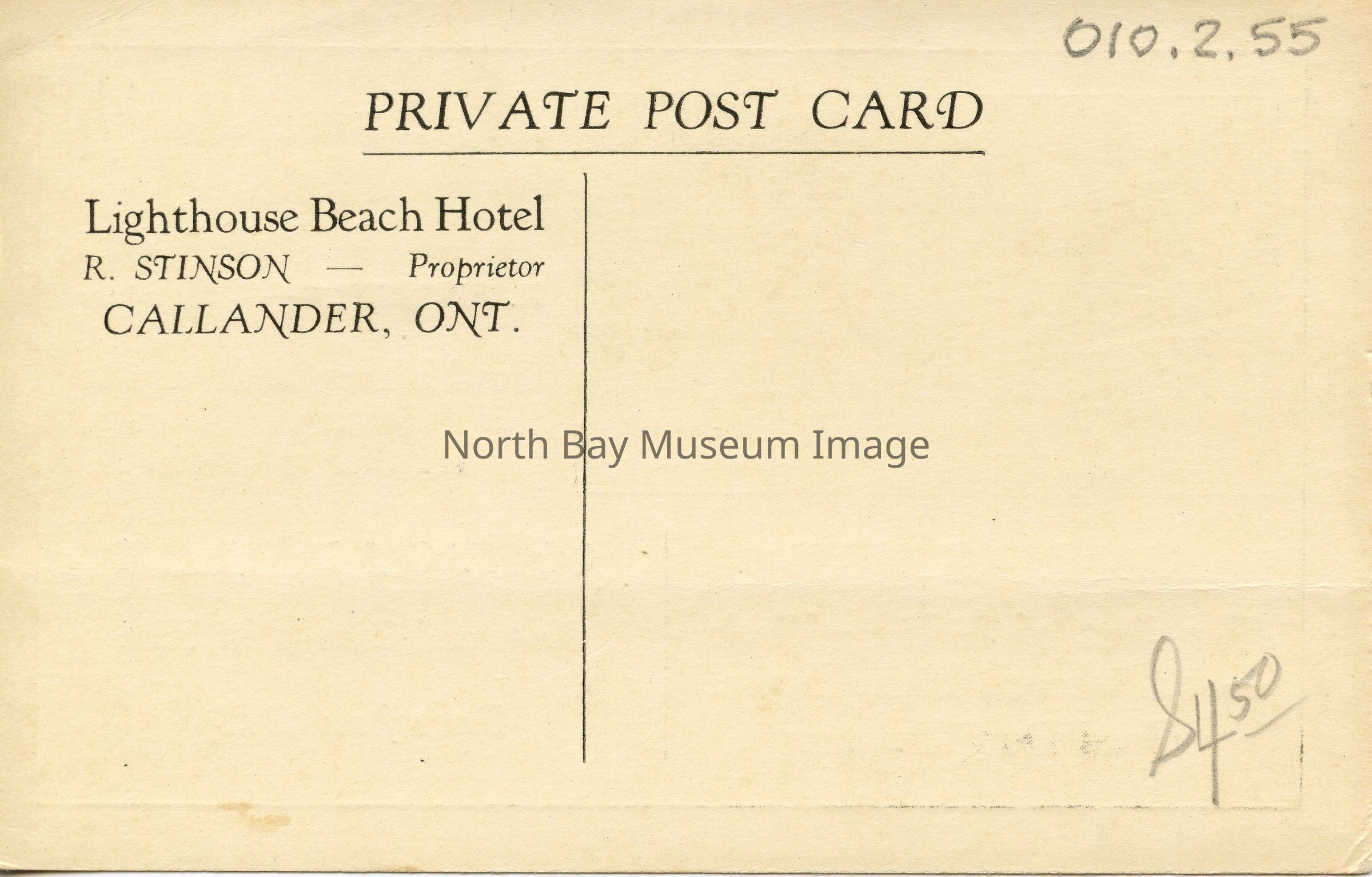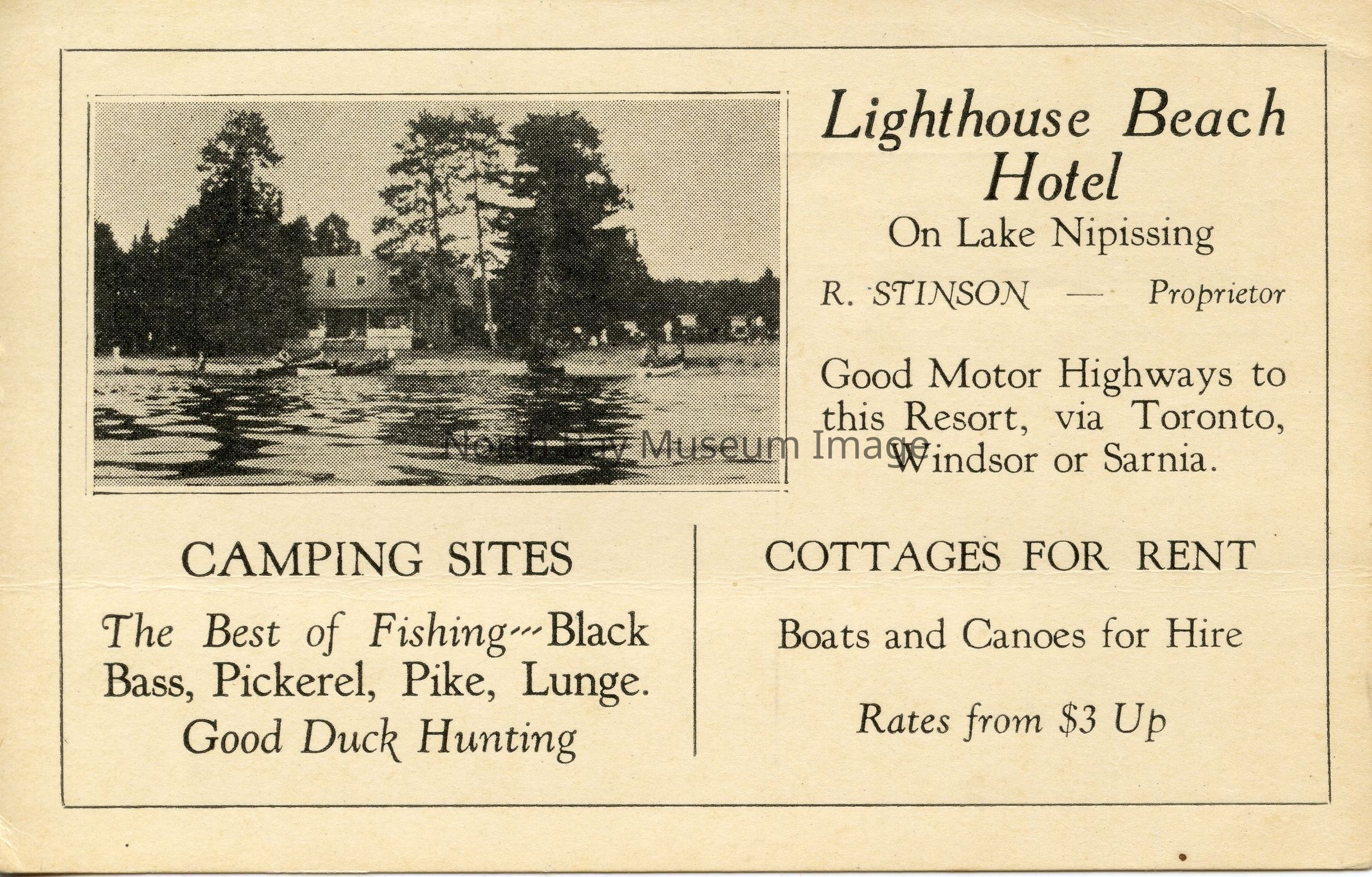 Postcard with B&W photo of the Lighthouse Beach Hotel On Lake Nipissing, R. Stinson - Proprietor