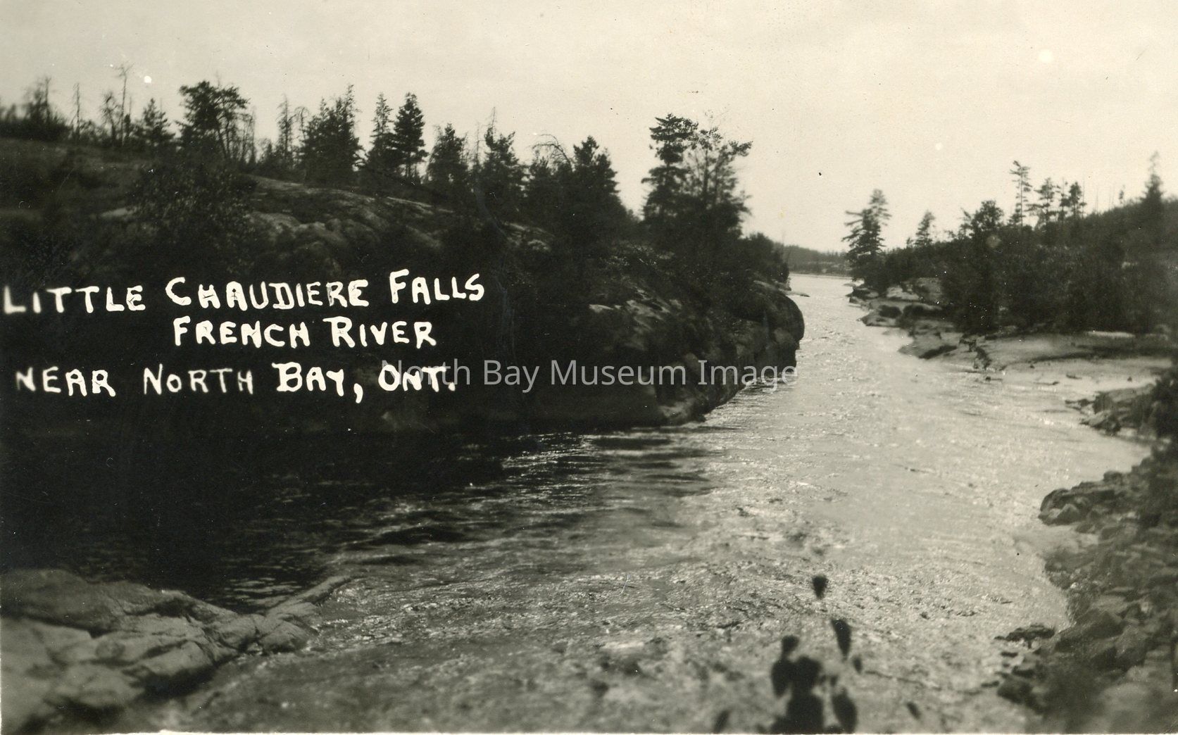 Post card of Little Chaudiere Falls -the words "Little Chaudiere Falls French River near North Bay, Ont." written in white lettering on the left side of the post card