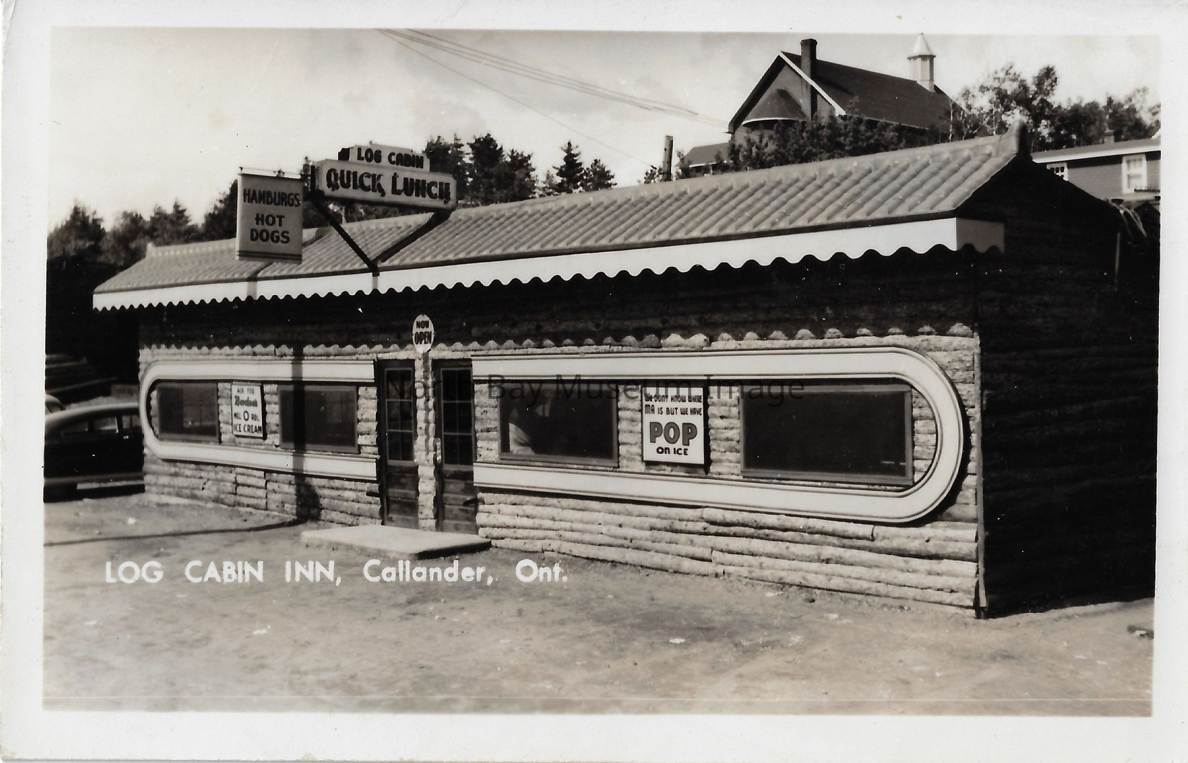 This is a Black and white postcard inscribed "Log Cabin Inn, Callander, Ont." The postcard shows a store front with various signs on it including, "hot dogs" and "pop." The building has windows lining the structure. There appear to be buildings above the Inn, most likely sitting on the escarpment. A car can be seen on the left side of the building.Date(s) of Creation