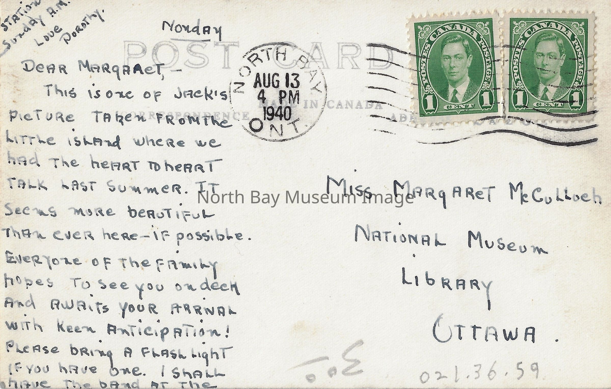Black and white postcard. The postcard is a landscape shot. The photo was taken through trees looking out at a body of water. In the body of water and right in the focus of the photo is a small rock island. The inscriptions on the postcard reads "Monday", "Dear Margaret, - This is one of Jack's Picture taken from the little island where we had the heart to heat talk last summer. It seems more beautiful than ever here--if possible. Everyone of the family hopes to see you on deck and awaits your arrival with keen anticipation! Please bring a flashlight if you have one. I shall have the band at the station Sunday A.M.", "Miss Margaret McCulloch National Museum Library Ottawa . Aug 13 1940."