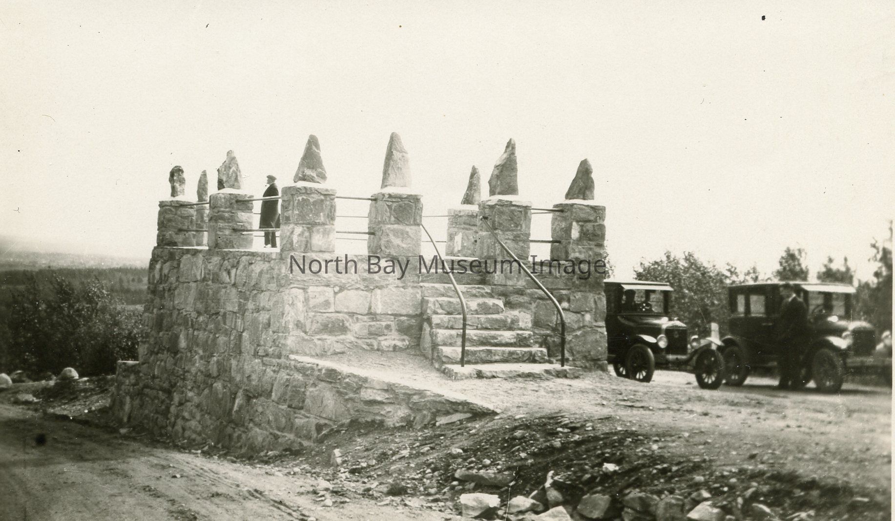 Photo of North Bay, Lookout stone tower with early 1900s cars visble. Image taken at Thibeault Hill, no date.