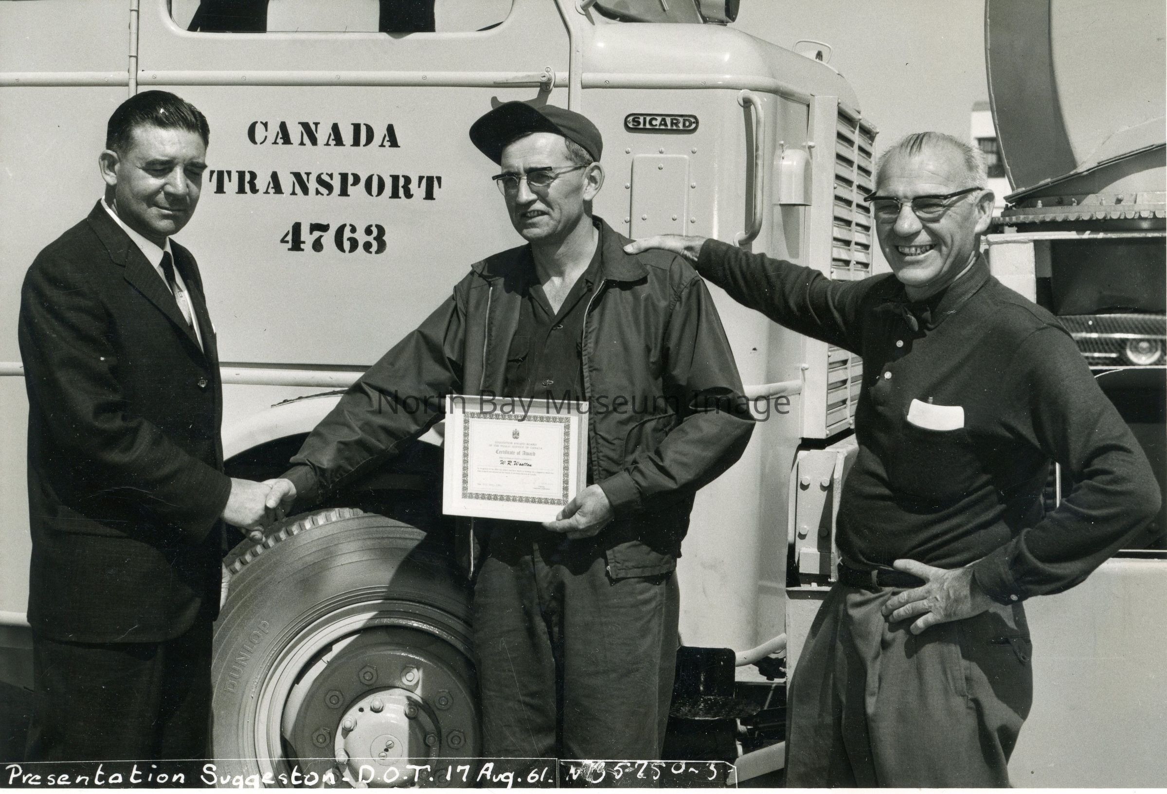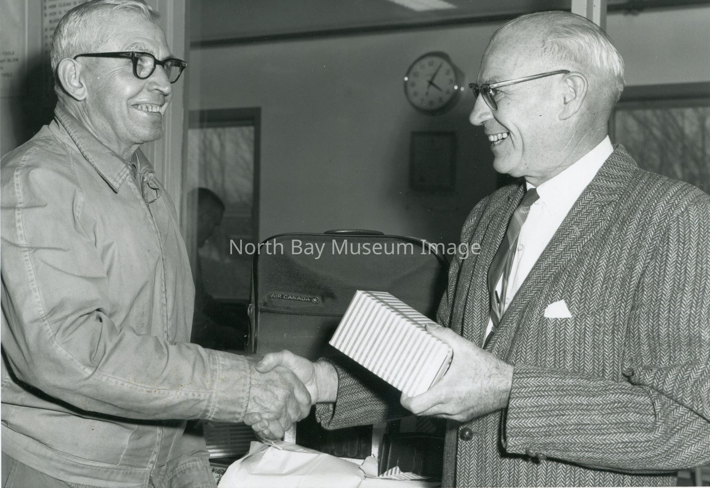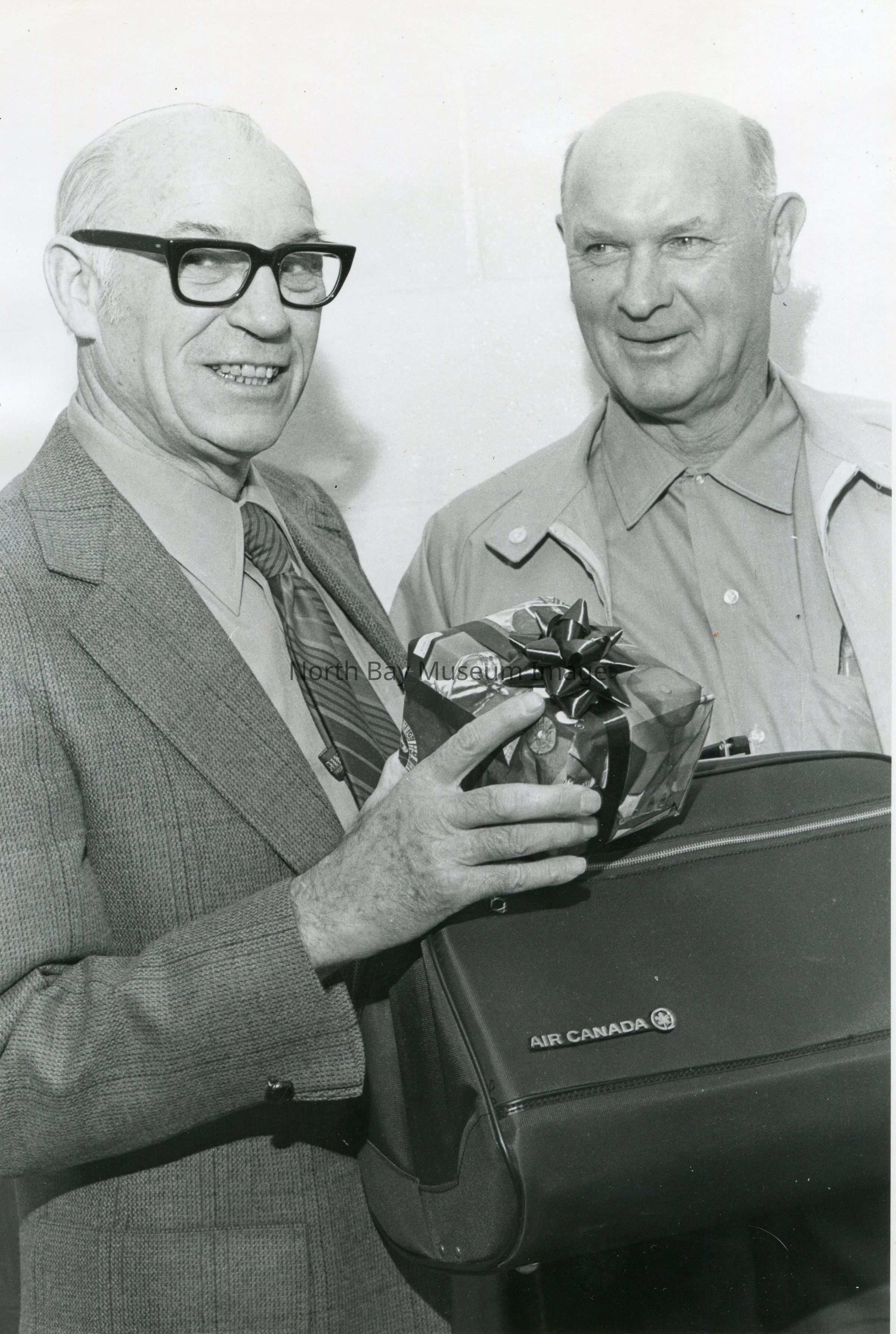 Photos of airport manager Lorne Hicks with gifts and awards.