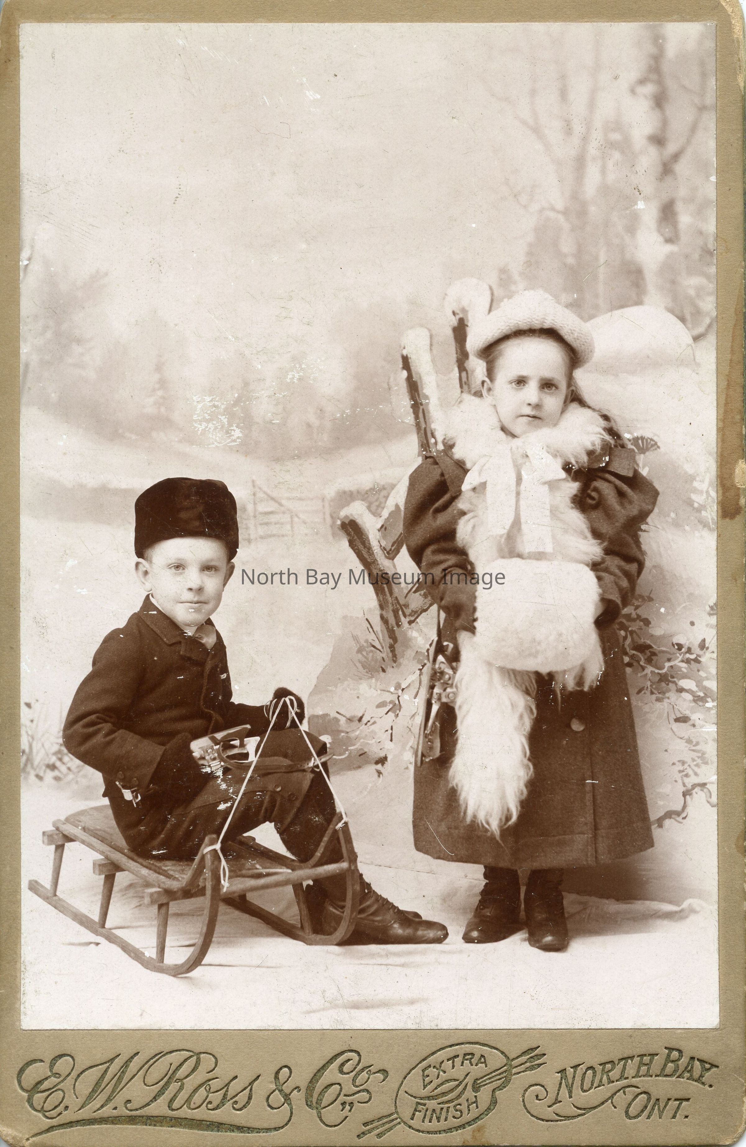 A- Photo of young girl and boy with winter clothing and scene in background.