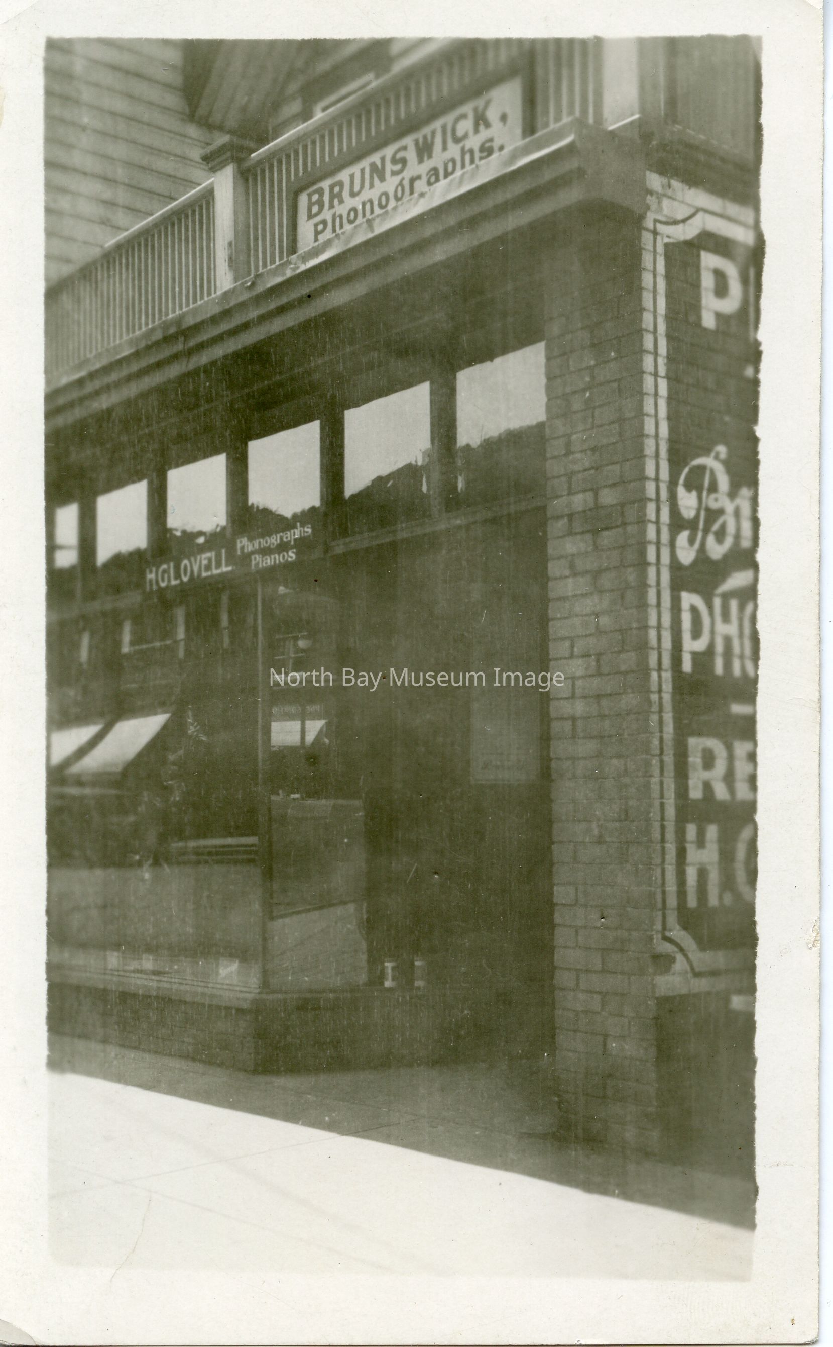 Photograph of Lovell's music in 1925 on Main East. Brick painted sign visible on right side of photo as well as Brunswich Phonographs sign above and H.G. Lovell sign above windows. Two years after this photo was taken, the store moved to the larger location on Main West.