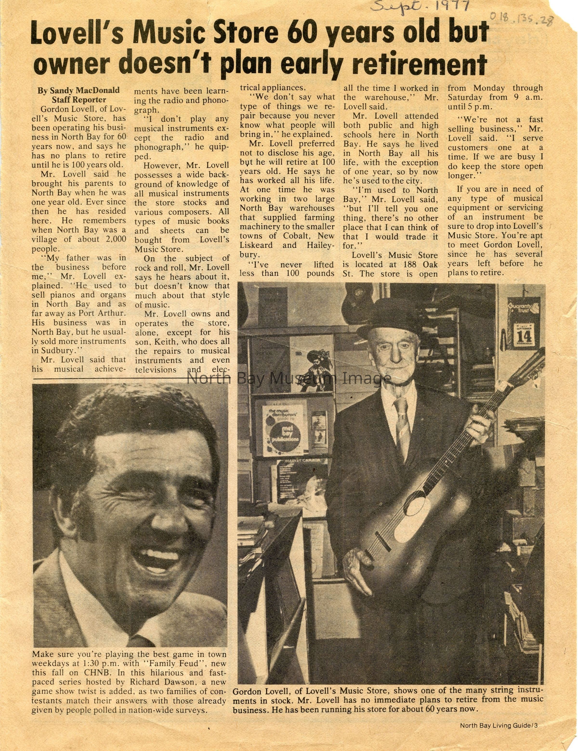 One page story about Gordon Lovell who describes his store's history and his plans to work at the store until he is 100 years old. The store was located at 188 Oak Street. Includes photo of Gordon Lovell in the store. Ads are on the back of the paper. Sept 1977 written in pen on the front.Creator