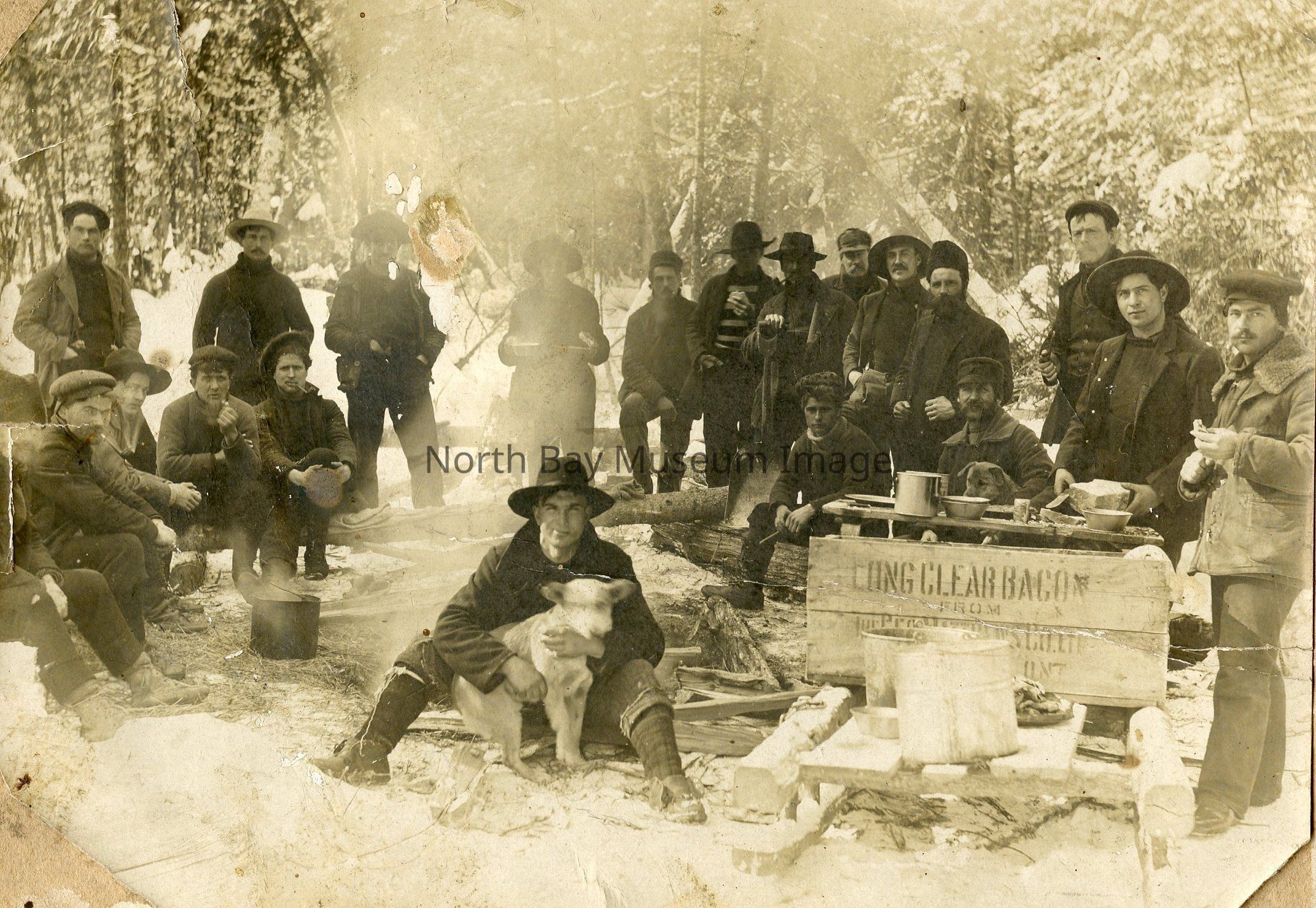 -Black & white photograph of a group of men having supper in the