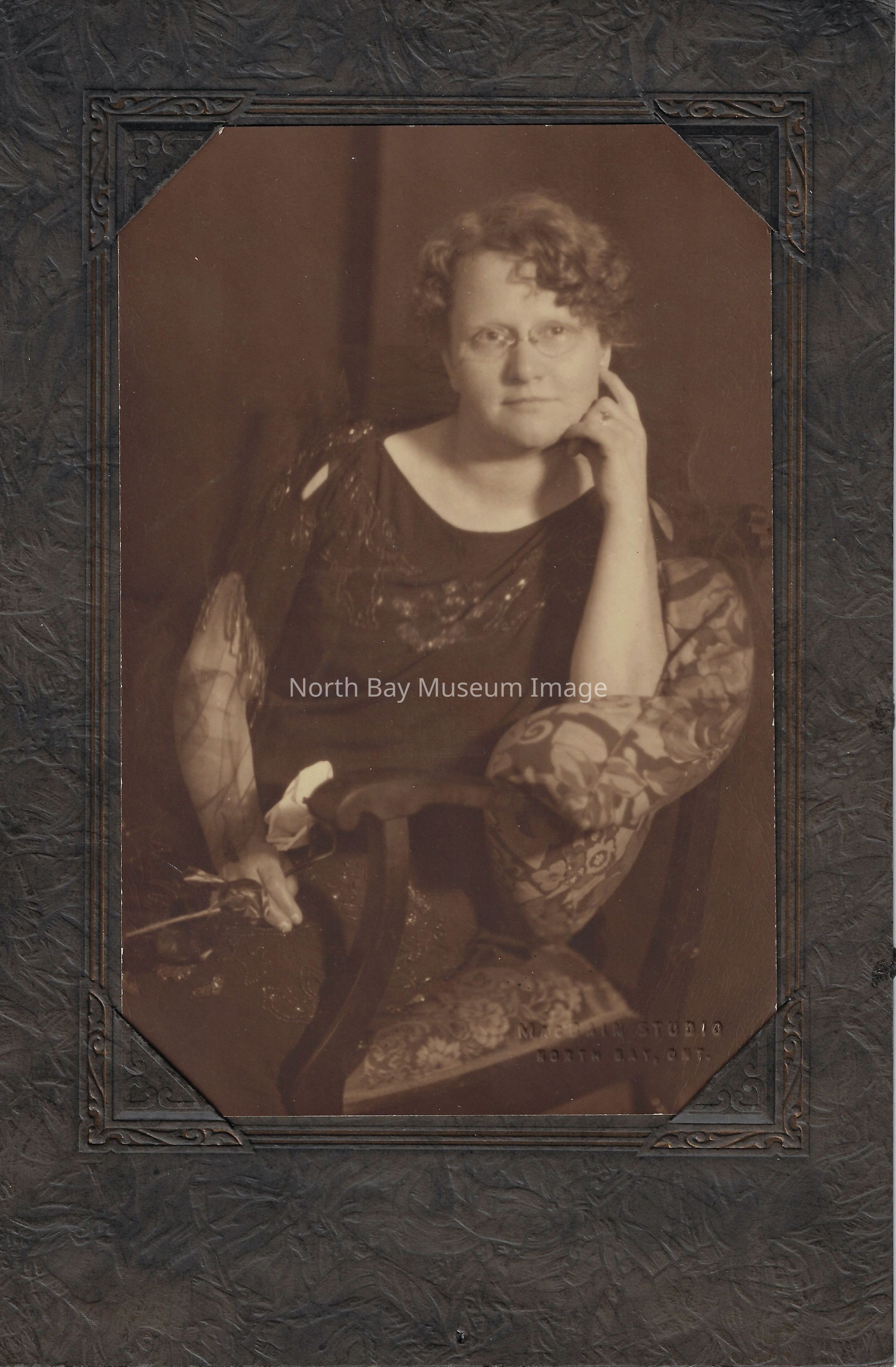 021.118.06: Photo of woman on chair with flower. Inscription: "Great grandma Milne nee Mabel Deltor". McBain Studio, North Bay, Ont.