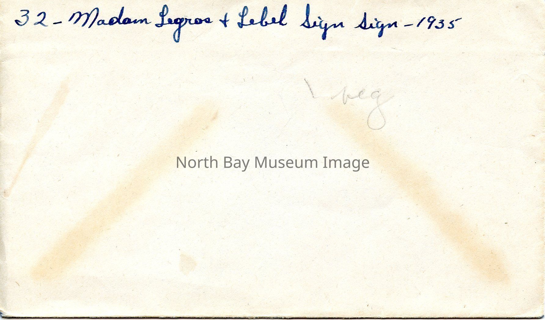 Photographer's Envelope (a) contains the negative (b) of "Madam Legros and Madam Lebel: Midwives of the Quintuplets Bid You Welcome" Sign. The sign promotes the two midwives that birthed the Dionne Quintuplets. A part of the Forder Collection.Creator