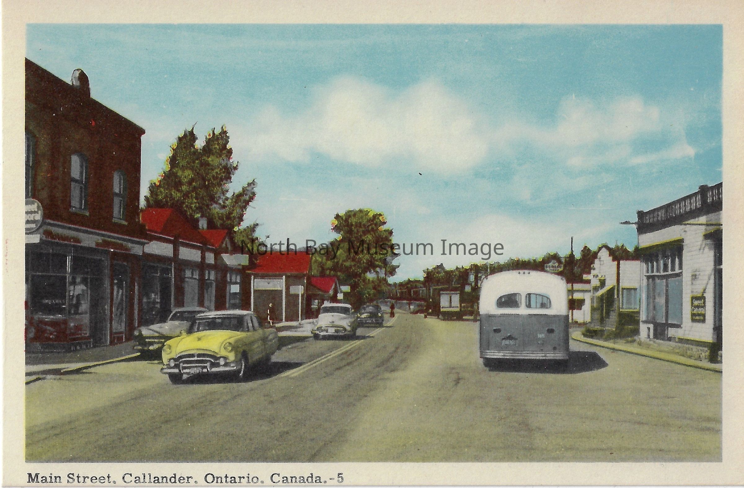 This is a coloured, painted postcard. The photo is taken down the middle of Main Street. On both sides of the street there are cars. Shop fronts can be seen in the postcard. The postcard caption is "Main Street, Callander, Ontario, Canada.-5."Date(s) of Creation