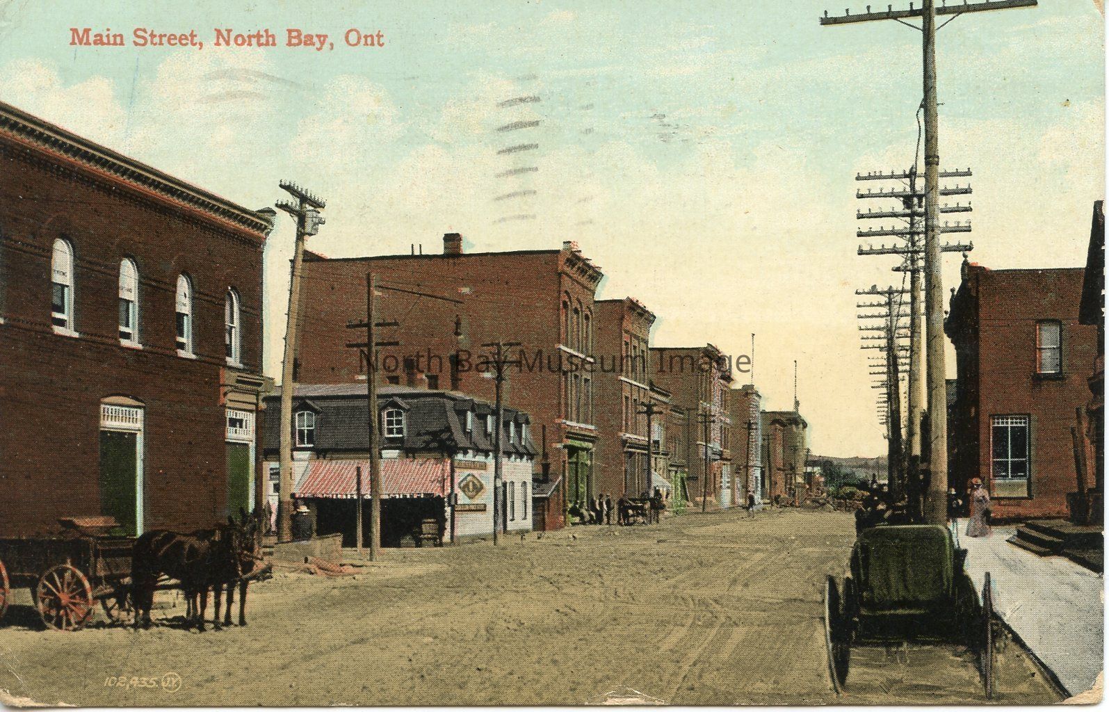 This is a coloured print of Main Street, North Bay. The image is of an intersection of Main Street. The street is unpaved. There are a few hydro lines on the right hand side of the image. There are a few horse and buggies milling around the street. A few people can be seen walking along the sidewalk on the right hand side of the street.