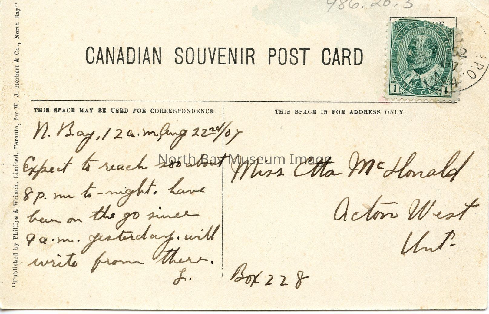The message on back contains date Aug. 22, 1907, and North Bay 12am, expect to reach you about 8 pm to night, have been on the go since 9 am yesterday, will write from there L