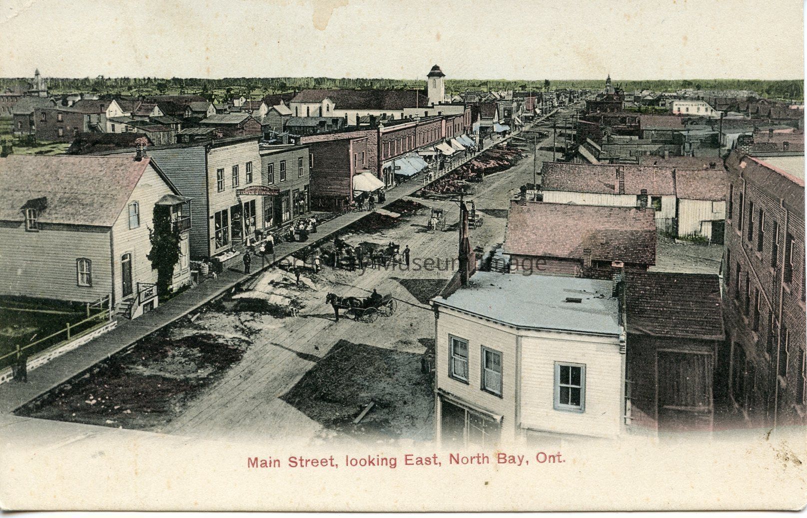 This is a coloured , 3.5 x 5.5 inch postcard. The postcard is of Main Street looking east North Bay, On. The streetscape shows a number of stores, and even horses and buggies.