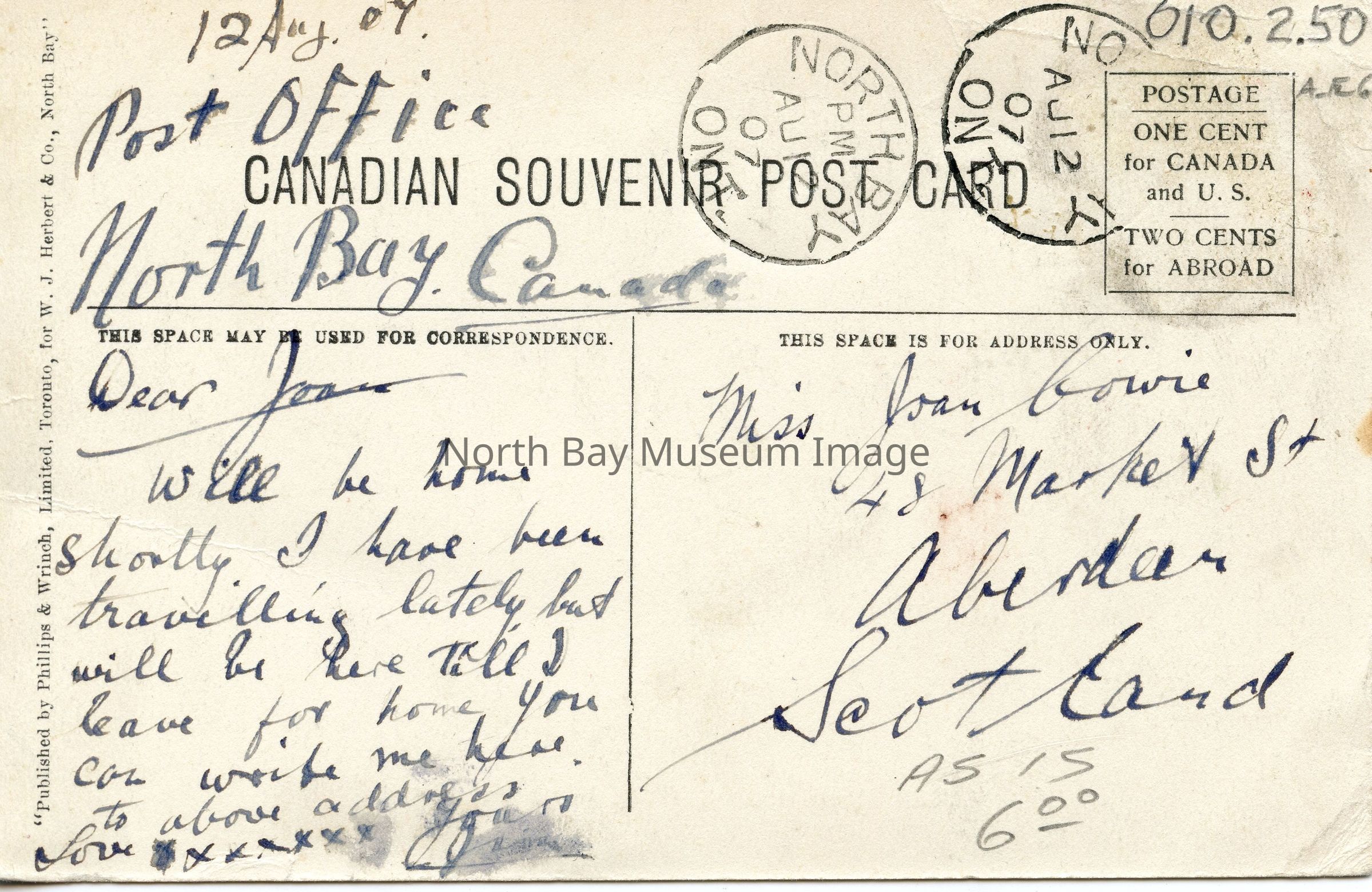 Postmark: NORTH BAY, ONT. AU 12 07"Creator