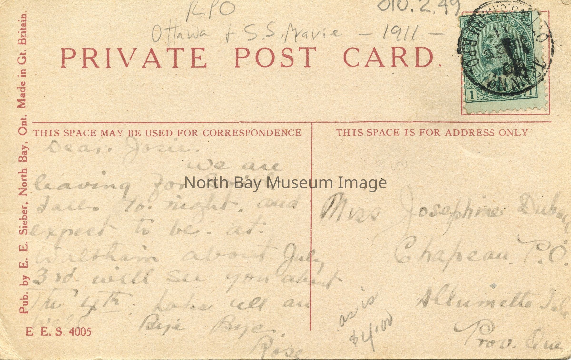 Handwritten in pencil at top of card: RPO Ottawa & S.S. Marie - 1911 -