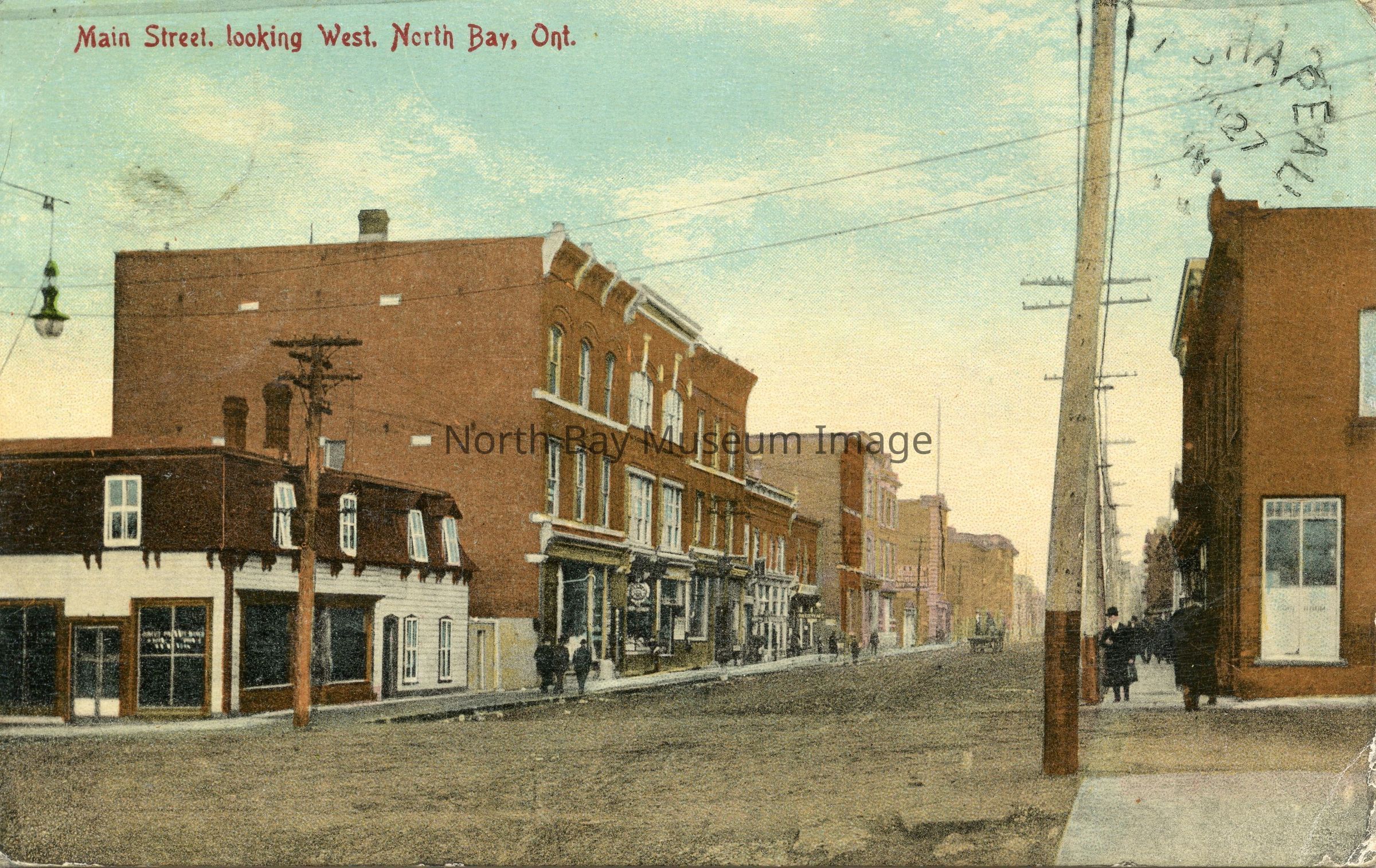 Cement sidewalks, dirt street, many pedestrians, one horse-drawn cart on the street