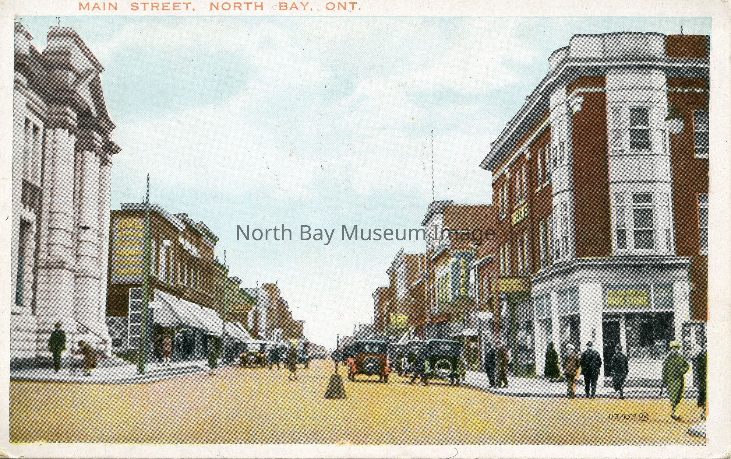 Postcard with colorized photo of North Bay's Main Street at corner of Fraser & Main St., looking east down the centre of the street. Street is very busy with cars and pedestrians. McDivitts Drug Store on southeast corner (right side of street) within Queen's Hotel building with Canadian Cafe next to the building. The Post office building on left side of street, next to it is Richardson's Hardware.