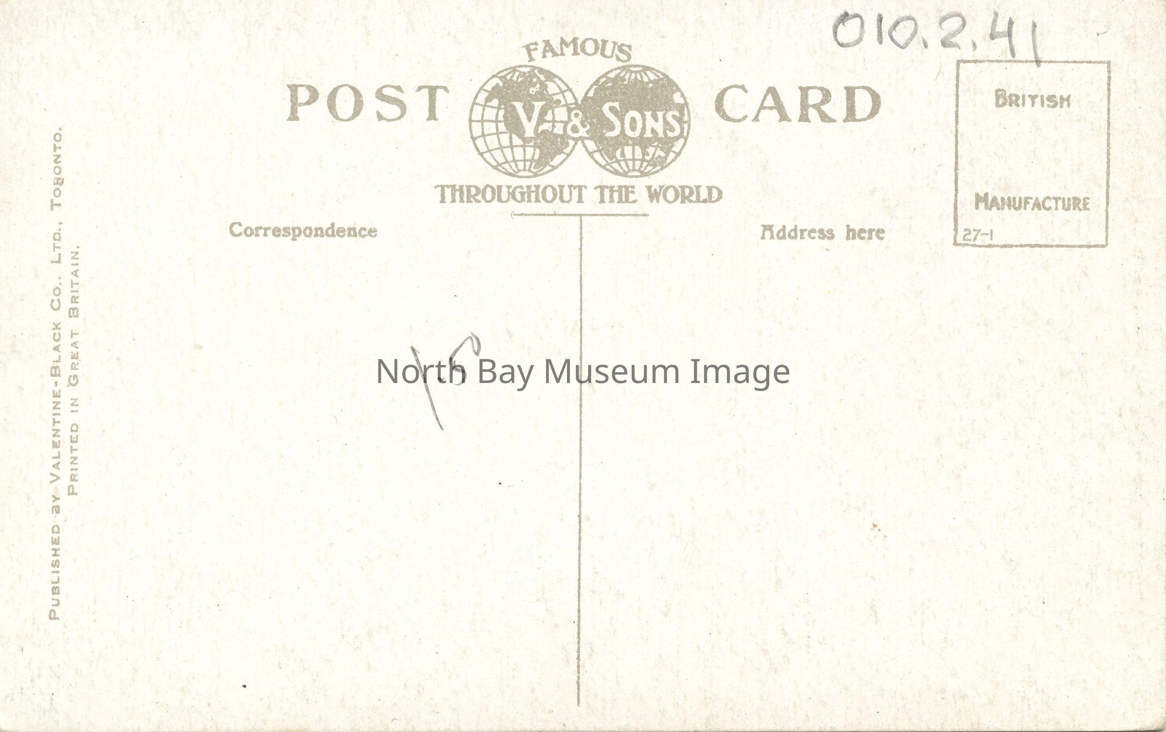 Back of postcard is blank except for pre-printed text--"FAMOUS V & SONS POSTCARD THROUGHOUT THE WORLD."On left half of card: is meant for "Correspondence."On right half of card: "Address here" is listed.Creator