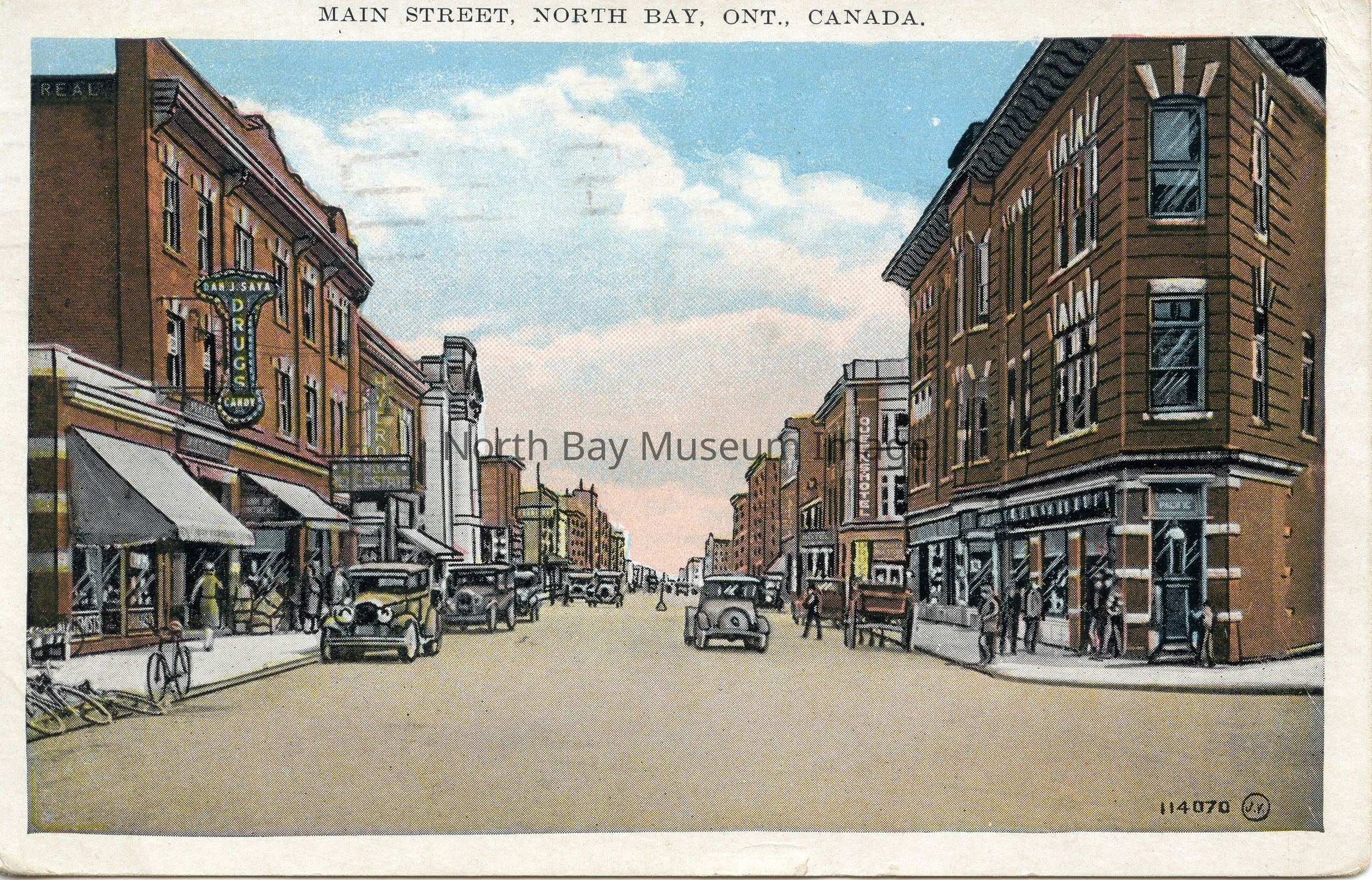 3-story building on left side has vertical sign perpendicular to building: "Dan J. Saya, DRUGS, Candy". Next door is awning of Bank of Montreal, then Real Estate office.
