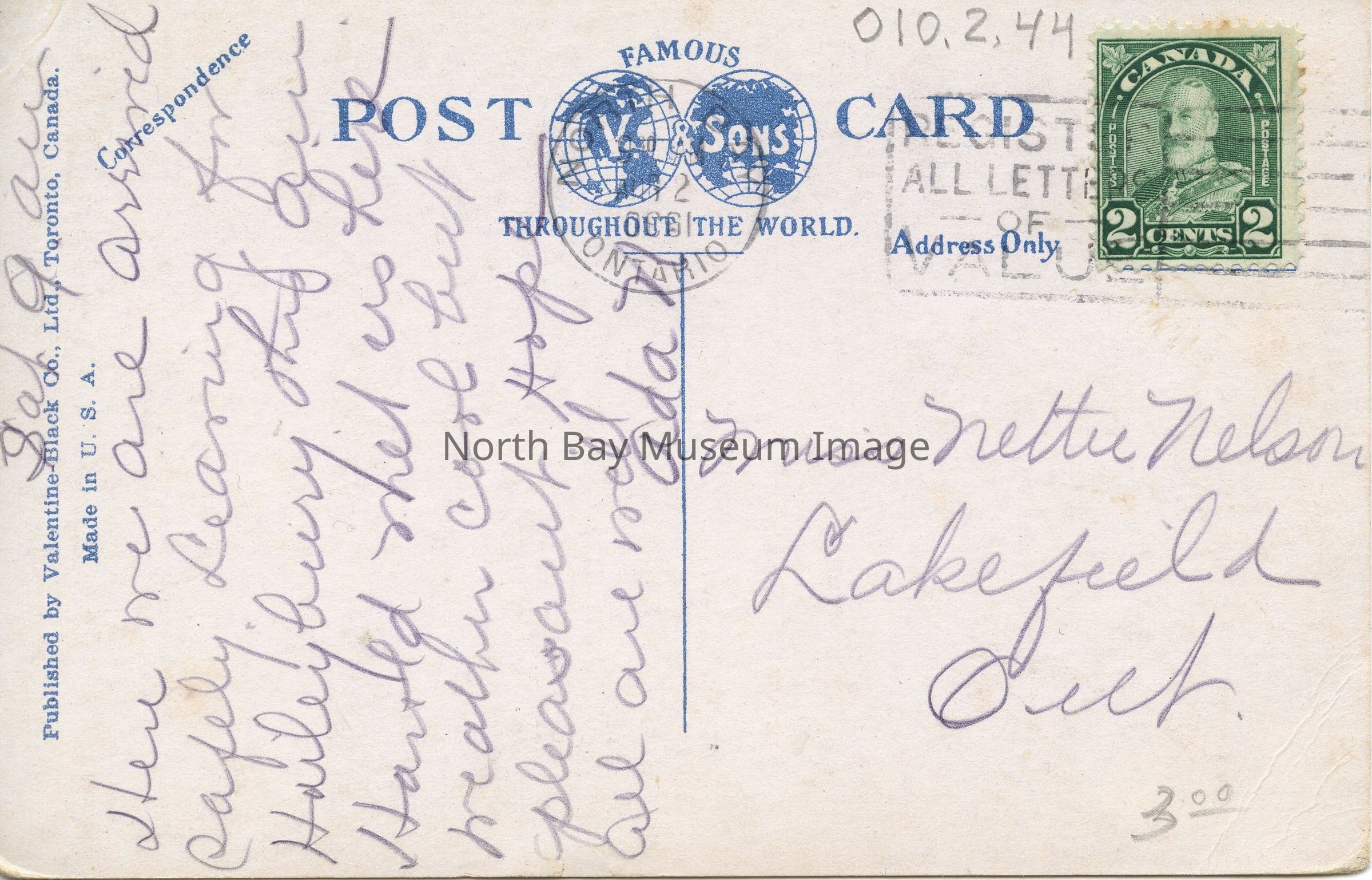 Addressee: Miss Nettie Nelson, Lakefield, Ont.Creator