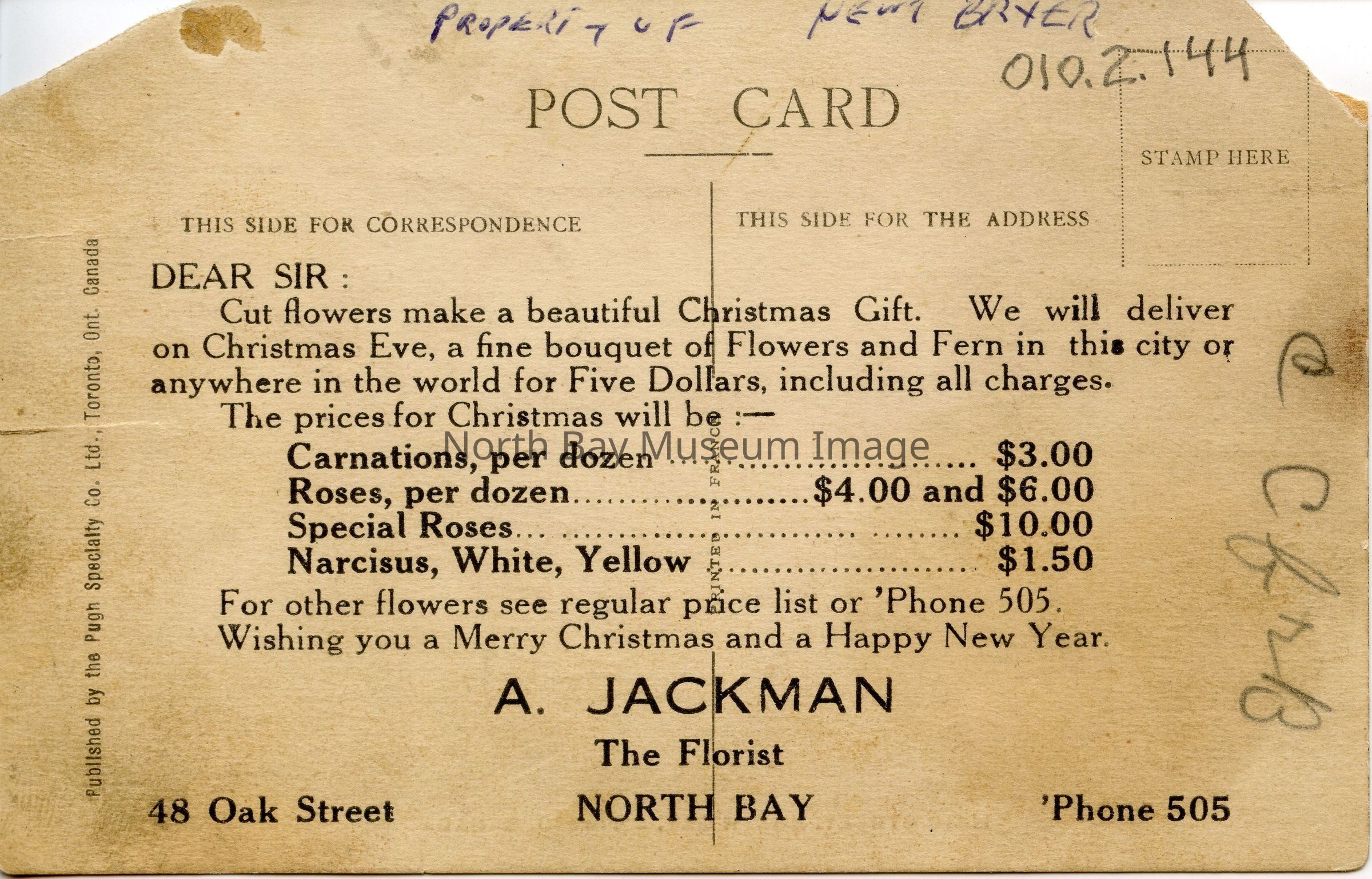 Is a pre-printed notice promoting Christmas flower sales from A. Jackman, The Florist, 48 Oak St., North Bay, Phone 505.Creator