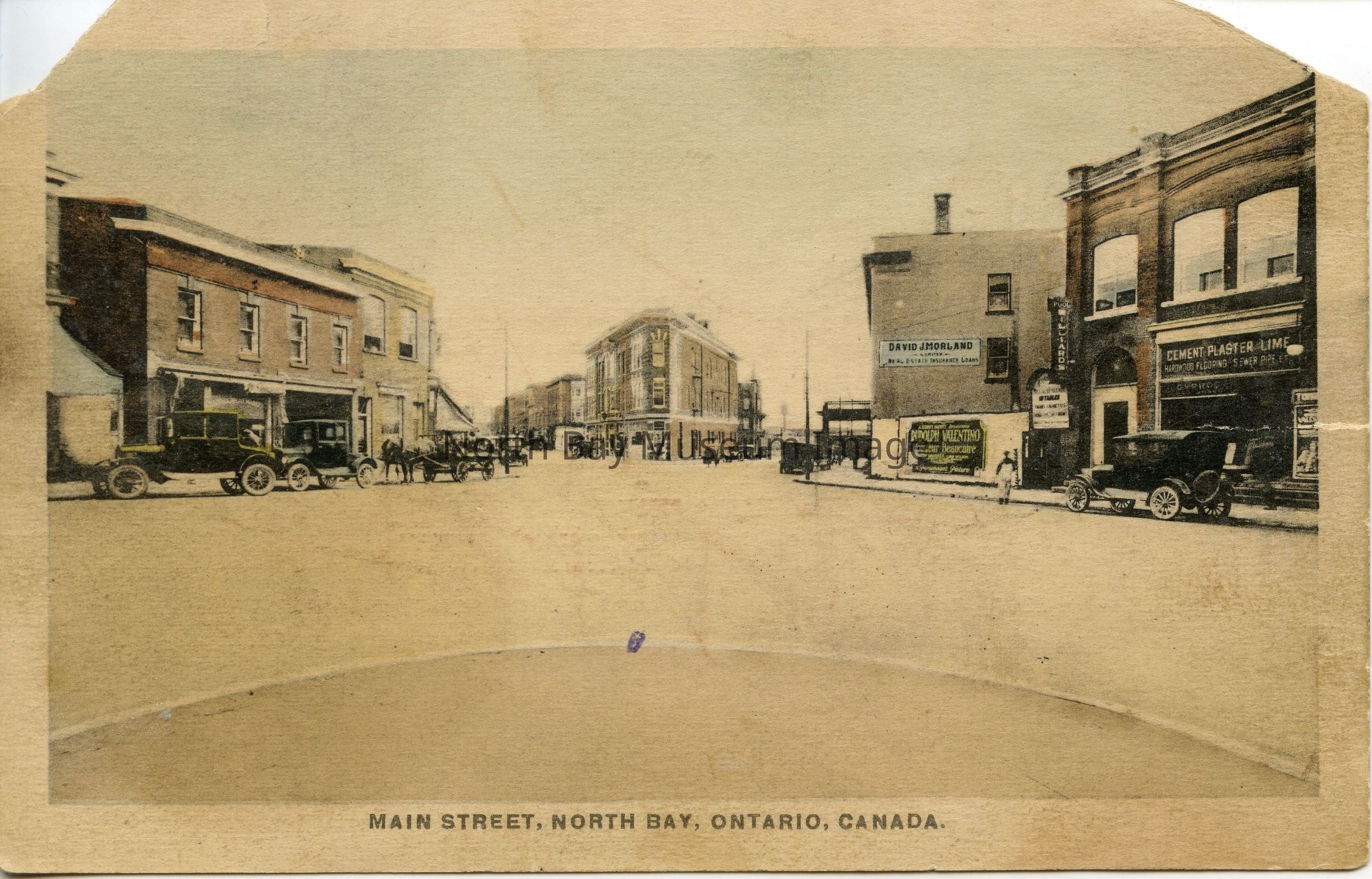 Postcard with B&W photo of Main St., North Bay. Many automobiles parked along street as well as a horse-drawn wagon. Photo was taken directly facing the Transporation Building with businesses on either side visible (both on Main and Klock avenue). Entrance to Royal Theatre visible on the right. Also visible are signs for David J Morland, Pool & Billiards, and Cement Plaster and Lime. Street appears to be paved, date assigned is approximate.