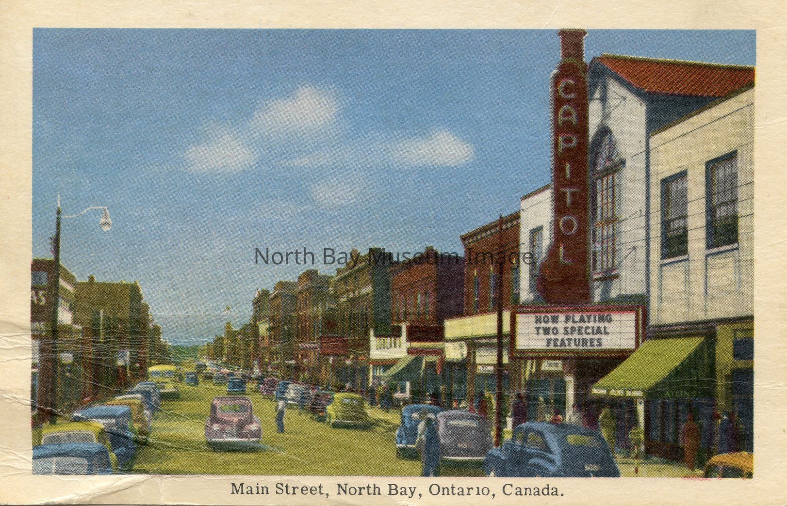 This is a coloured 3.5 inch x 5.5 inch postcard of Main Street, North Bay. The postcard has a white boarder with the words "Main Street North Bay," in black ink at the bottom of the postcard. The image is of a streetscape of North Bay's main street. The buildings on the left side can not be distinguished. On the right side of the postcard the building that stands out the most is the Capital Theatre. This sign at the Theatre says that is is 'now playing two special features.' There are lots of old fashioned yellow, grey, blue and brown cars parked on both sides of the street, and driving in the street. In the middle of the postcard a man can be seen walking across the street.