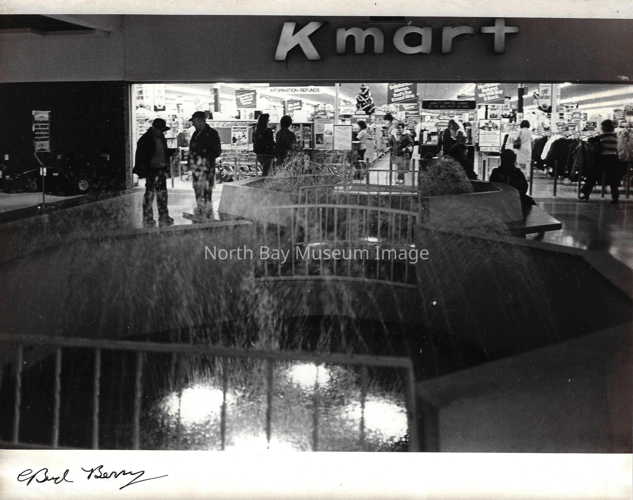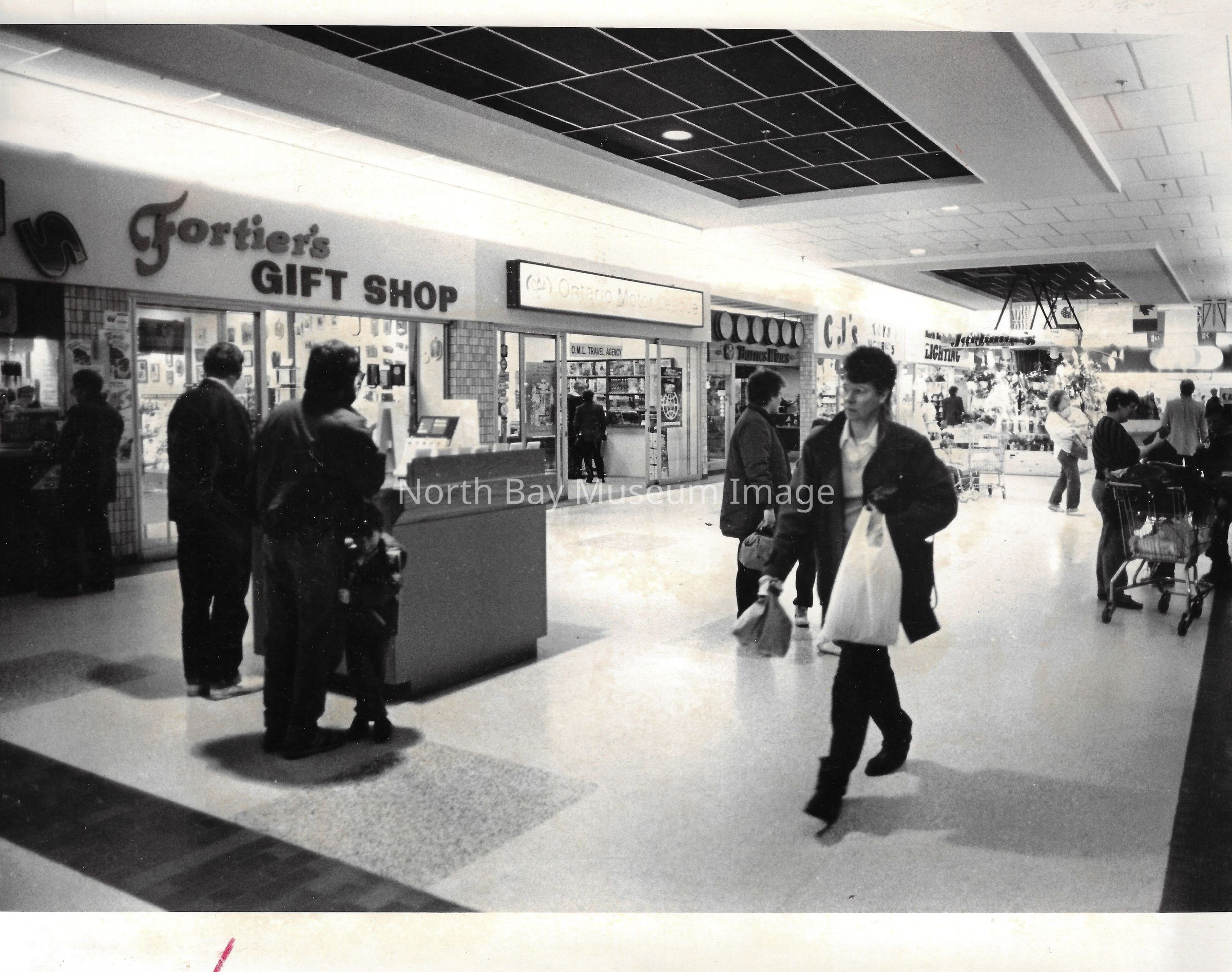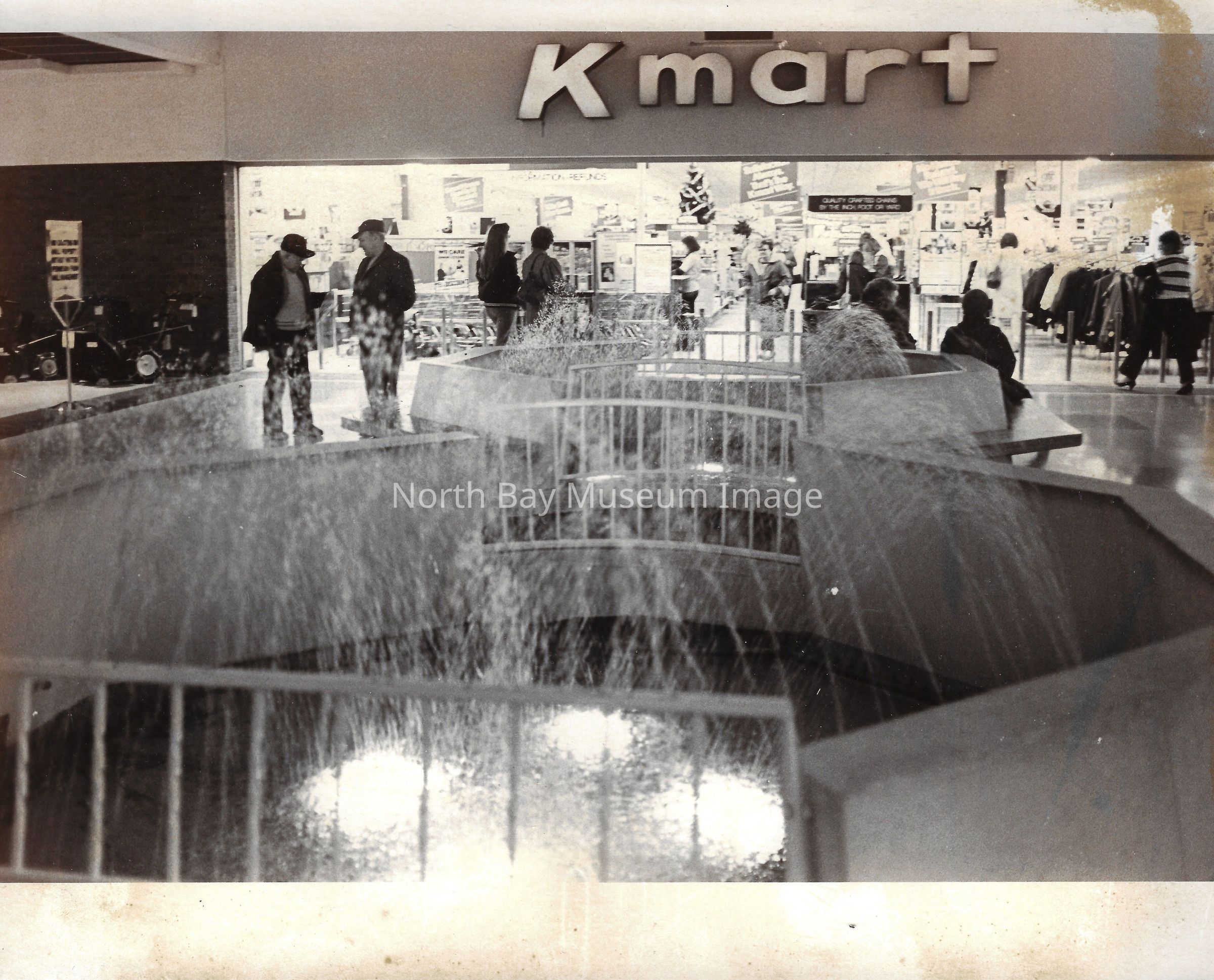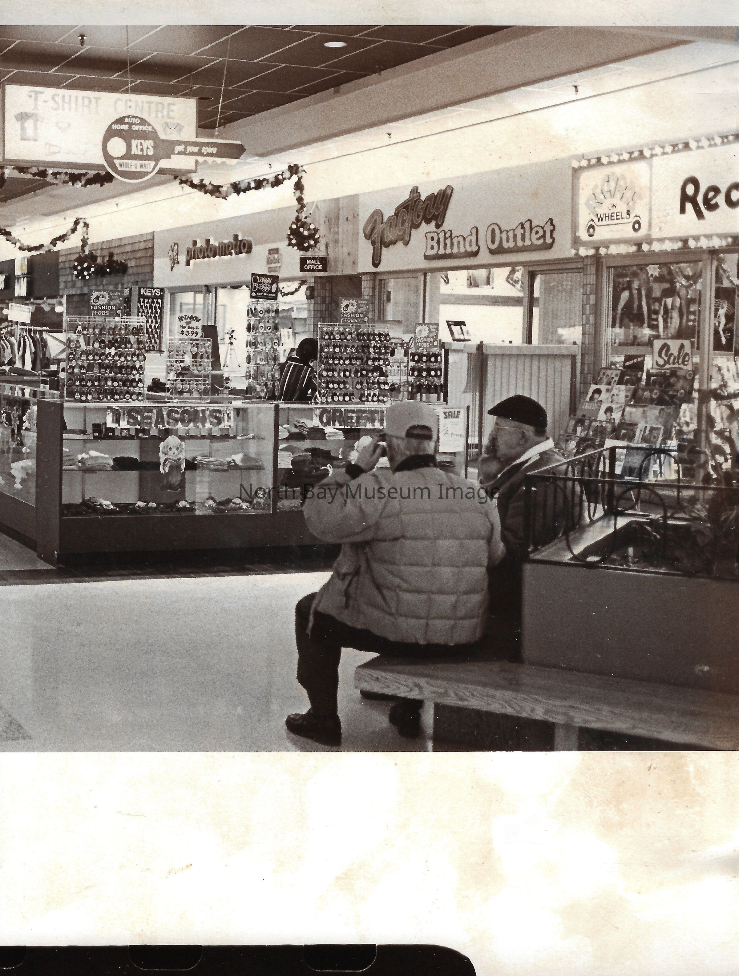 General photos of mall fountain and christmas decorations. Photos of stores in North Bay Mall including North Bay Lighting, Records on Wheels, Smart Set, Reitman's, Gallenkamp shoes, Woolco, Cinemas Champlain, Happy Hour, K Mart, Royal Bank, Polar Camera Centre, Samuel's Cafe, People's Jewellers, A&P, Dapper Don, Suzy Shier and C.J.'s Hobbies.Date(s) of Creation