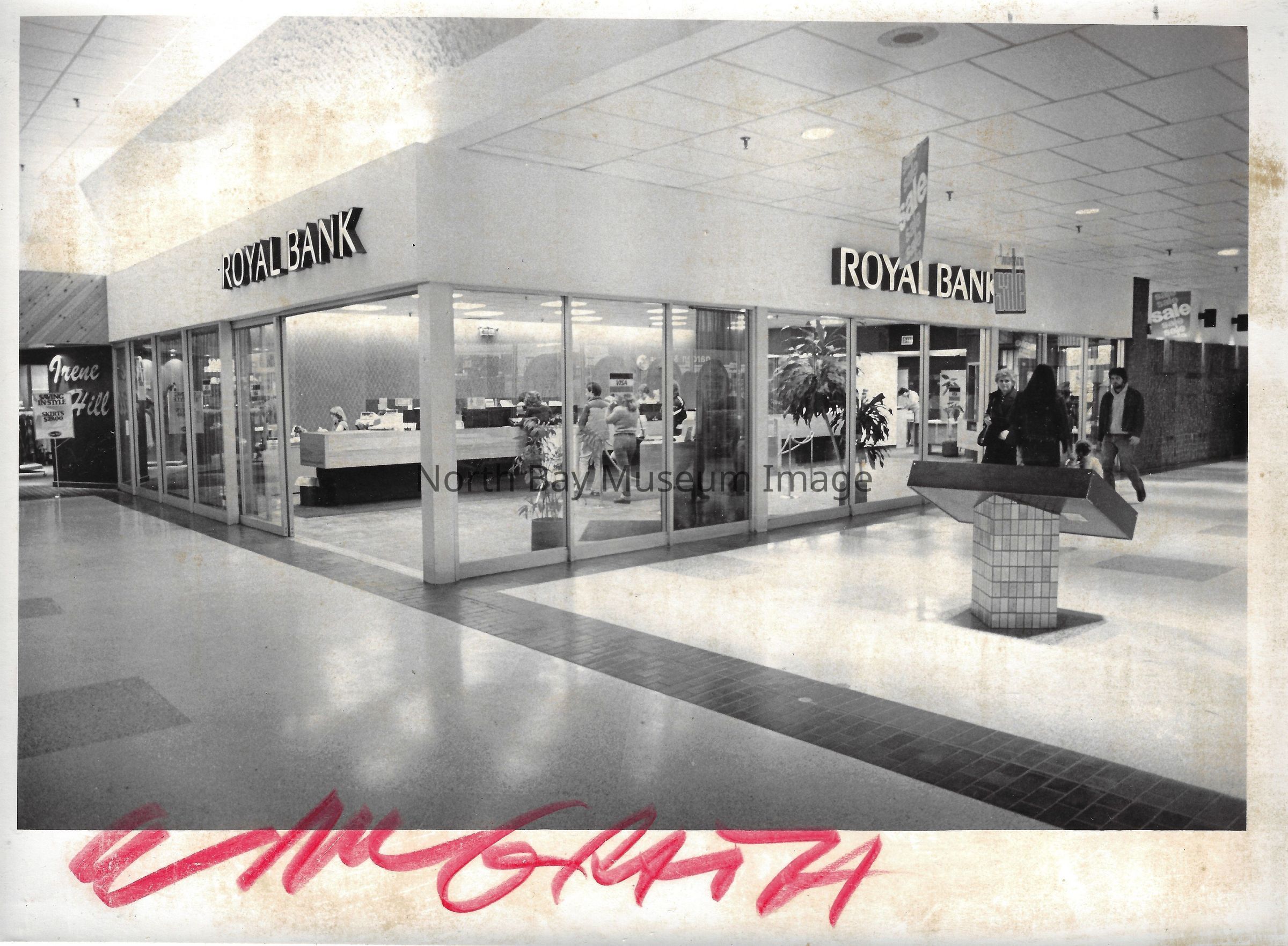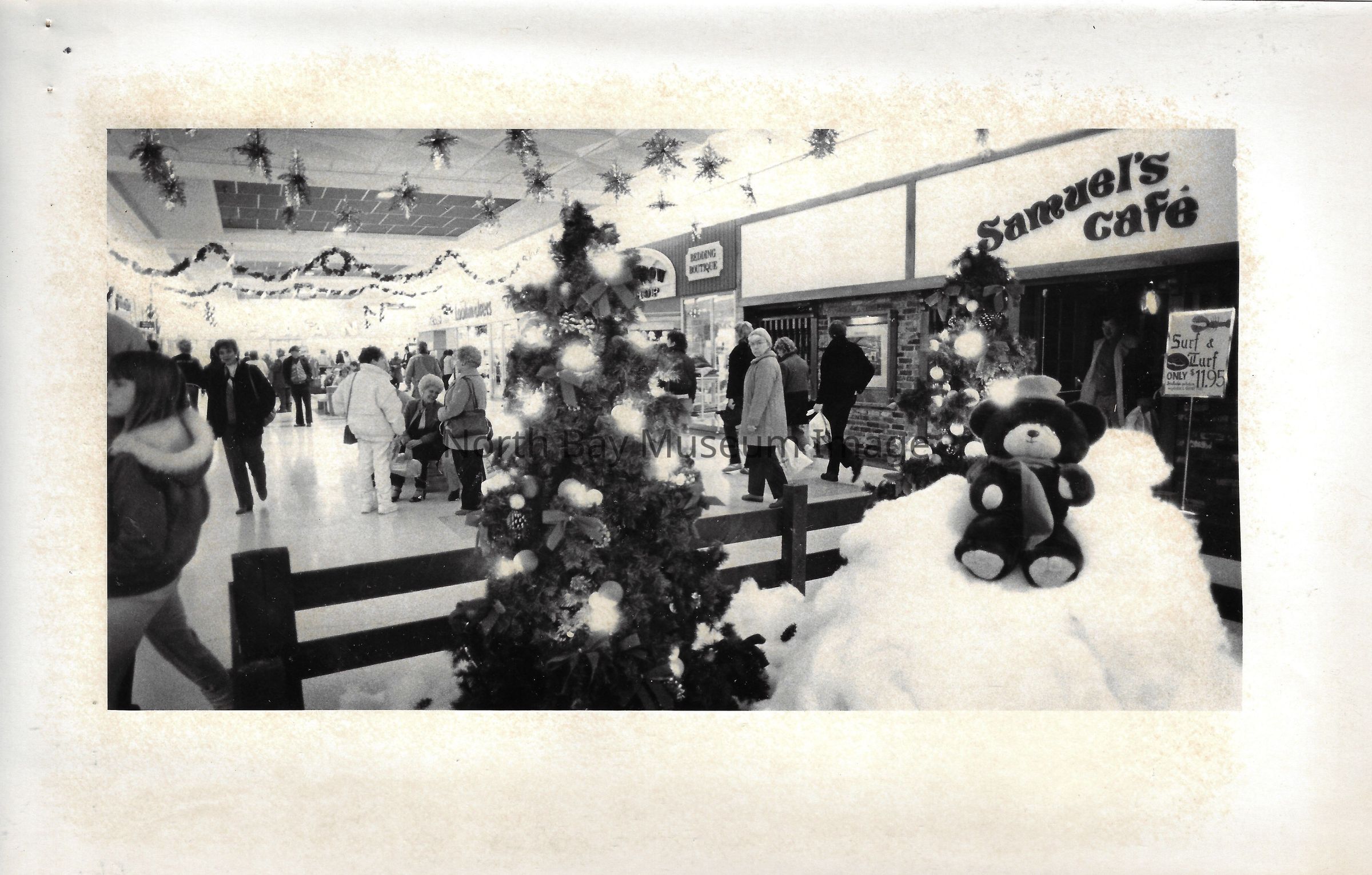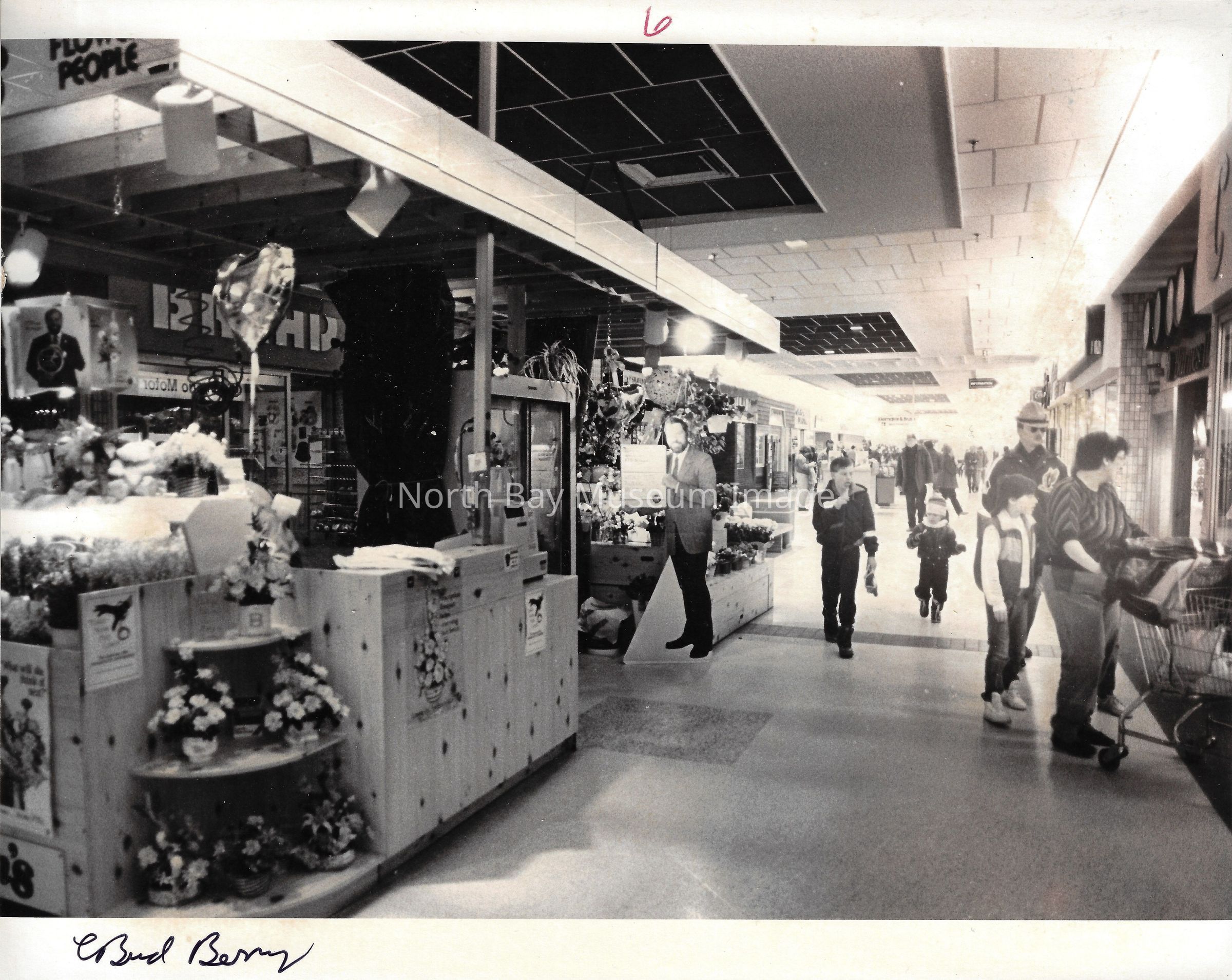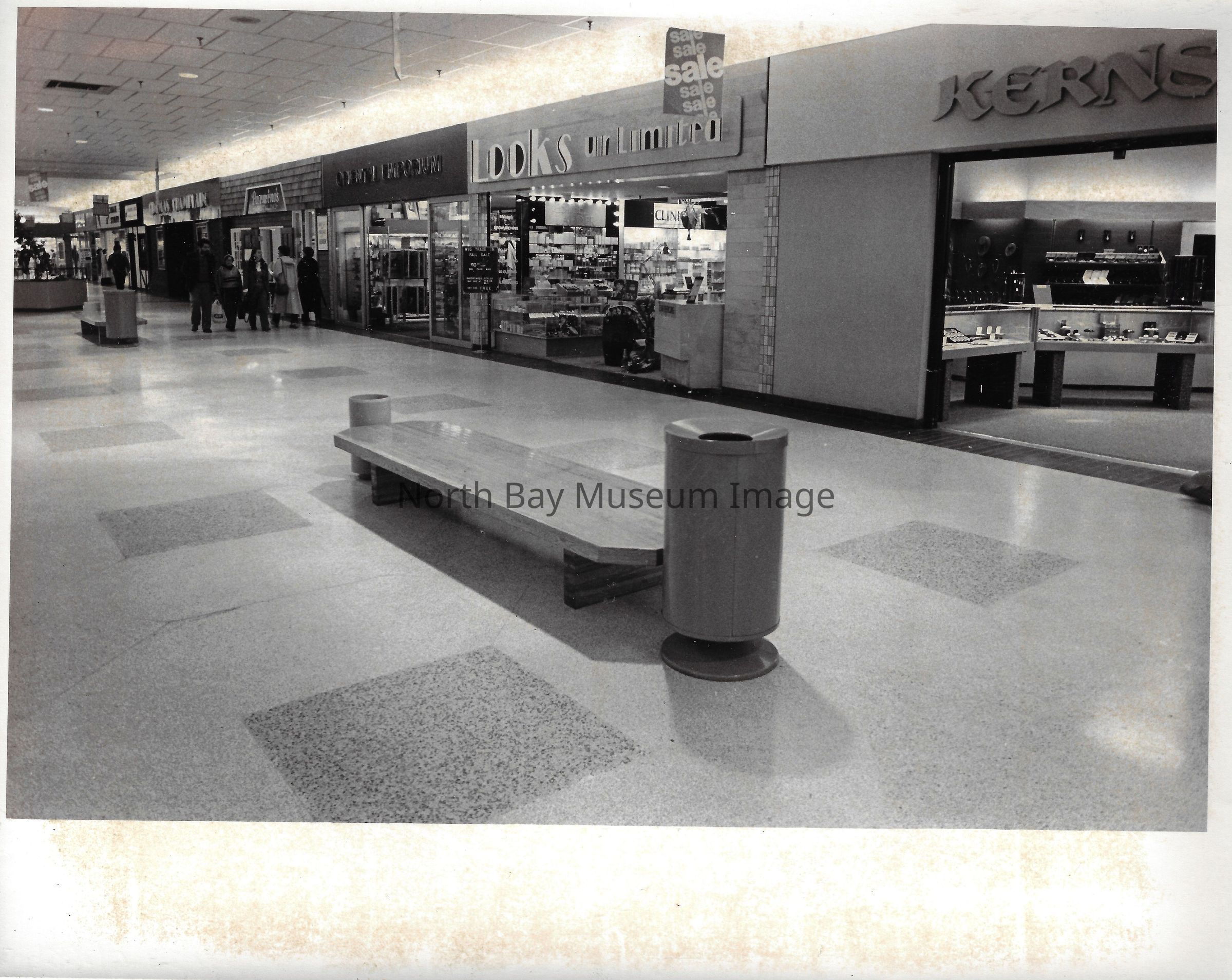 General photos of mall fountain and christmas decorations. Photos of stores in North Bay Mall including North Bay Lighting, Records on Wheels, Smart Set, Reitman's, Gallenkamp shoes, Woolco, Cinemas Champlain, Happy Hour, K Mart, Royal Bank, Polar Camera Centre, Samuel's Cafe, People's Jewellers, A&P, Dapper Don, Suzy Shier and C.J.'s Hobbies.Date(s) of Creation