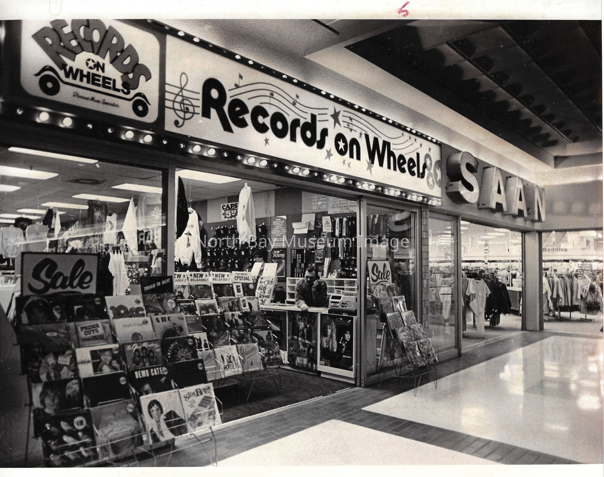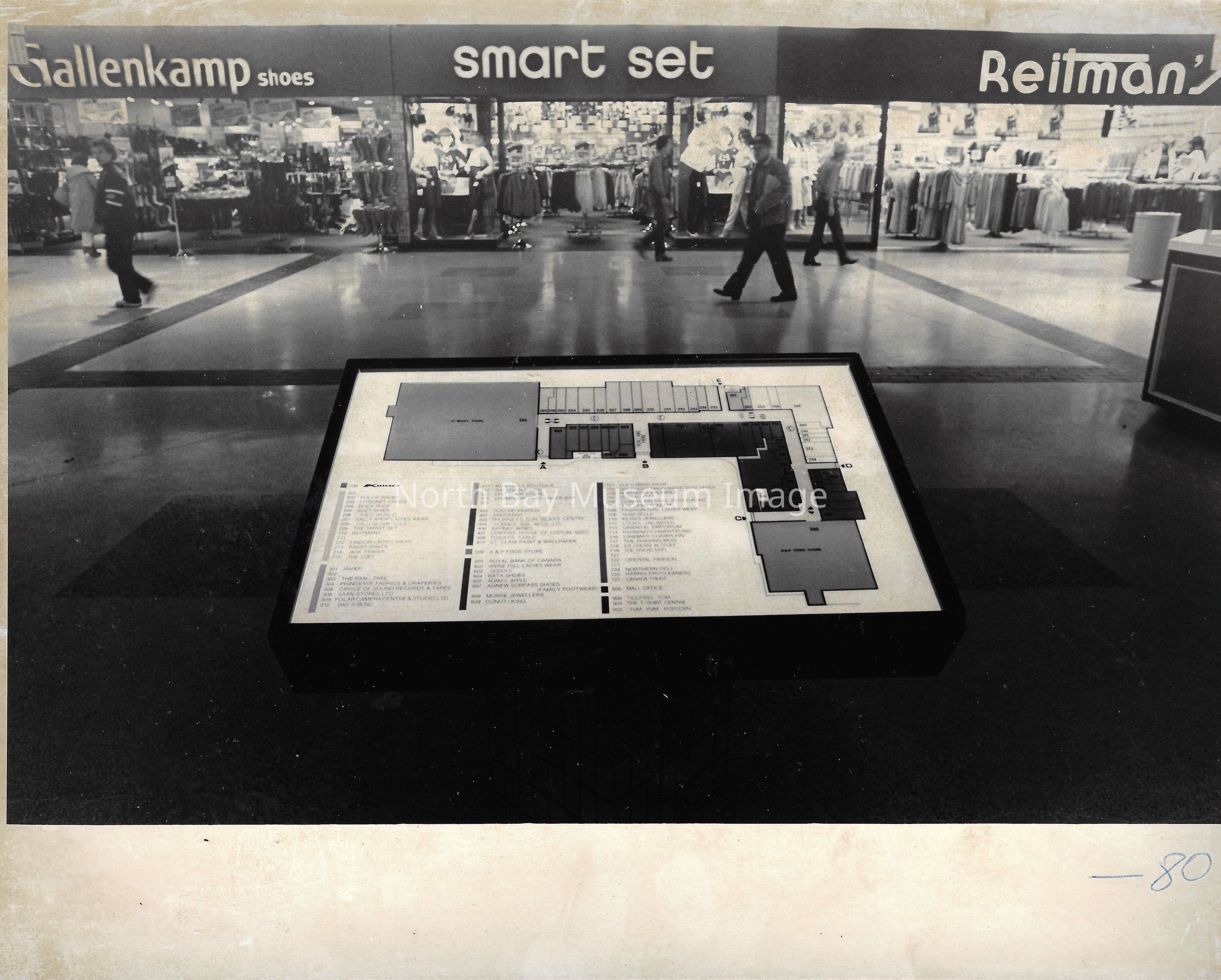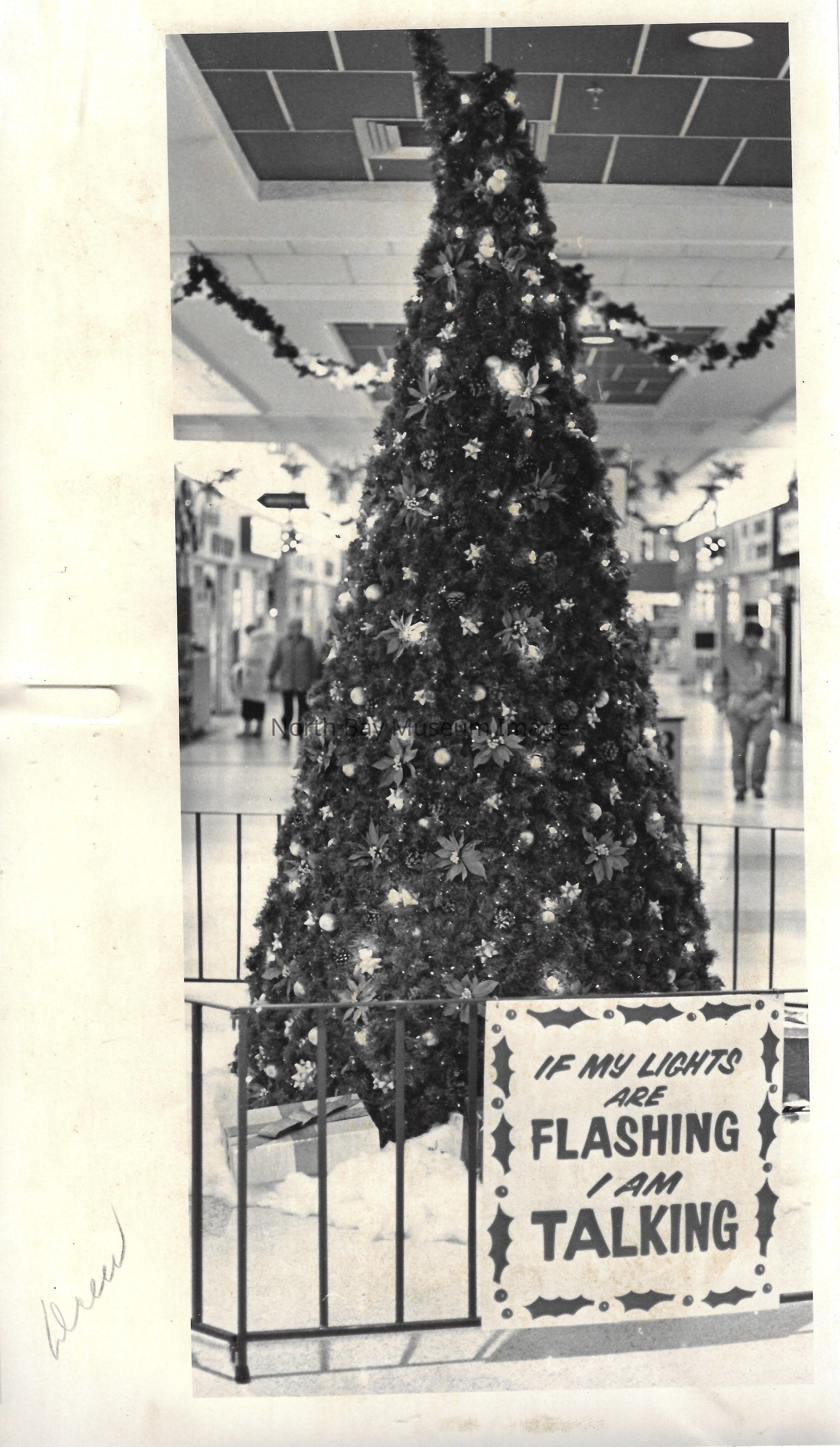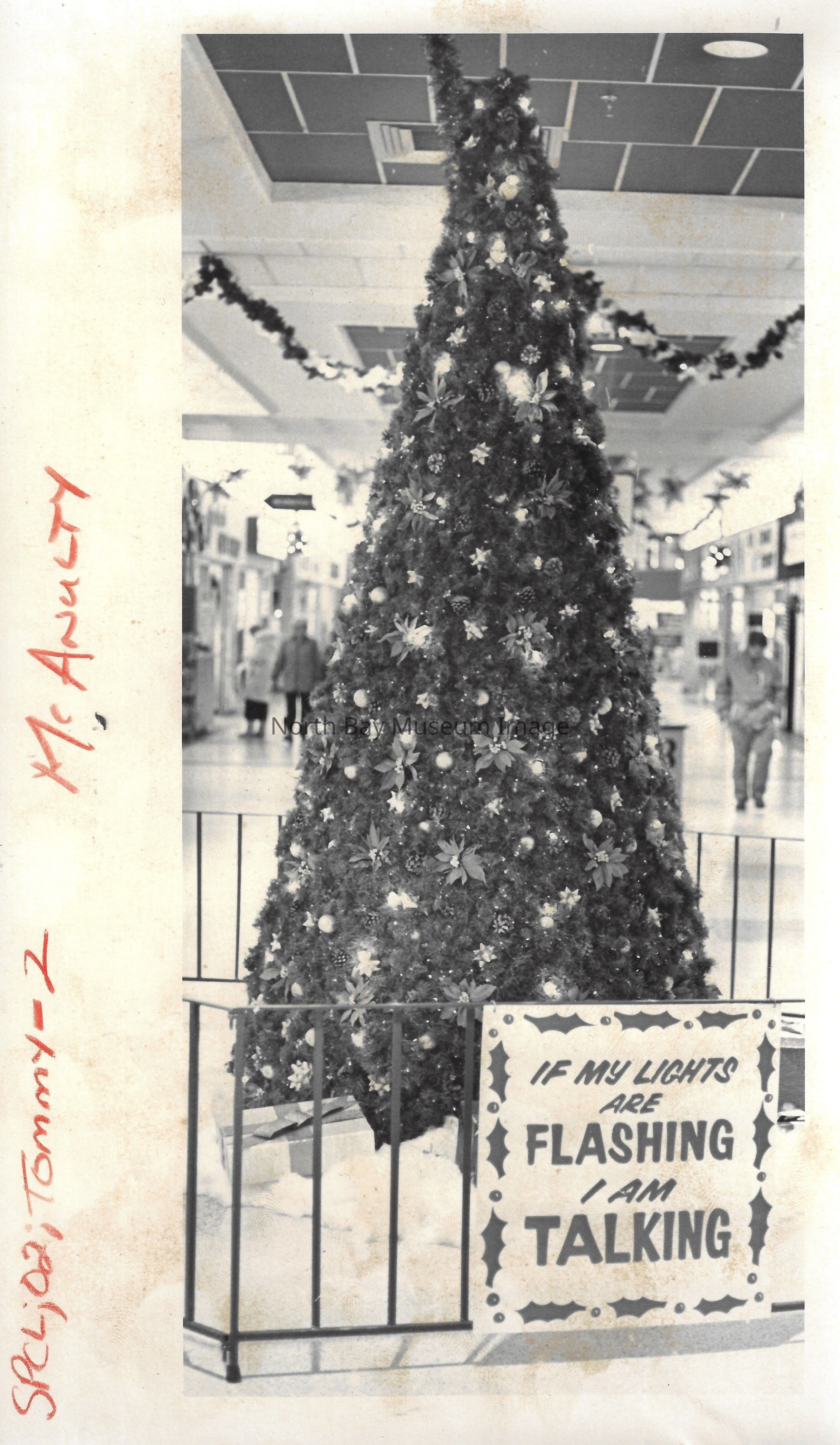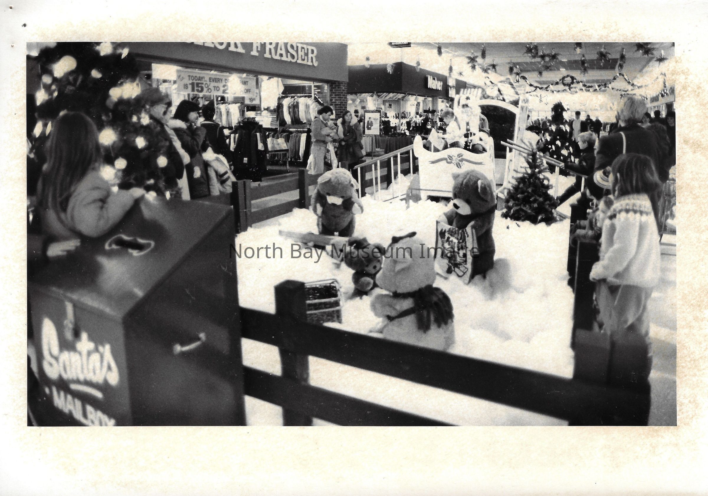 General photos of mall fountain and christmas decorations. Photos of stores in North Bay Mall including North Bay Lighting, Records on Wheels, Smart Set, Reitman's, Gallenkamp shoes, Woolco, Cinemas Champlain, Happy Hour, K Mart, Royal Bank, Polar Camera Centre, Samuel's Cafe, People's Jewellers, A&P, Dapper Don, Suzy Shier and C.J.'s Hobbies.Date(s) of Creation