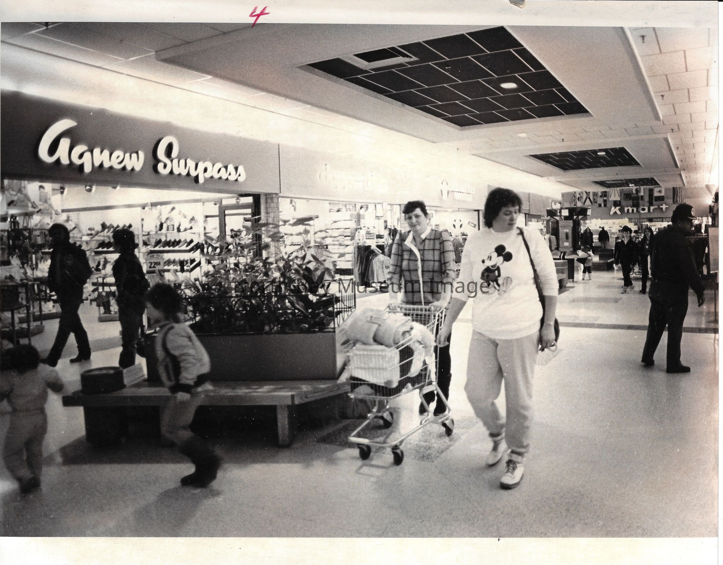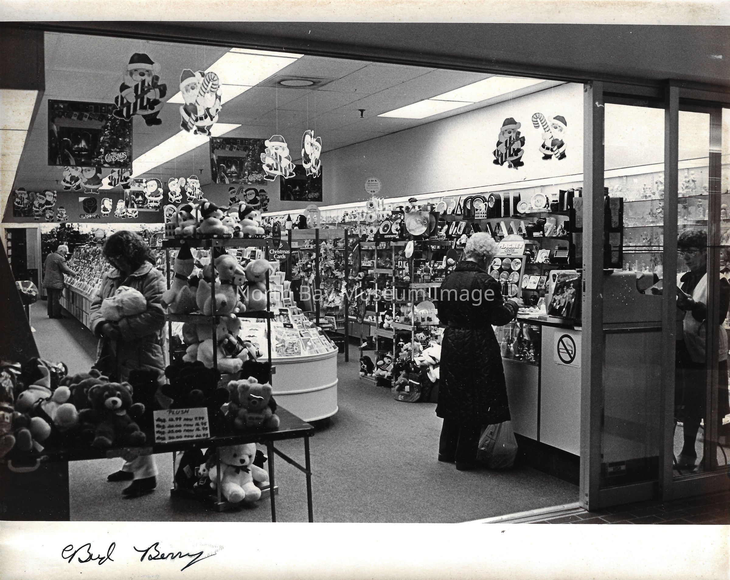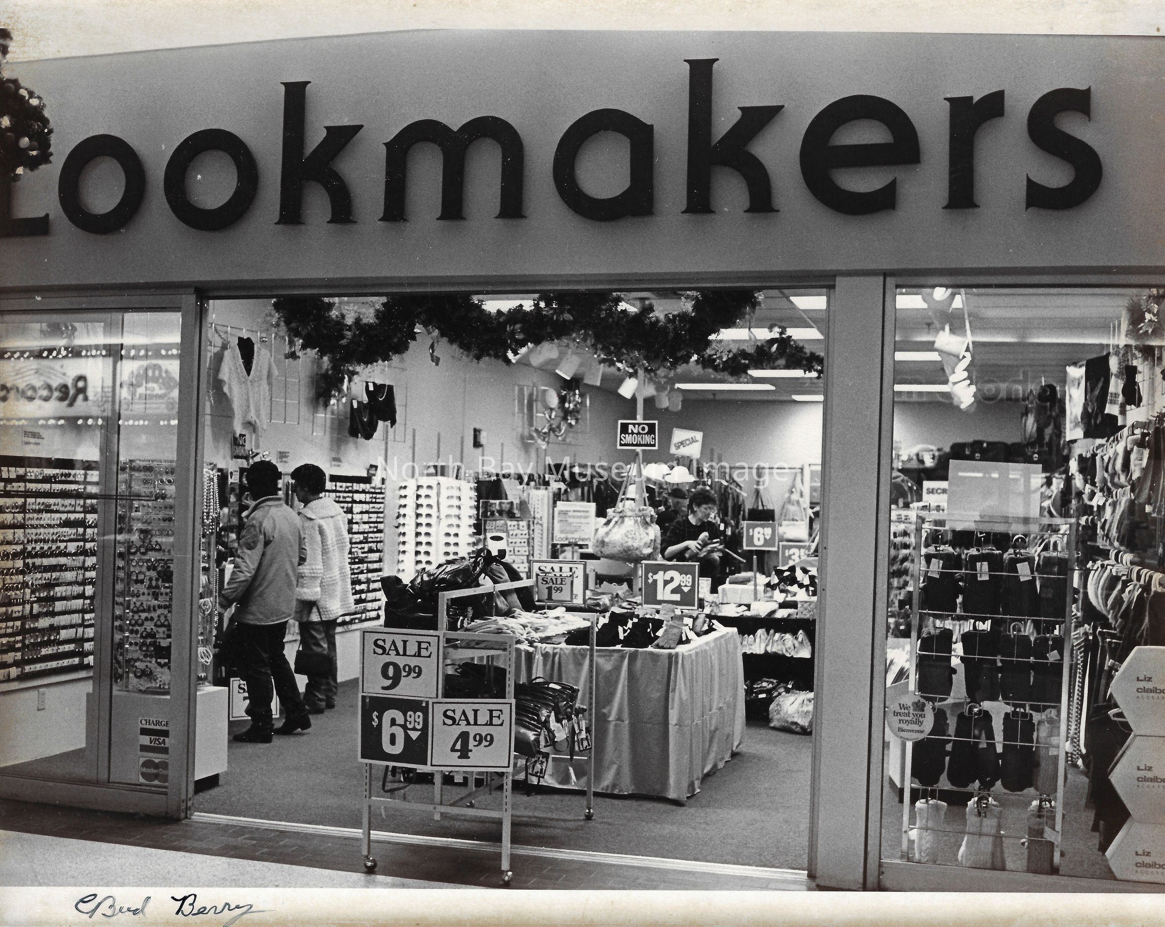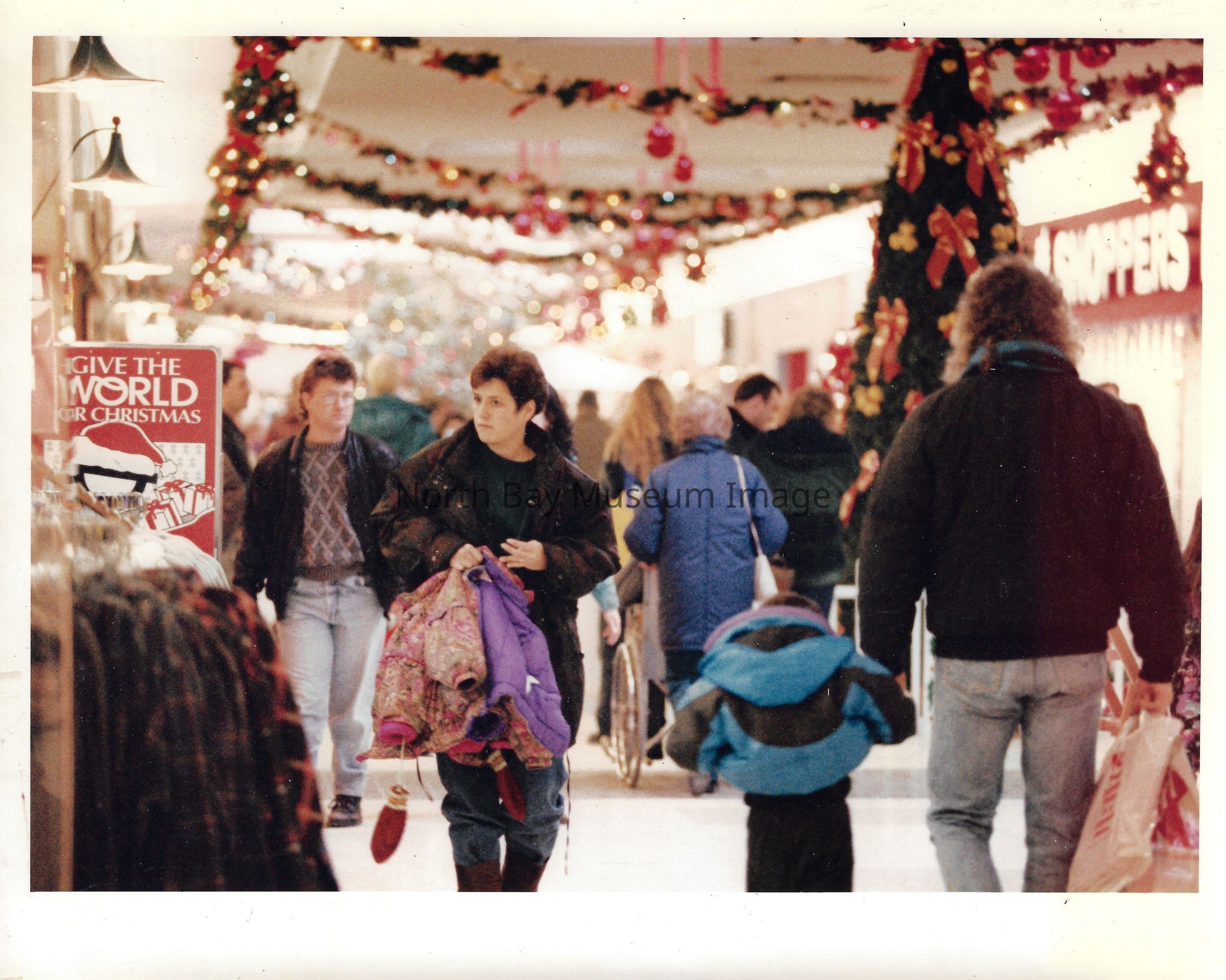 General photos of mall fountain and christmas decorations. Photos of stores in North Bay Mall including North Bay Lighting, Records on Wheels, Smart Set, Reitman's, Gallenkamp shoes, Woolco, Cinemas Champlain, Happy Hour, K Mart, Royal Bank, Polar Camera Centre, Samuel's Cafe, People's Jewellers, A&P, Dapper Don, Suzy Shier and C.J.'s Hobbies.Date(s) of Creation