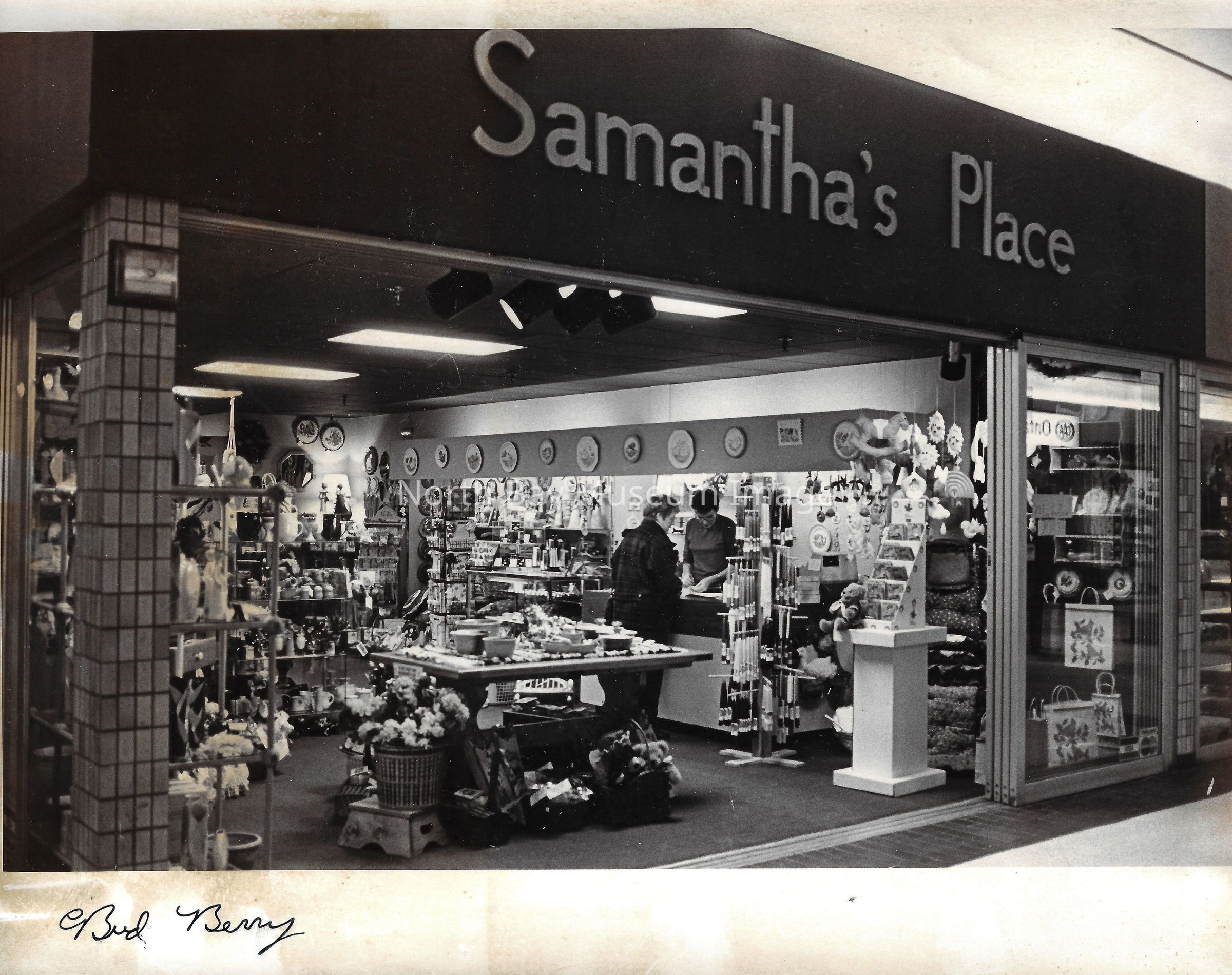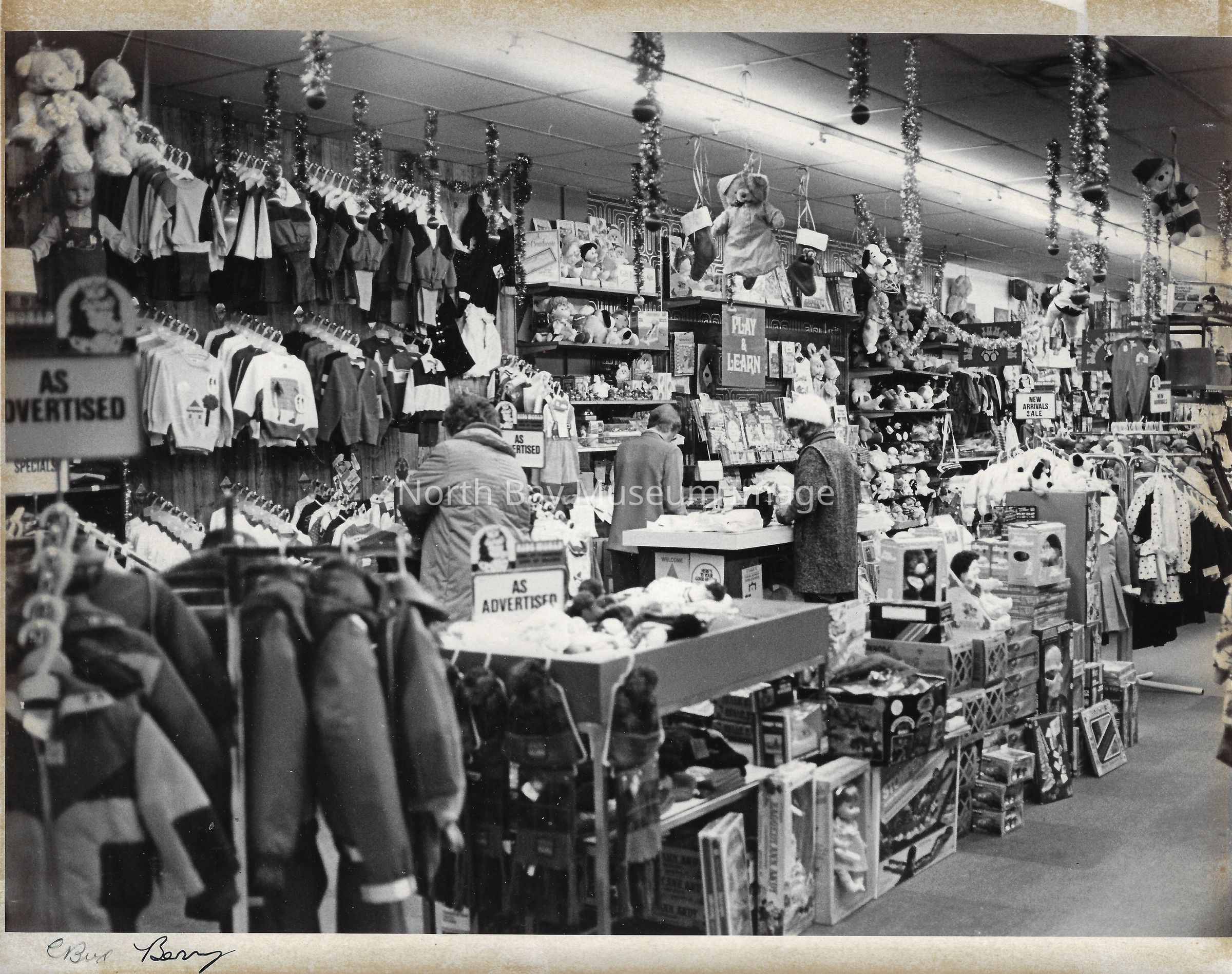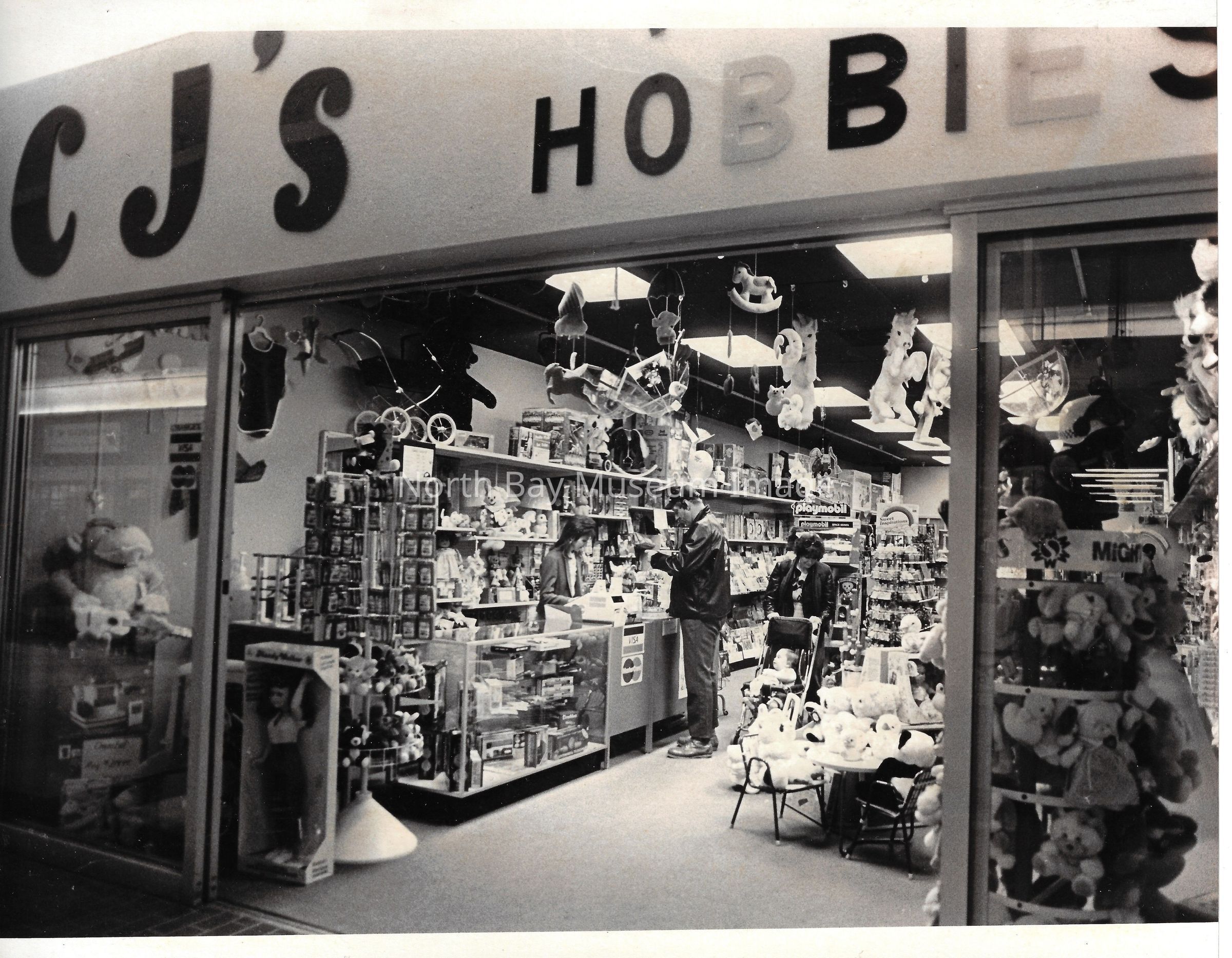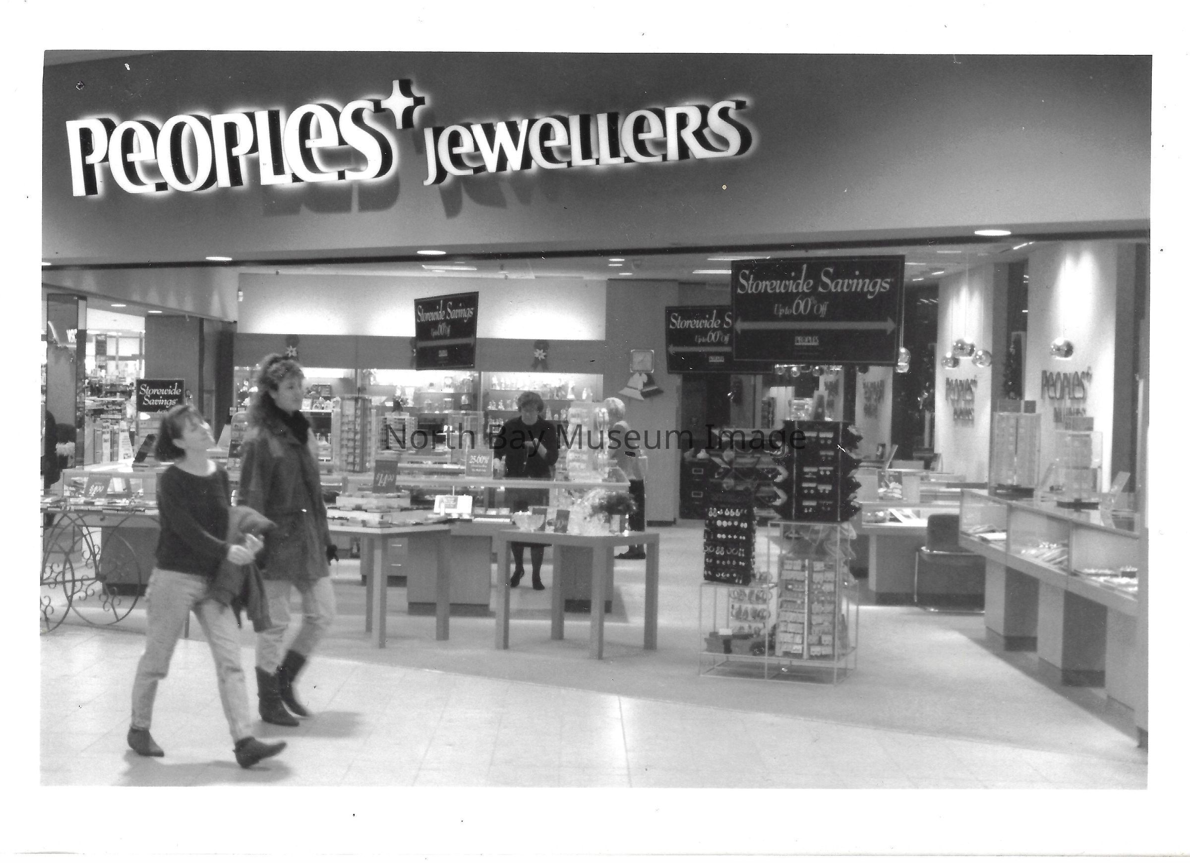 General photos of mall fountain and christmas decorations. Photos of stores in North Bay Mall including North Bay Lighting, Records on Wheels, Smart Set, Reitman's, Gallenkamp shoes, Woolco, Cinemas Champlain, Happy Hour, K Mart, Royal Bank, Polar Camera Centre, Samuel's Cafe, People's Jewellers, A&P, Dapper Don, Suzy Shier and C.J.'s Hobbies.Date(s) of Creation