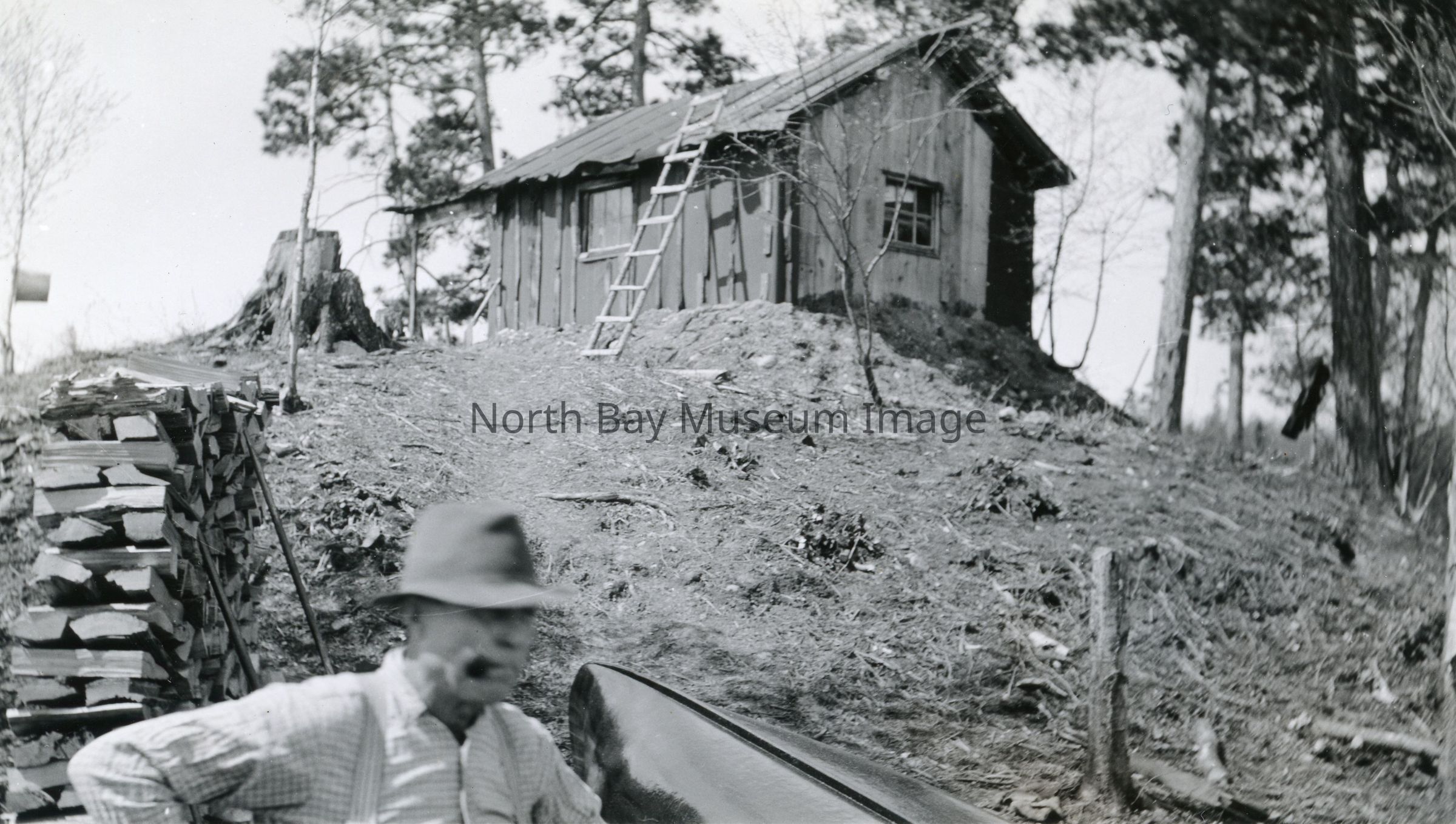 Black and white photograph of wooden shack on hill, woodpile, canoe and a man in the foreground, part of Gordon Collection.
